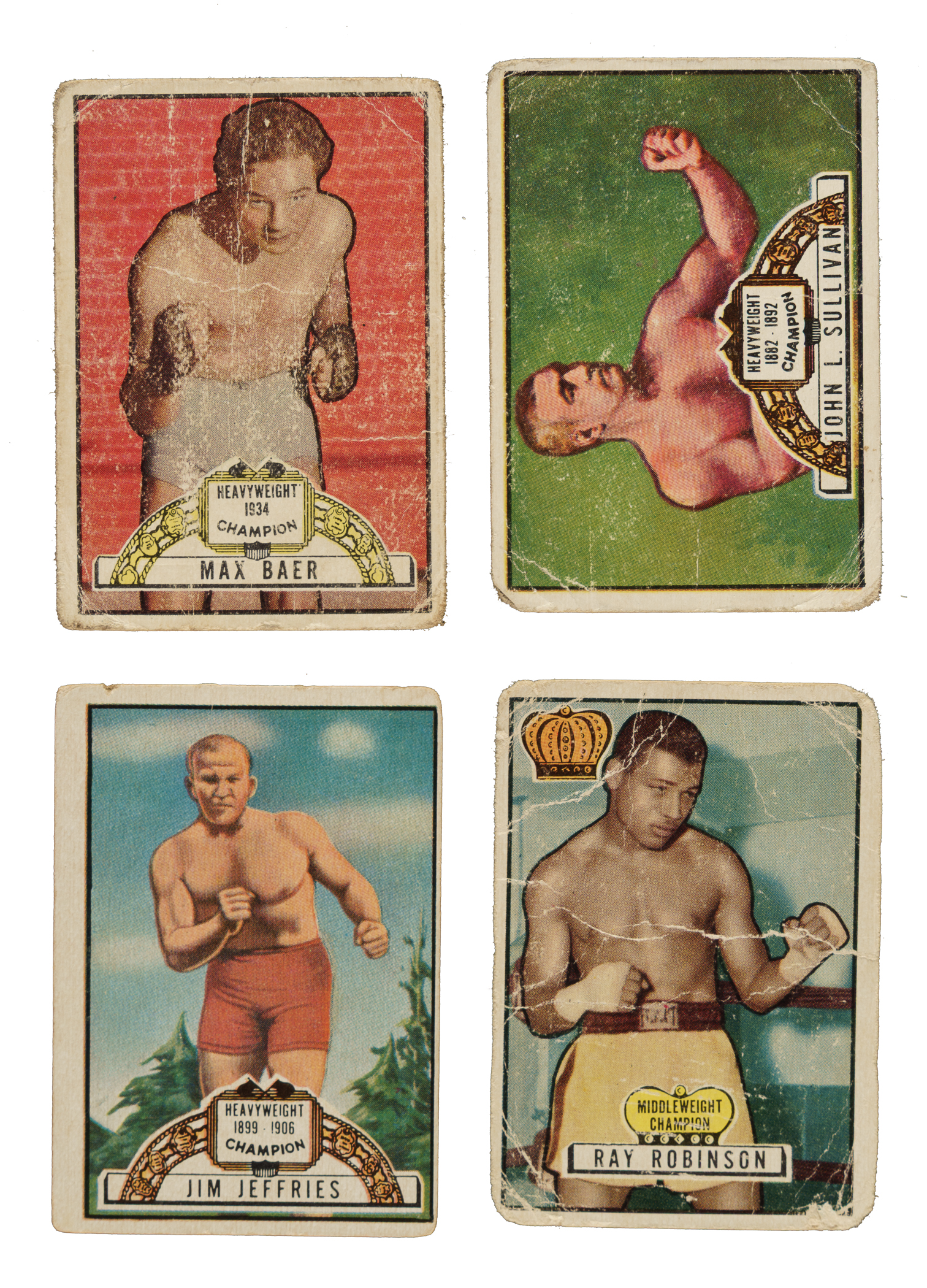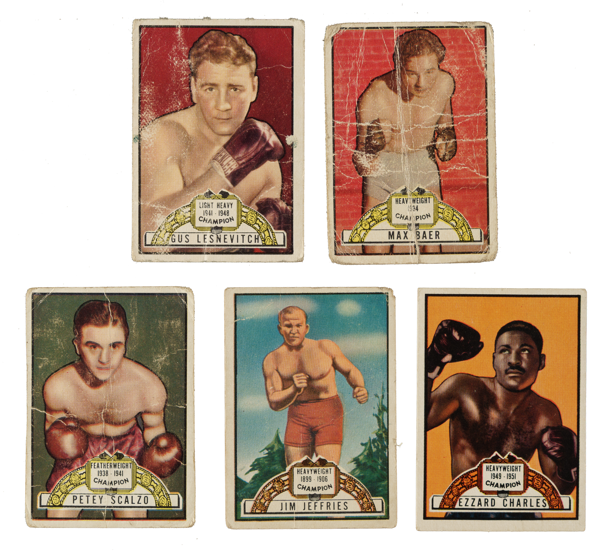 Near-complete set (86 out of 96) of Topps "Ringside" plus 41 duplicates. Topps' first attempt at boxing cards was the 96-card "Ringside" boxing series issued in 1951. The exceptional artwork and the inclusion of boxing greats from all eras, such as Rocky Marciano, John Sullivan, Gene Tunney, Joe Louis, and Ray Robinson, among others, has always made this set one of boxing-card collecting's premier issues. Topps apparently found much greater success with baseball and football. This is confirmed both by the relative scarcity of "Ringside" cards, and the fact that this was the only Topps boxing set ever issued. The production quality of this issue, however, is equal or superior to that of all early 1950s bubble-gum cards issued by Topps or Bowman. Missing the following ten cards for completion: #15, 24, 32 Marciano, 34, 35, 39, 49 Murphy, 56 Gans, 88 Louis, and 95 Tunney. Condition is 36% Gd to Vg (including a few Vg-Ex) and 64% Pr to Fr. Keys: #1 Lesnevitch (Pr), two 11 Baer (both Pr), 27 Scalzo (hand cut from advertising panel, otherwise Pr), 43 Robinson (Pr), two 54 Jeffries (Gd and Fr), 69 Sullivan (Pr), and 96 Charles (Gd). A presentable medium- to lower-grade collection of this classic 1950s Topps issue. Total: 127 cards (near set of 86 plus 41 duplicates). The size/weight of this item requires that there will be an additional shipping charge for this lot.