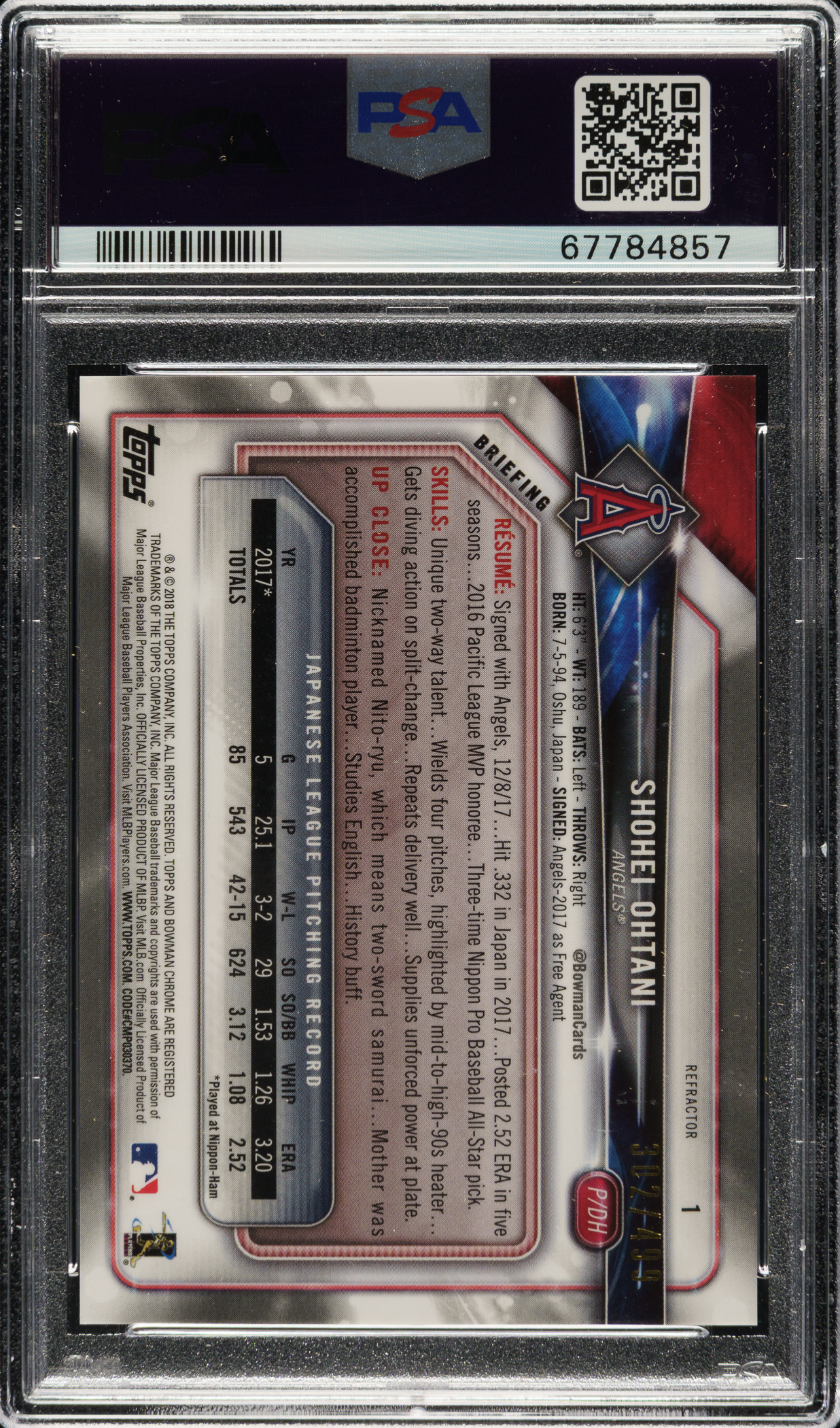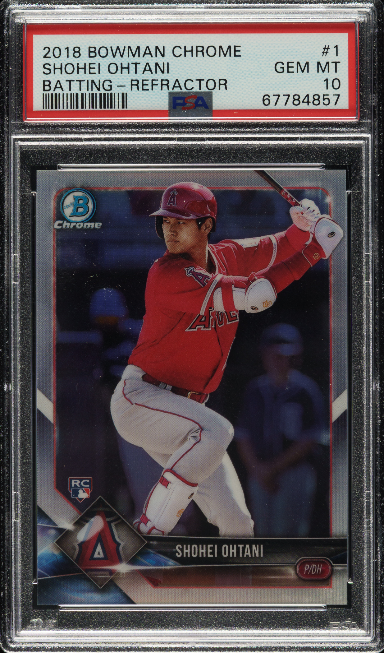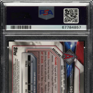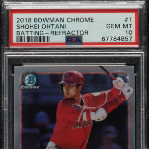 Graded GEM MINT 10 by PSA. Exceptional example of Shohei Ohtani's 2018 Bowman Chrome Batting Refractor rookie card. The card bears a "302/499" limitation number on the front. A multiple-time MVP who has astonished fans as both a dominant hitter and elite pitcher, Ohtani is widely viewed as one of the greatest and most unique talents the sport has ever seen. A spectacular rookie-card example of this prodigious superstar.