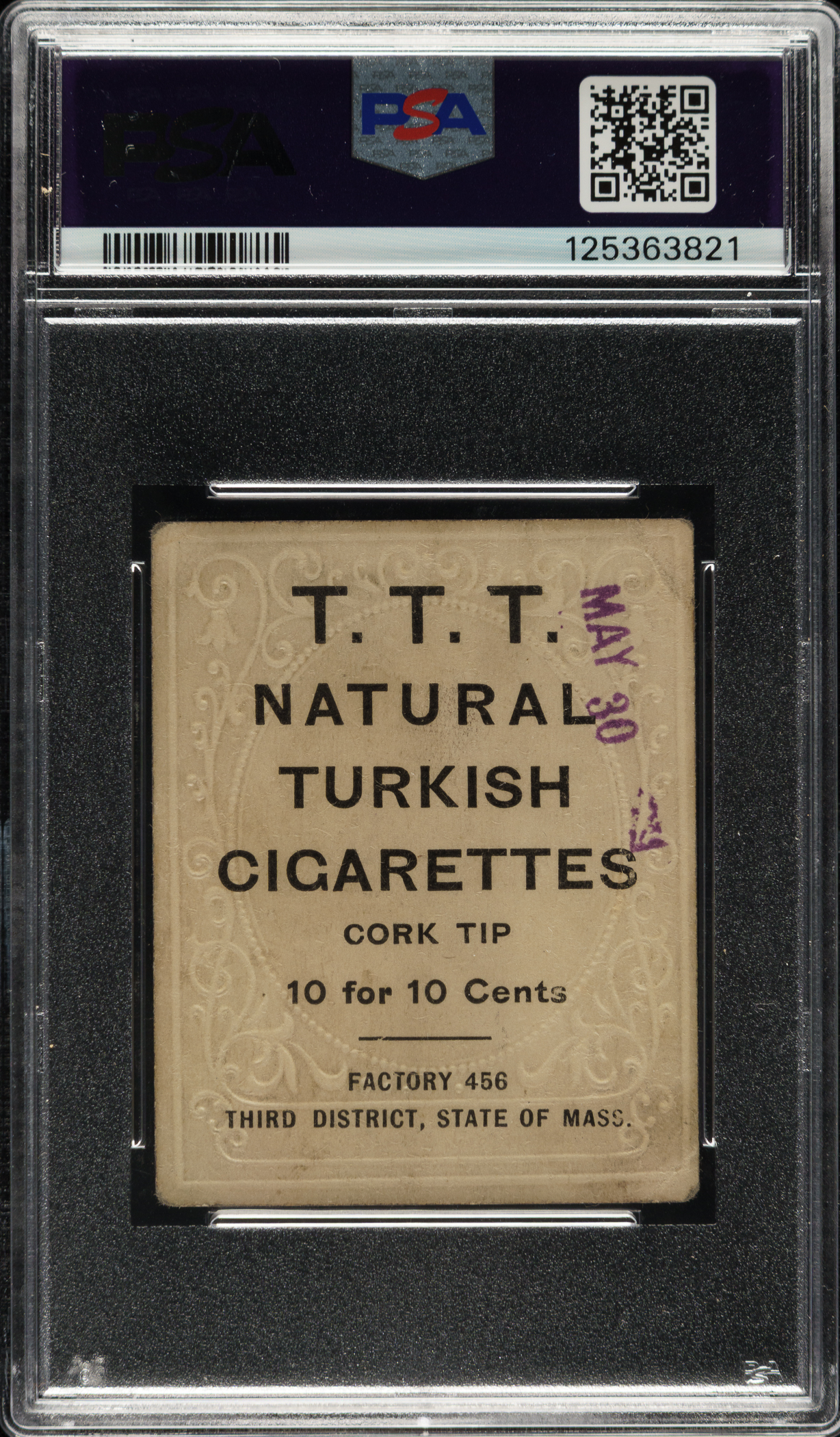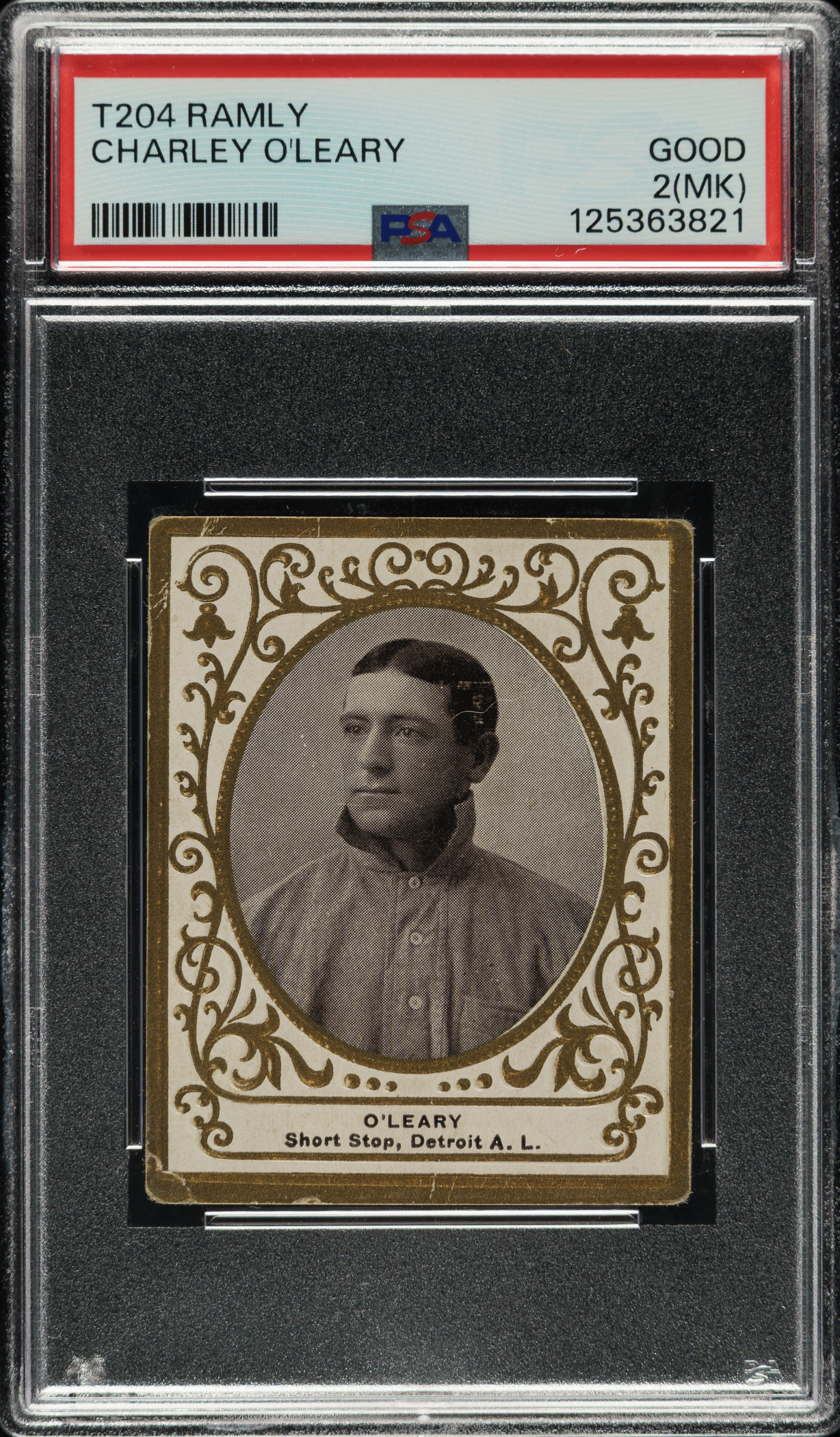 Graded GOOD 2 (MK) by PSA. T204 Ramly "T.T.T. Cigarettes" advertising card of Charley O'Leary (Detroit Tigers). All T.T.T. backs are extremely rare. The important T.T.T. back is mostly clean with bold black text and a purple ink stamp, hence the "MK" qualifier.