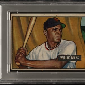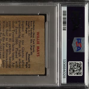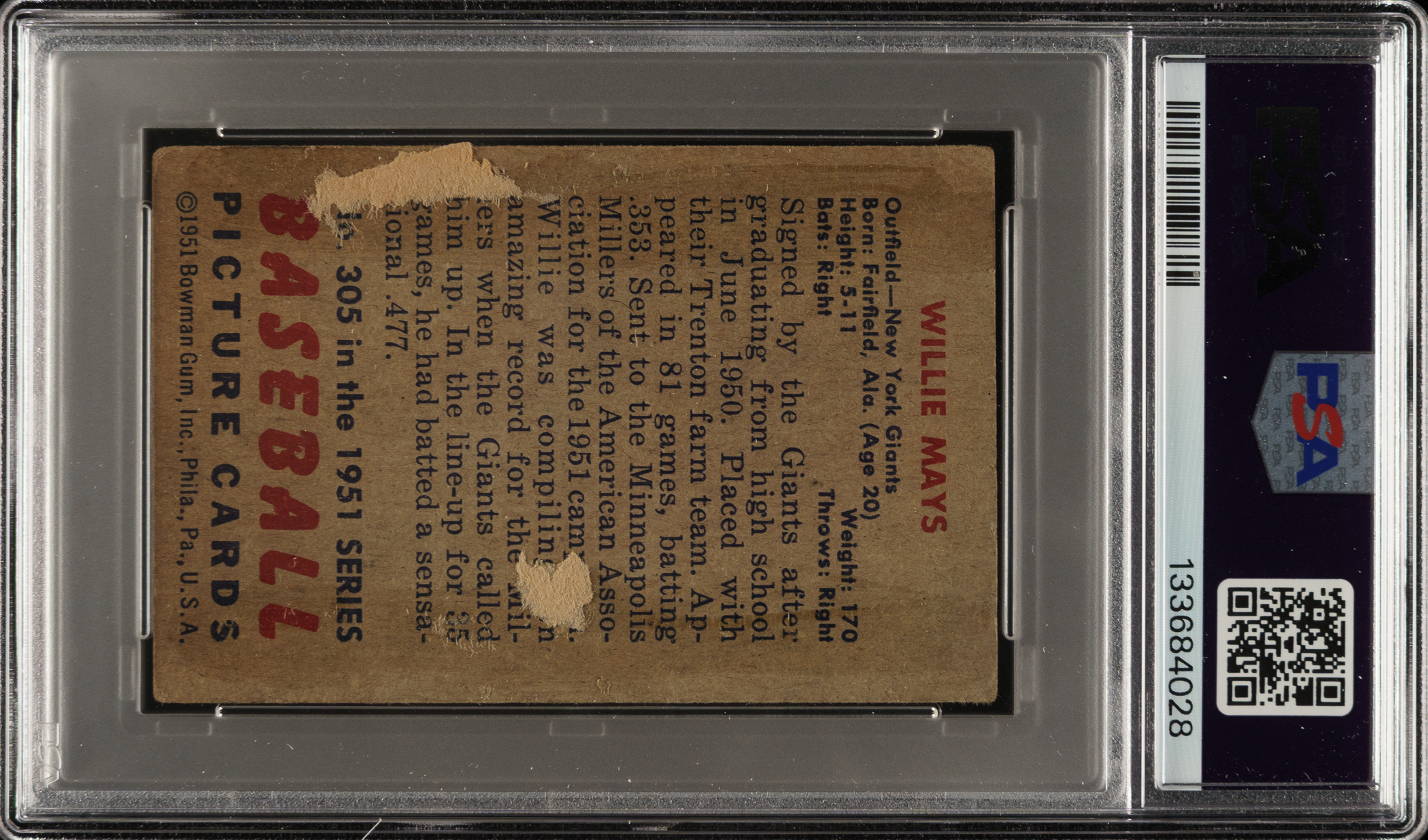Classic example of Willie Mays' rookie card, one of the most important of all 1950s bubble-gum cards. In addition to being one of the two key cards of the 1951 Bowman set, Mays is part of the scarce high-number series of the set (#253-324). Graded POOR 1 by PSA largely due to a staple hole near the bottom border and two spots of paper residue on the reverse. Despite these flaws, this remains a very attractive low-grade example of the 1951 Bowman Willie Mays rookie, which has long been recognized as one of collecting's most iconic cards, especially among postwar cards.