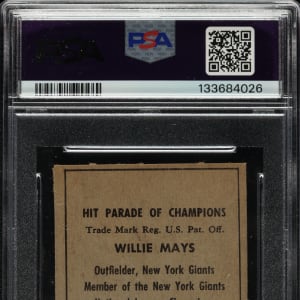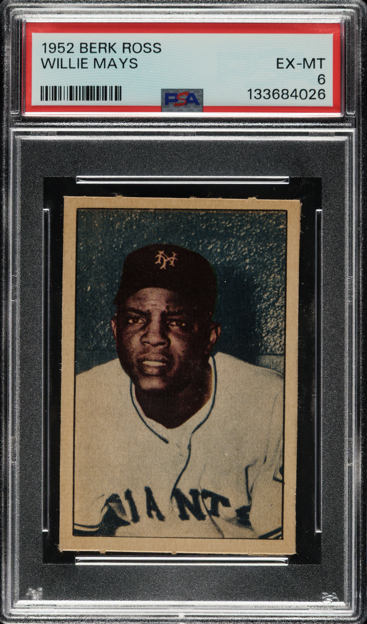 Graded EX-MT 6 by PSA. Outstanding example of New York Giants Hall of Famer Willie Mays from the 1952 Berk Ross set. Bright and crisp with light corner wear and impressive centering. Clean reverse. This is a beautiful example worthy of a high-quality 1952 Berk Ross set, New York Giants, or Willie Mays collection.