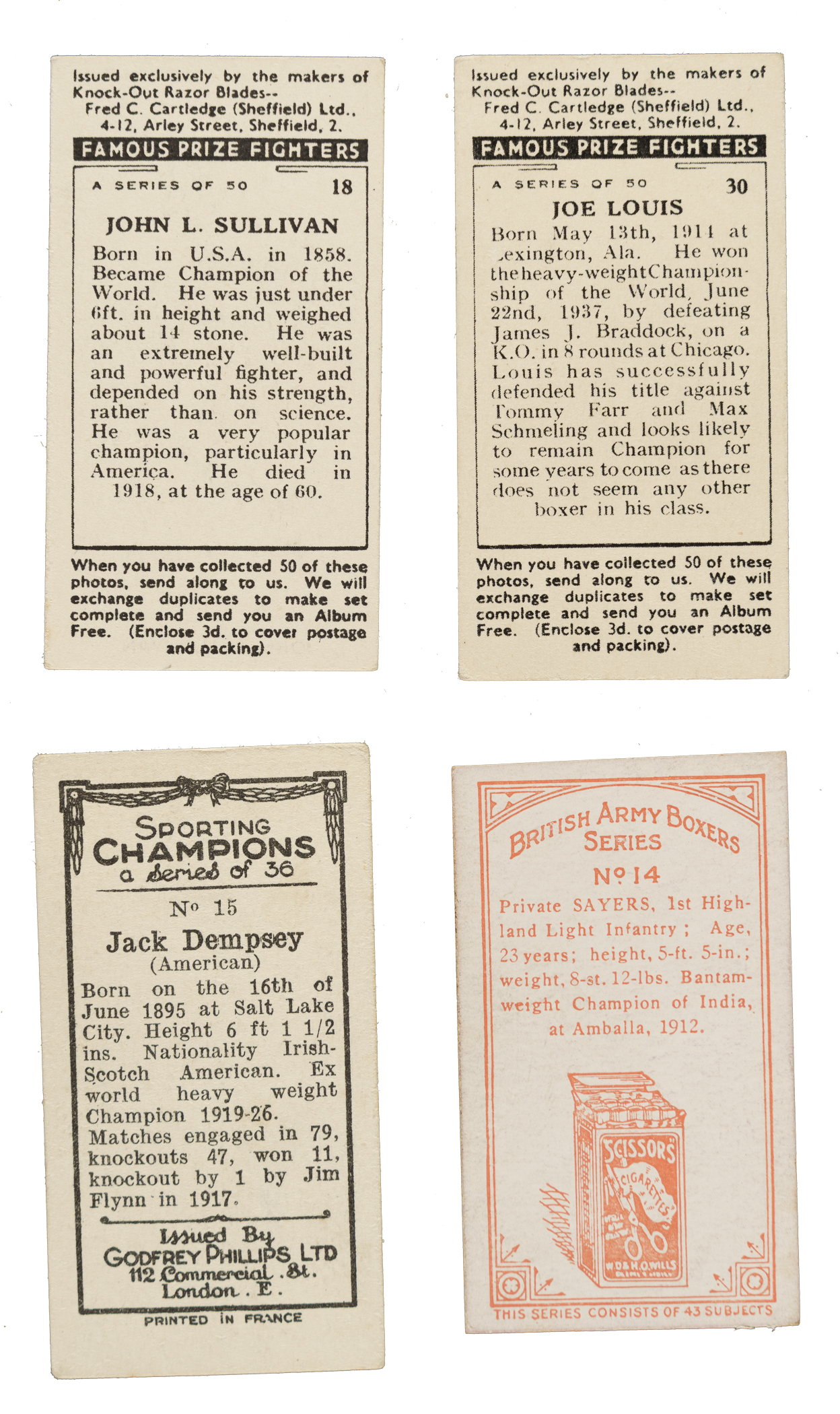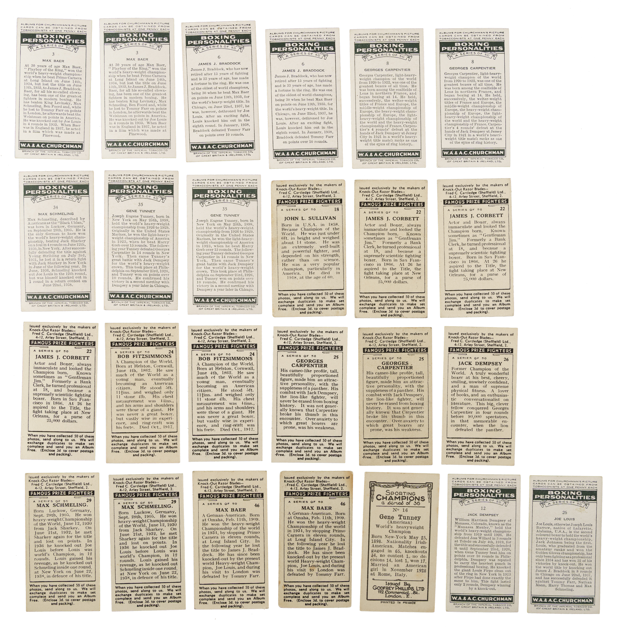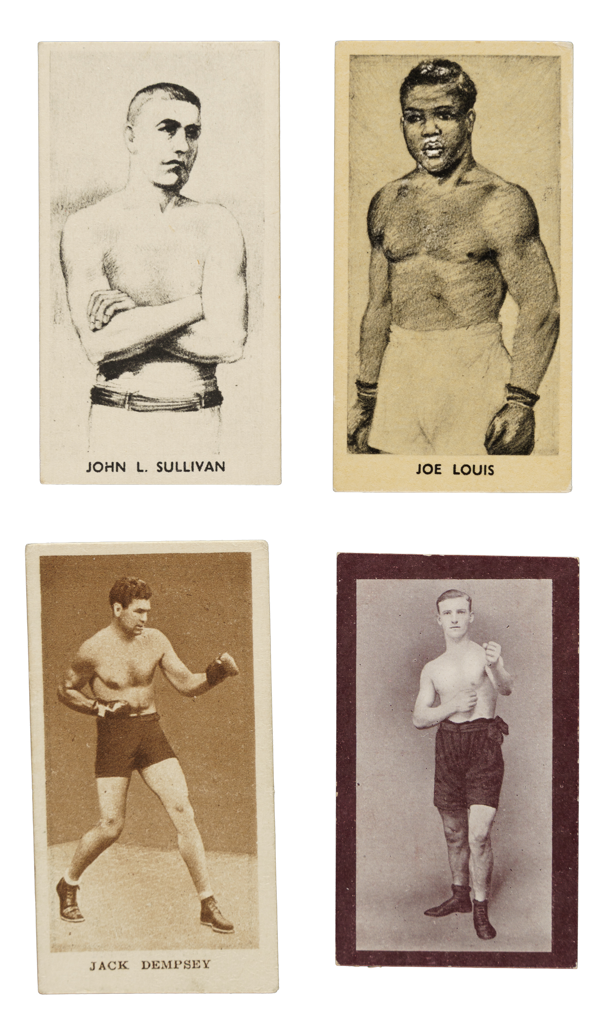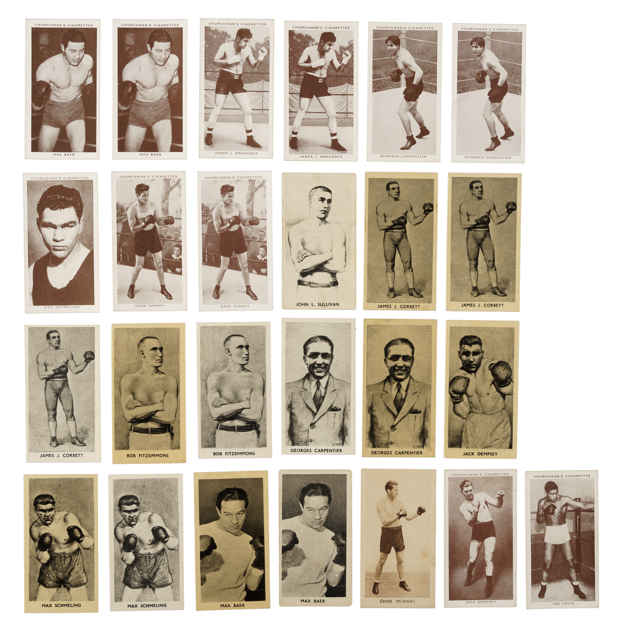 Collection of one hundred sixty-two vintage boxing cards from six classic series, spanning the years 1913 to 1938. The collection is highlighted by numerous Hall of Famers, including James Jeffries, Gene Tunney, Jack Dempsey and Joe Louis. This collection consists of the following: 1) 1913 John Player & Sons "Wrestling & Ju-Jitsu" Complete Set (25) Plus 5 Duplicates: Condition ranges from Vg to Ex (averaging Vg-Ex), with a couple lesser. 2) 1913 Wills's Scissors "British Army Boxers" Near-Complete Set (42/43) Plus 2 Duplicates: Condition ranges from Vg to Ex (averaging Ex), with a couple better and 10% lesser. Missing only #18 for completion. 3) 1924 Franklyn, Davey & Co. "Boxing" Complete Set (25): Condition ranges from Ex to Nr/Mt (averaging Ex-Mt), with a couple lesser. 4) 1929 Godfrey Phillips "Sporting Champions" Complete Set (36): Condition ranges from Vg to Ex-Mt (averaging Vg-Ex/Ex), with a couple lesser and one that measures small). Keys: #15 Dempsey (Vg+) and 16 Tunney (Vg-Ex+). 5) 1938 W. A. & A. C. Churchman "Boxing Personalities" (12 cards): Two #3 Baer (Ex-Mt and Vg-Ex), two 6 Braddock (Ex and Vg+), 7 Carnera (Vg-Ex), two 8 Carpentier (Ex and Vg-Ex), 12 Dempsey (Vg-Ex), 26 Louis (Vg+), 34 Schmeling (Ex), and two 35 Tunney (Ex and Vg). 6) 1938 F.C. Cartledge "Famous Prize Fighters" (15 cards): Condition ranges from Vg to Ex (averaging Vg-Ex), with three better. Includes the following: Two #18 Sullivan, three 22 Corbett, two 24 Fitzsimmons, two 25 Carpentier, 26 Dempsey (Ex), two 29 Schmeling, 30 Louis (Vg+), and two 46 Baer. Total: 162 cards. The size/weight of this item requires that there will be an additional shipping charge for this lot.