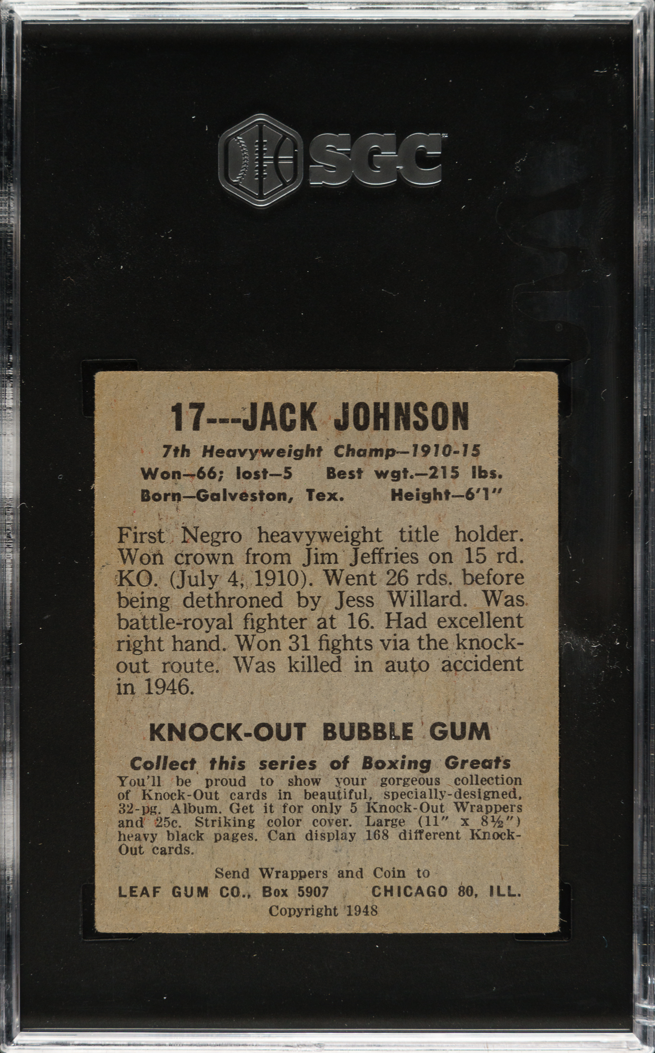 Lot # 3260: 1948 Leaf Boxing #17 Jack Johnson SGC VG/EX+ 4.5