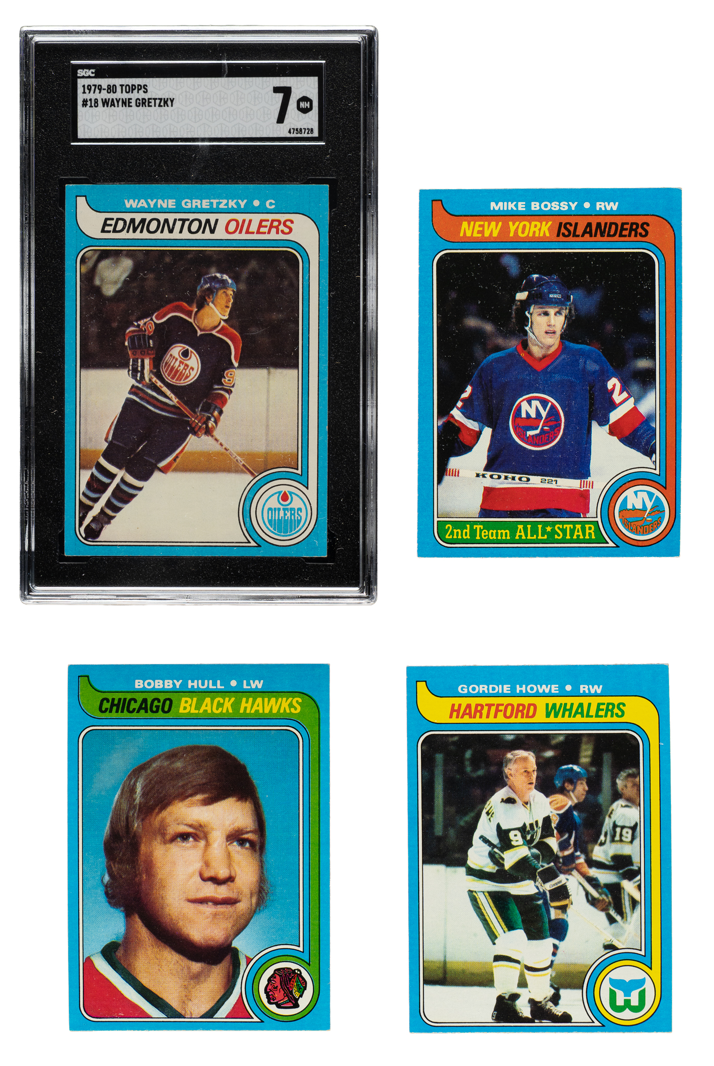 Presented is a complete set of 1979-1980 Topps hockey cards highlighted by the rookie card of Hall of Famer Wayne Gretzky. Condition is 5% Nr/Mt, 81% Ex to Ex-Mt, and 14% Vg to Vg-Ex. Keys: #18 Gretzky RC (SGC NM 7, submitted by REA), 150 Dryden (Ex), 175 Howe (Ex), 185 Hull (Ex), 230 Bossy (Ex), and 261 New NHL Entries Checklist (Vg-Ex). This is a very attractive and consistent mid-grade complete set of this popular hockey-card issue, with a solid Near Mint example of the key Gretzky rookie card. Total: 264 cards.