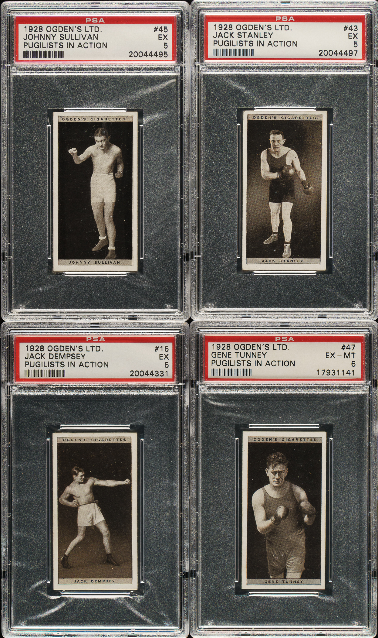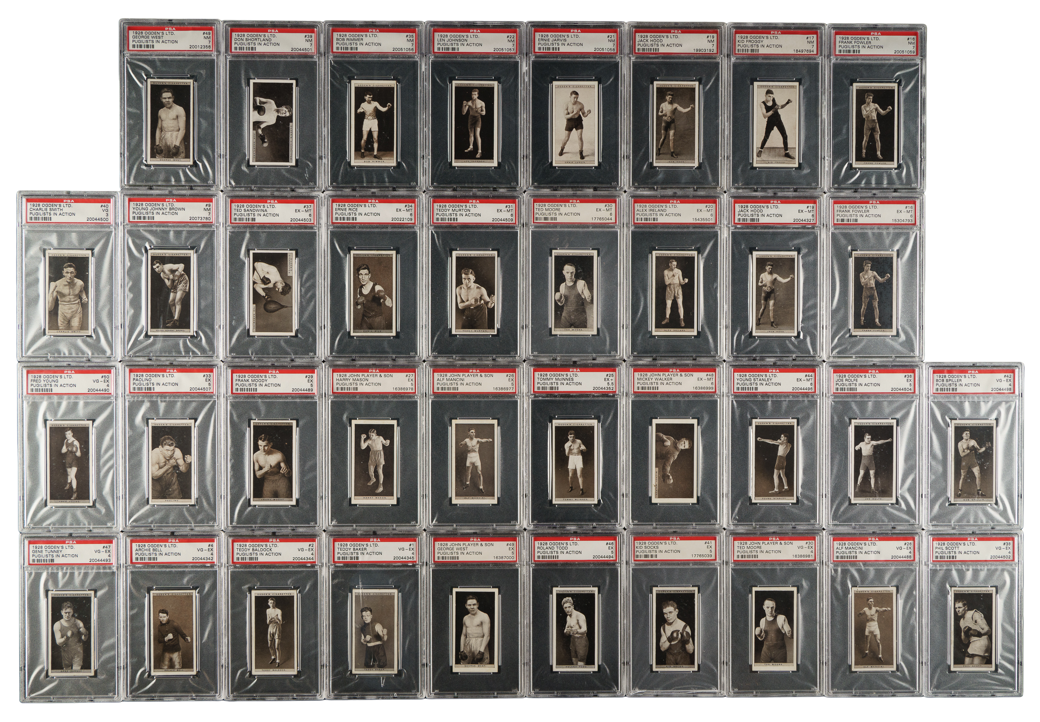 Partial set (35/50) of 1928 Ogden's "Pugilists In Action" cards, featuring boxing Hall of Famers Gene Tunney and Jack Dempsey. Each card has been graded and encapsulated by PSA. PSA Grading Composite: NM 7 (9 cards): #9, 16, 17, 19, 21, 22, 35, 39, and 49. EX-MT 6 (10 cards): #16, 19, 20, 30, 31, 34, 37, 44, 47 Tunney, and 48 Walker. EX+ 5.5 (1 card): #25. EX 5 (11 cards): #15 Dempsey, 26, 27, 29, 33, 36, 41, 43, 45, 46, and 49. VG-EX 4 (9 cards): #1, 2, 4, 26, 30, 38, 42, 47 Tunney, and 50. VG 3 (1 card): #40. Total: 41 cards (partial set plus 6 duplicates). The size/weight of this item requires that there will be an additional shipping charge for this lot.