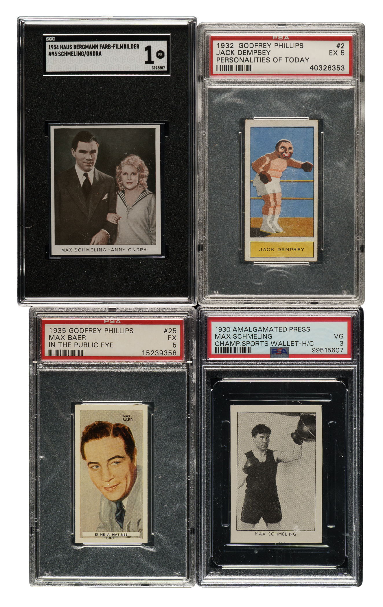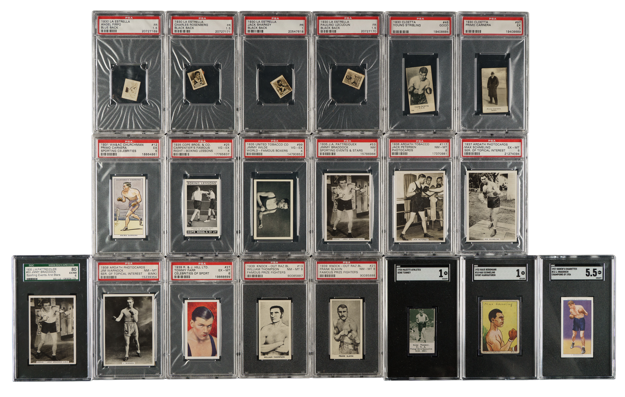 Collection of twenty-four 1930 to 1939 Ardath, W. A. A. C. Churchman, and United Tobacco boxing cards, featuring boxing Hall of Famer Jack Dempsey. Each card has been graded and encapsulated by PSA (19) or SGC (5). This collection consists of the following: 1) 1930 Mazetti Athletes (1 card): Tunney (SGC POOR 1). 2) 1930 La Estrella (4 cards): Firpo/blue back (FAIR 1.5), Rosenberg/black back (FAIR 1.5), Sharkey/black back (POOR 1), and Uzcudun/black back (FAIR 1.5). 3) 1930-1933 Cloetta (2 cards): #45 Stribling (GOOD 2) and 97 (EX 5). 4) 1930 Amalgamated Press Champion Sports Wallet (1 card): Schmeling (VG 3). 5) 1931 W. A. A. C. Churchman "Sporting Celebrities" (1 card): #12 (EX 5). 6) 1932 Godfrey Phillips Personalities of Today (1 card): #2 Dempsey (EX 5). 7) 1932 Haus Bergmann Sport Karikaturen (1 card): #10 Schmeling (SGC POOR 1). 8) 1934 Haus Bergmann Farb Filmbilder (1 card): #95 Schmeling/Ondra (SGC POOR 1). 9) 1935 Cope Nrps. & Co. "Boxing Lessons" (1 card): #25 Carpentier's Famous Right (VG-EX 4). 10) 1935 United Tobacco Co. "World Famous Boxers" (1 card): #99 Wilde (VG-EX 4). 11) 1935 Godfrey Phillips "In the Public Eye" (1 card): #25 Baer (EX 5). 12) 1935 J. A. Pattreiouex Sporting Events and Stars (2 cards): Two #53 Braddock (NM 7 and SGC EX/NM 80). 13) 1936 Ardath Tobacco Company Photocards (1 card): #117 (NM-MT 8). 14) 1937 Ardath Tobacco Company Photocards Series of Topical Interest (1 card): Schmeling (EX-MT 6). 15) 1937 Oden's LTD. "Champions of 1936" (1 card): #12 Braddock (SGC EX+ 5.5). 16) 1938 Ardath Tobacco Company Photocards Series of Topical Interest (1 card): Warnock (NM-MT 8 MK). 17) 1938 F.C. Cartledge "Famous Prize Fighters" (2 cards): #13 Thompson (NM-MT 8) and 21 (NM-MT 8). 18) 1939 R & J Hill Celebrities of Sport (1 card): #27 (EX-MT 6). Total: 24 cards. The size/weight of this item requires that there will be an additional shipping charge for this lot.