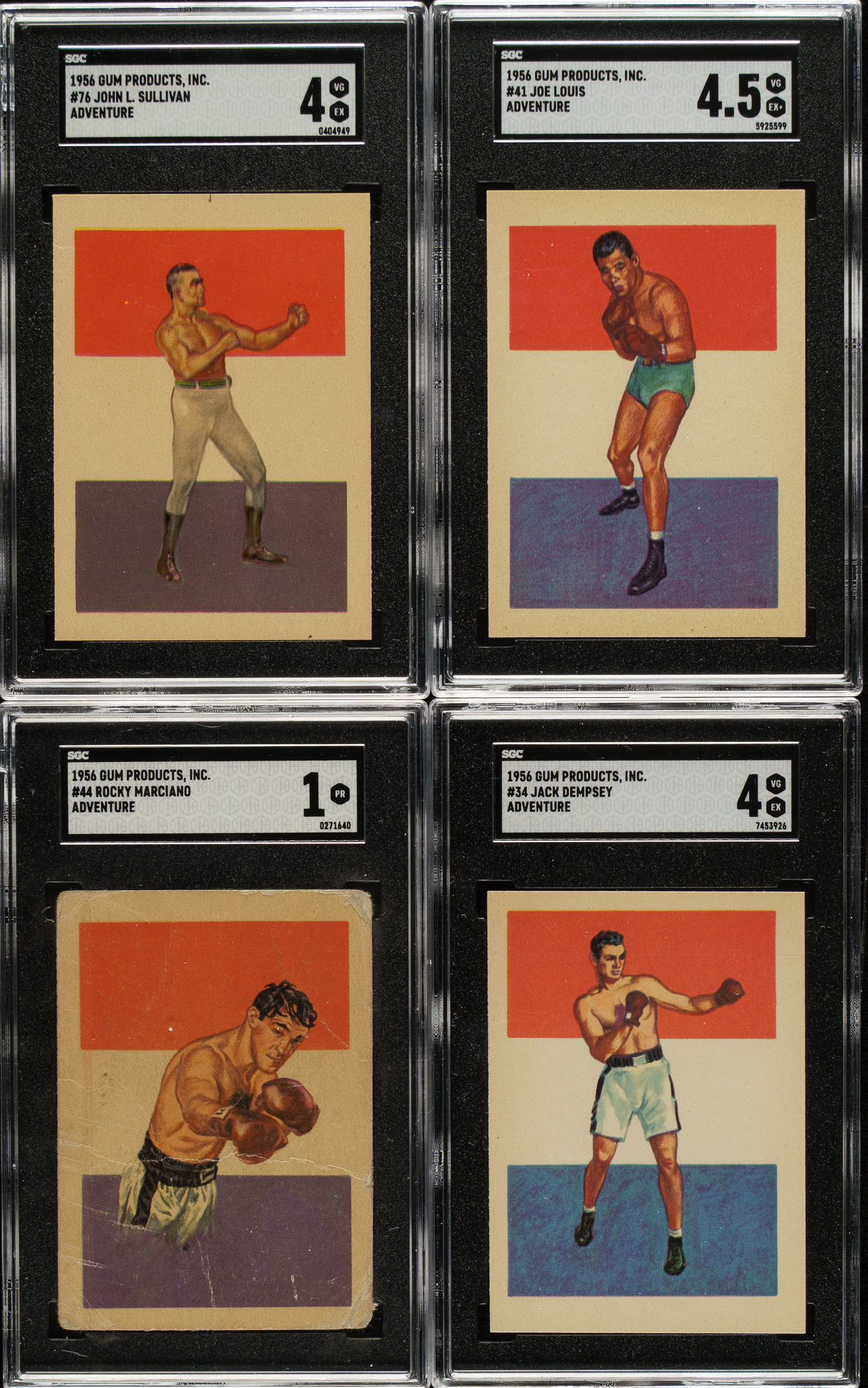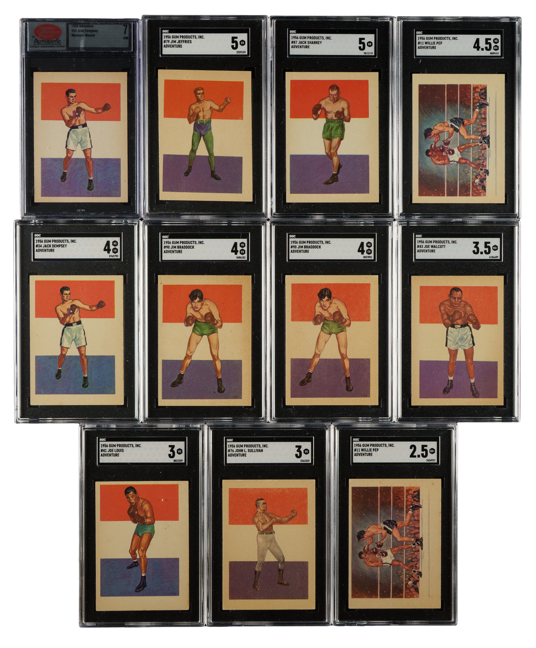 Collection of fifteen 1956 Adventure Gum Hall of Fame cards, featuring boxing Hall of Famer Rocky Marciano. Each card has been graded and encapsulated by SGC (14) or SCD (1). SGC Grading Composite: NM 7 (1 card): #34 Dempsey (SCD NM 7, REA's grade measures a little small, otherwise Ex-Mt). EX 5 (2 cards): 79 Jeffries and 87 Sharkey. VG/EX+ 4.5 (2 cards): #11 Pep and 41 Louis. VG/EX 4 (5 cards): Two #34 Dempsey, 76 Sullivan, and two 90 Braddock. VG+ 3.5 (1 card): #43 Walcott. VG 3 (2 cards): #41 Louis and 76 Sullivan. GOOD+ 2.5 (1 card): #11 Pep. POOR 1 (1 card): #44 Marciano. Total: 15 cards. The size/weight of this item requires that there will be an additional shipping charge for this lot.