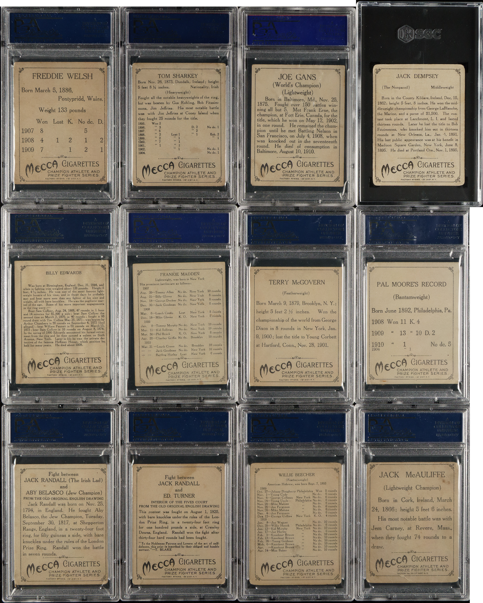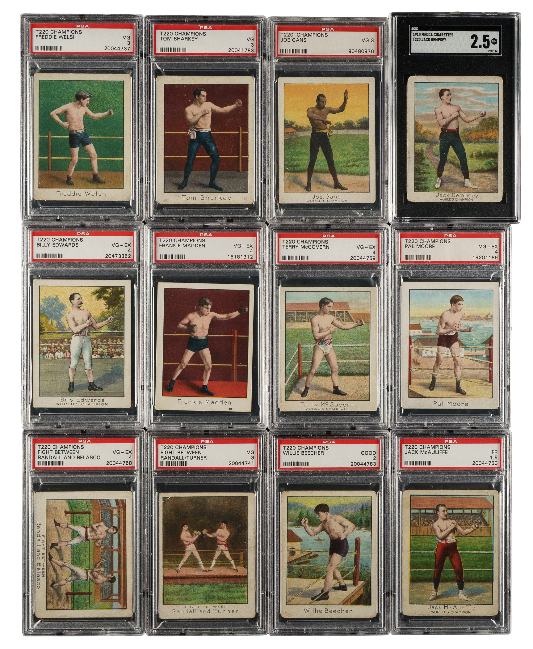 Collection of twelve 1910 T220 Mecca Champions boxing cards, featuring boxing Hall of Famer Jack Dempsey. Each card has been graded and encapsulated by PSA (11) or SGC (1). PSA Grading Composite: VG-EX 4 (5 cards): Edwards, Madden, McGovern, Moore, and Randall/Belasco. VG 3 (4 cards): Gans, Randall/Turner, Sharkey, and Welsh. GOOD+ 2.5 (1 card): Dempsey (SGC). GOOD 2 (1 card): Beecher. FAIR 1.5 (1 card): McAuliffe. Total: 12 cards. The size/weight of this item requires that there will be an additional shipping charge for this lot.