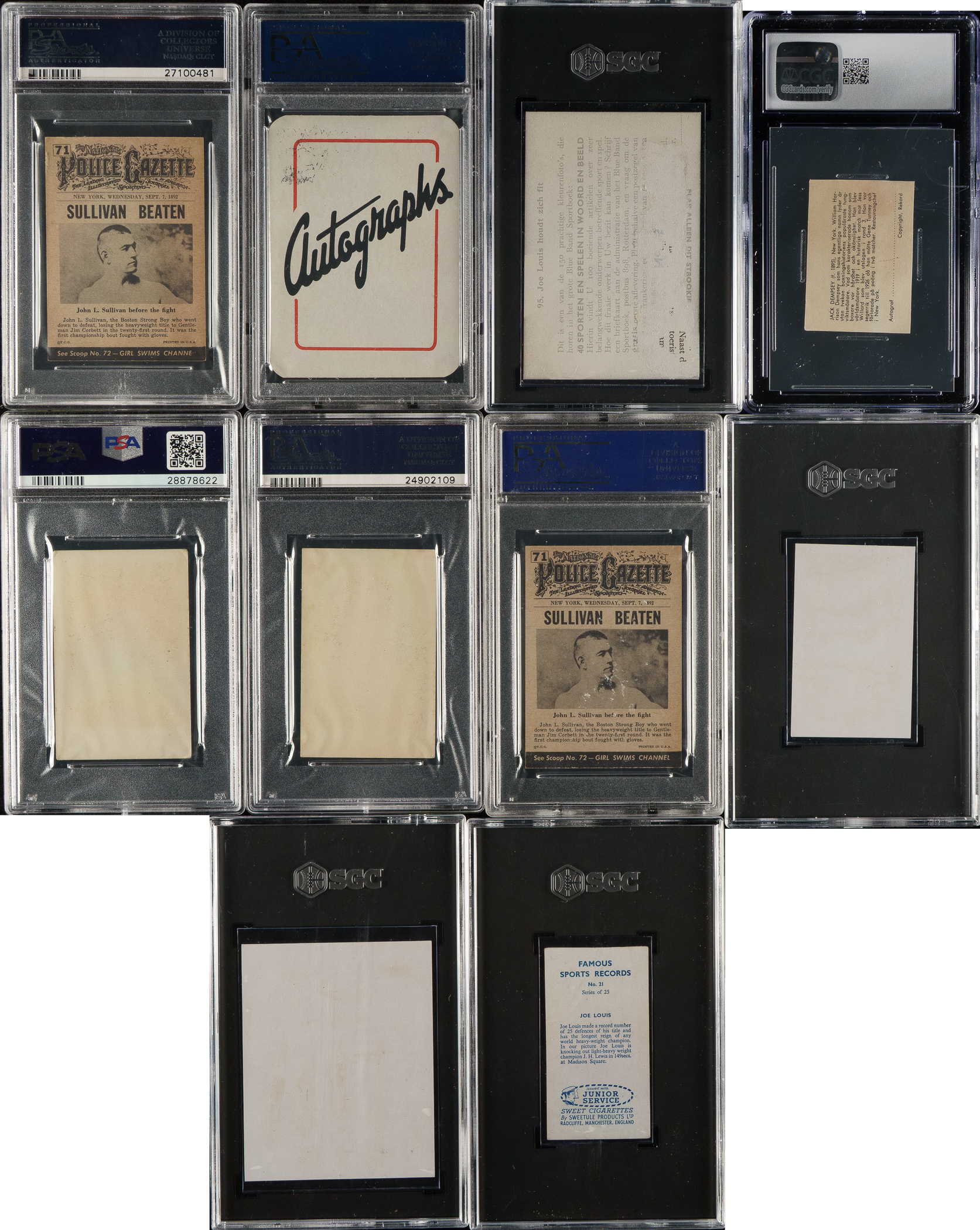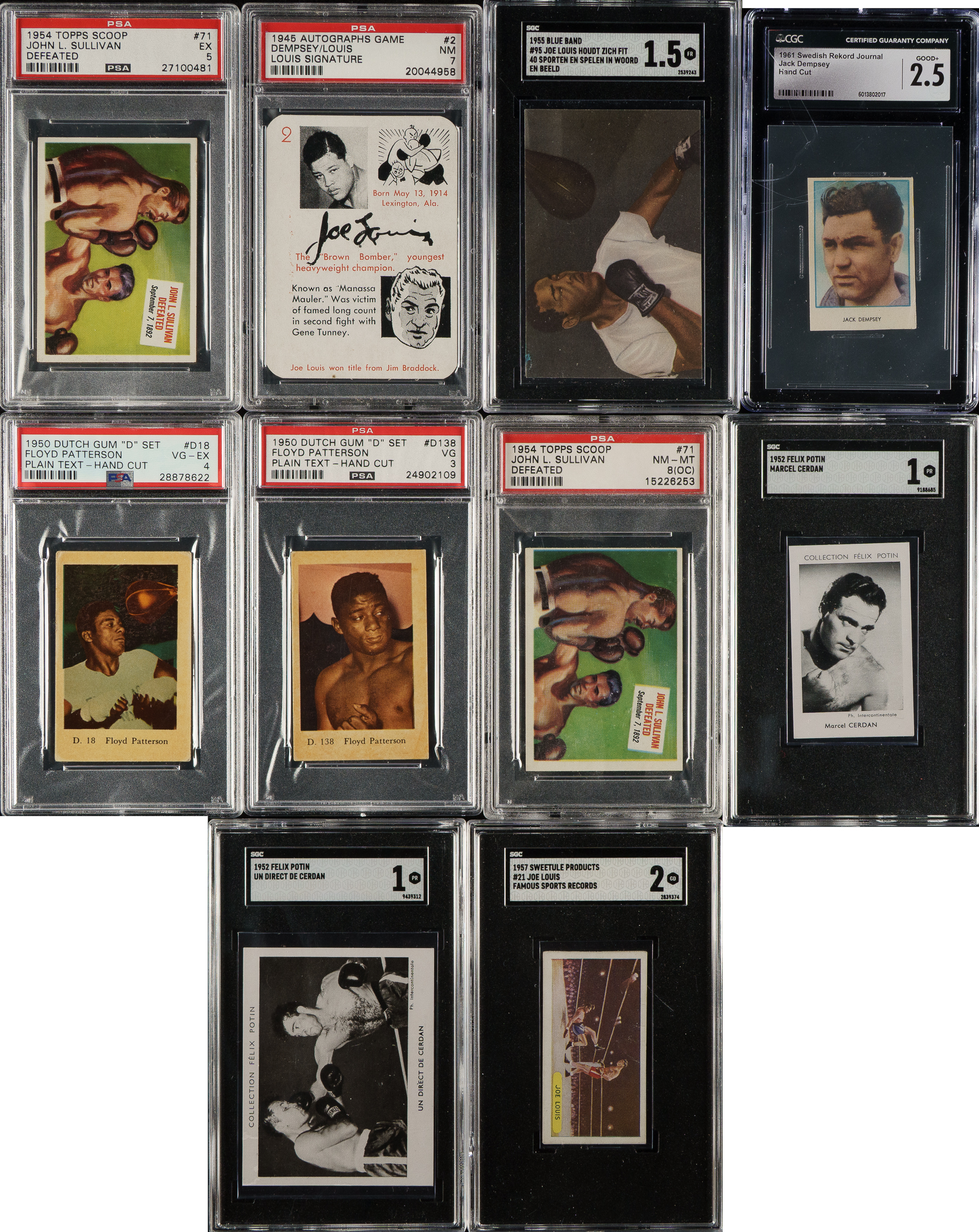 Collection of ten 1945 to 1961 Boxing Hall of Fame cards, featuring boxing Hall of Famers Joe Louis and Jack Dempsey. Each card has been graded and encapsulated by PSA (5), SGC (4), or CGC (1). This collection consists of the following: 1) 1945 Leister Autograph Game (1 card): #2 Dempsey/Louis with Louis Signature (NM 7). 2) 1950 Dutch Gum D (2 cards): #D18 Patterson (VG-EX 4) and D138 Patterson (VG 3). 3) 1952 Felix Potin (2 cards): Cerdan (SGC POOR 1) and Un Direct de Cerdan (SGC POOR 1). 4) 1954 Topps "Scoop" (2 cards): Two #71 Sullivan (NM-MT 8 OC and EX 5). 5) 1955 Blue Band (1 card): #95 Louis (SGC FAIR 1.5). 6) 1957 Sweetule Products "Sports Records - Blue Back" (1 card): #21 Louis (SGC GOOD 2). 6) 1961 Rekord Journal (1 card): Dempsey (CGC GOOD+ 2.5). Total: 10 cards. The size/weight of this item requires that there will be an additional shipping charge for this lot.