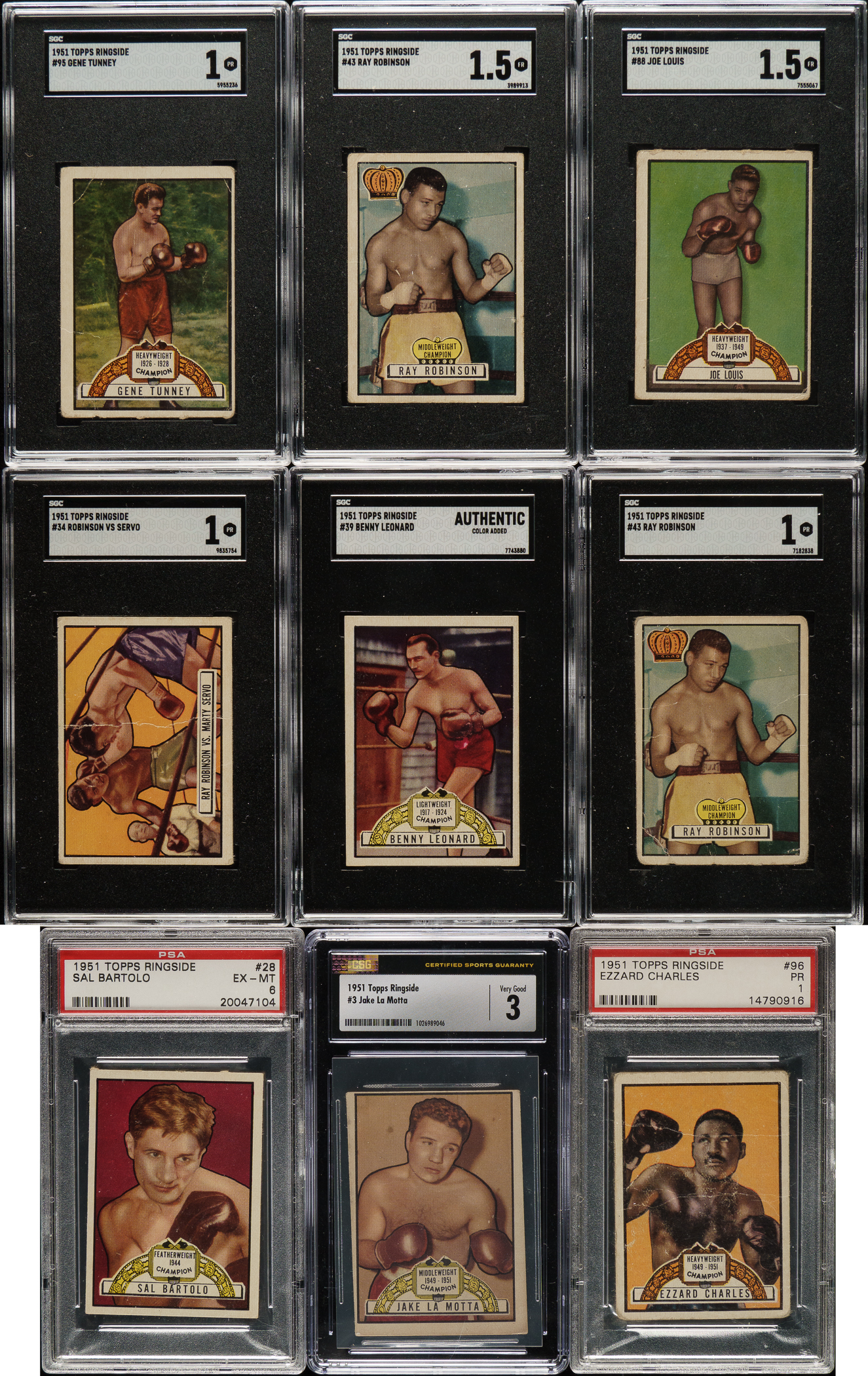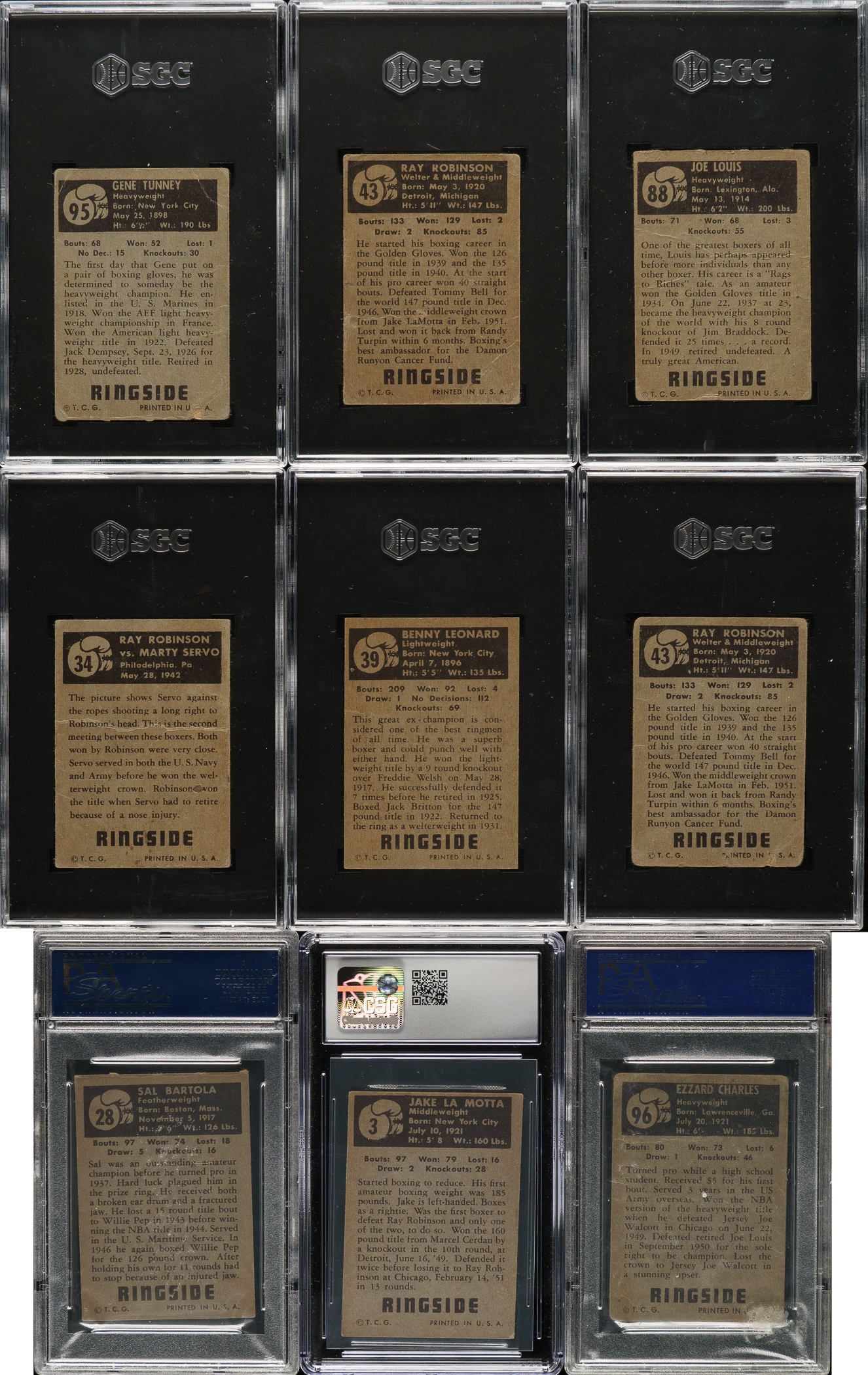 Collection of nine 1951 Topps Ringside boxing cards, featuring boxing Hall of Famer Joe Louis. Each card has been graded and encapsulated by PSA (2), SGC (6), or CSG (1). This collection consists of the following: #3 LaMotta (CSG VG 3), 28 (PSA EX-MT 6), 34 Robinson/Servo (POOR 1), 39 Leonard (Authentic), two 43 Robinson (FAIR 1.5 and POOR 1), 88 Louis (FAIR 1.5), 95 Tunney (POOR 1), and 96 Charles (PSA POOR 1). Total: 9 cards. The size/weight of this item requires that there will be an additional shipping charge for this lot.