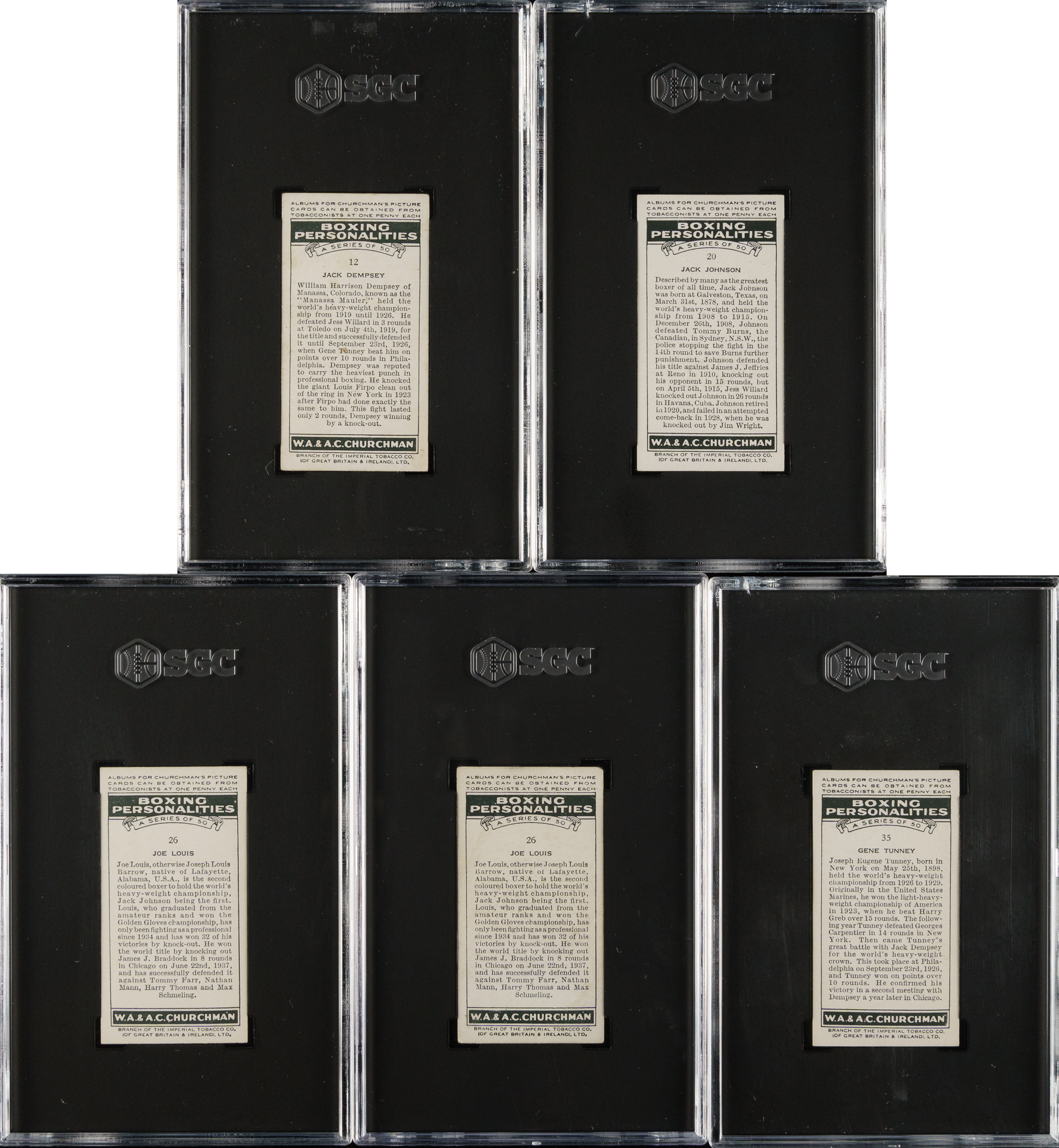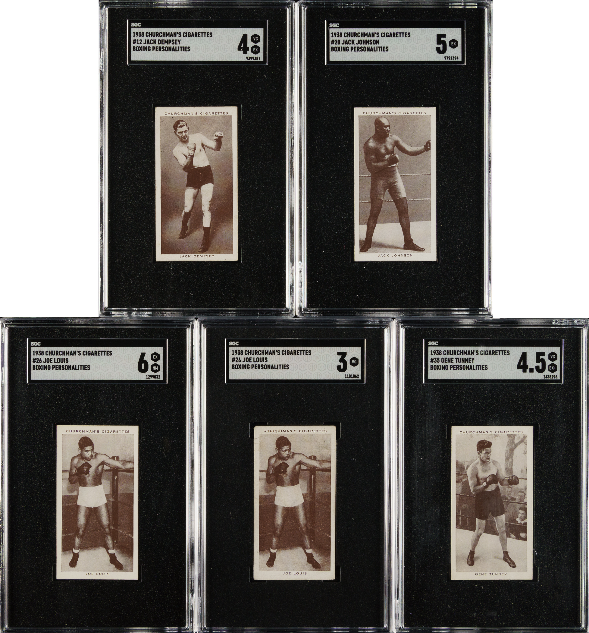 Collection of five 1938 W. A. & A. C. Churchman "Boxing Personalities" Hall of Fame boxing cards, featuring boxing Hall of Famer Jack Dempsey. Each card has been graded and encapsulated by SGC. This collection consists of the following: #12 Dempsey (VG/EX 4), 20 Johnson (EX 5), two 26 Louis (EX/NM 6 and VG 3), and 35 Tunney (VG/EX+ 4.5). Total: 5 cards.