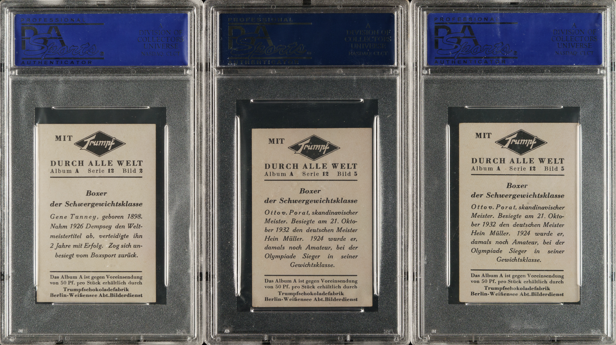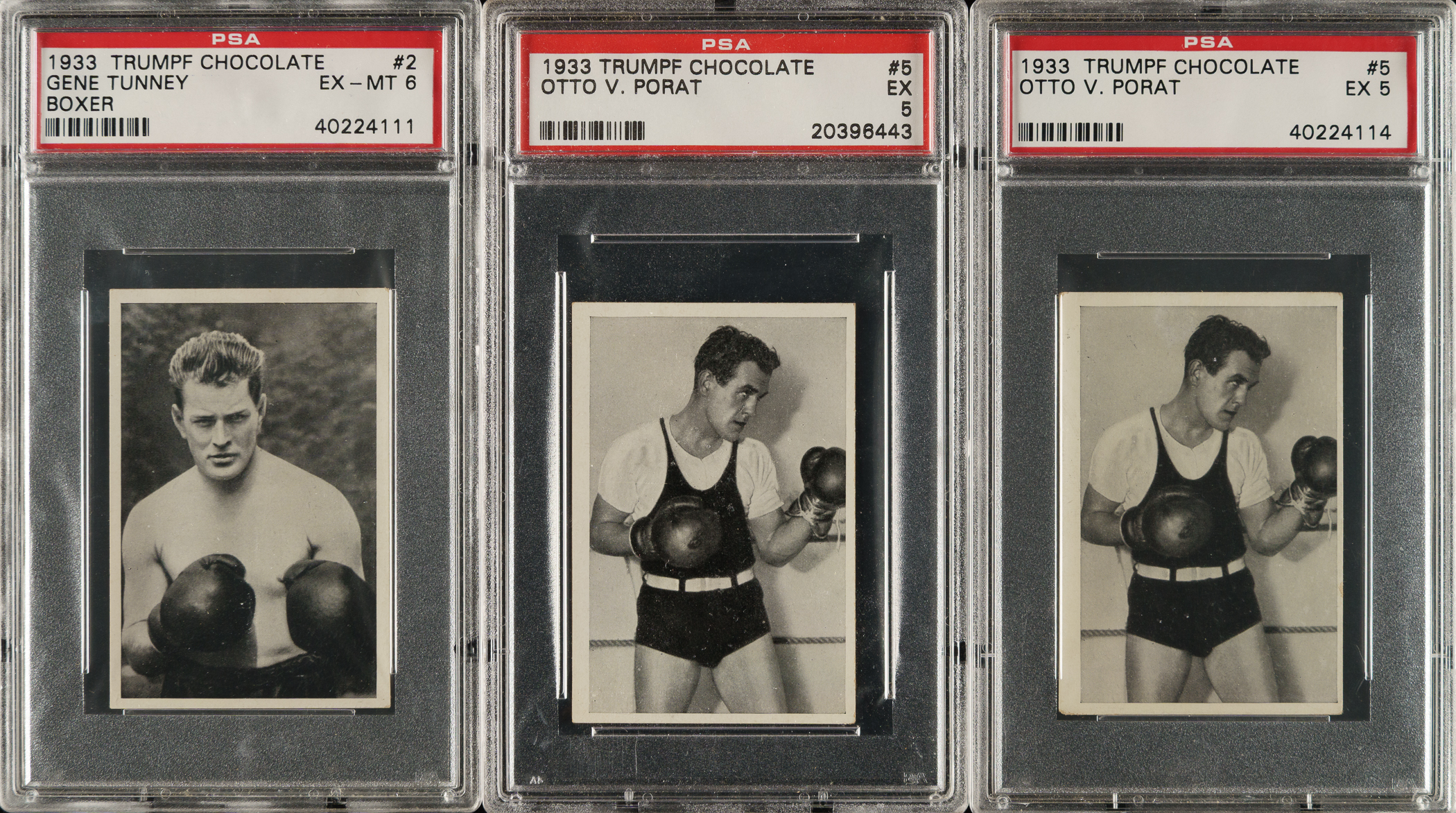 Trio of 1933 Trumpf Chocolate boxing cards, featuring boxing Hall of Famer Gene Tunney. Each card has been graded and encapsulated by PSA. This trio consists of the following: #2 Tunney (EX-MT 6) and two 5 (EX 5). Total: 3 cards.