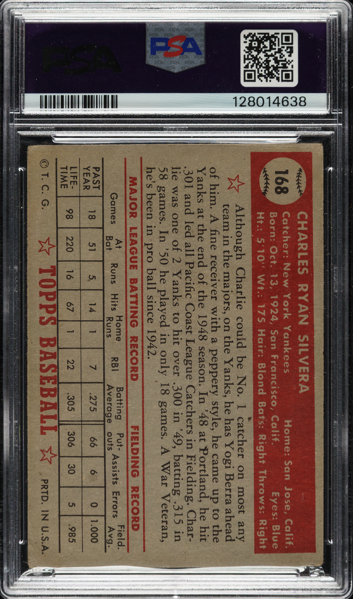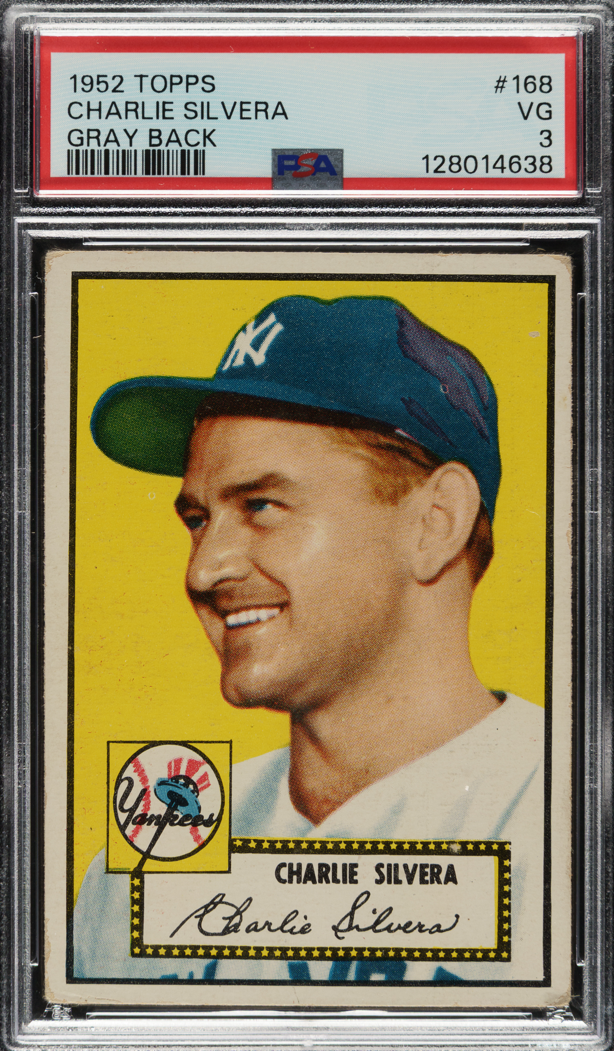 Graded VG 3 by PSA (submitted by REA). New York Yankees. This card has been consigned by a longtime 1952 Topps collector and enthusiast, who in his many years of collecting has noted that some 1952 Topps "Canadian" gray backs come with the traditional "white front" card stock one would expect on standard issue cards. "Canadian" gray back are typically marked by a cream-colored front card stock in addition to their different backs. While grading companies have not noted the "white front" difference, it is documented on a number of different examples, including six of which appear in this auction. This is a fascinating additional layer of variation from this legendary set!
