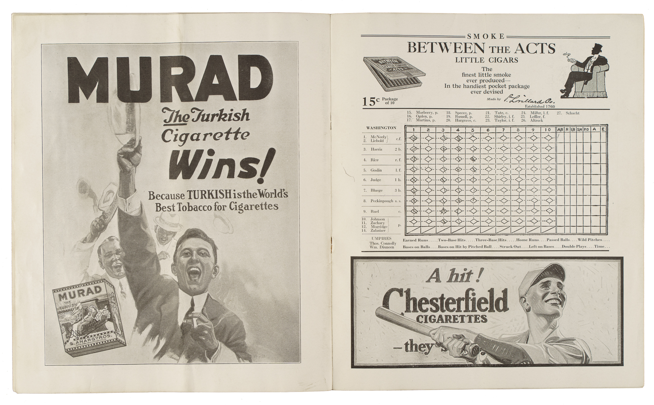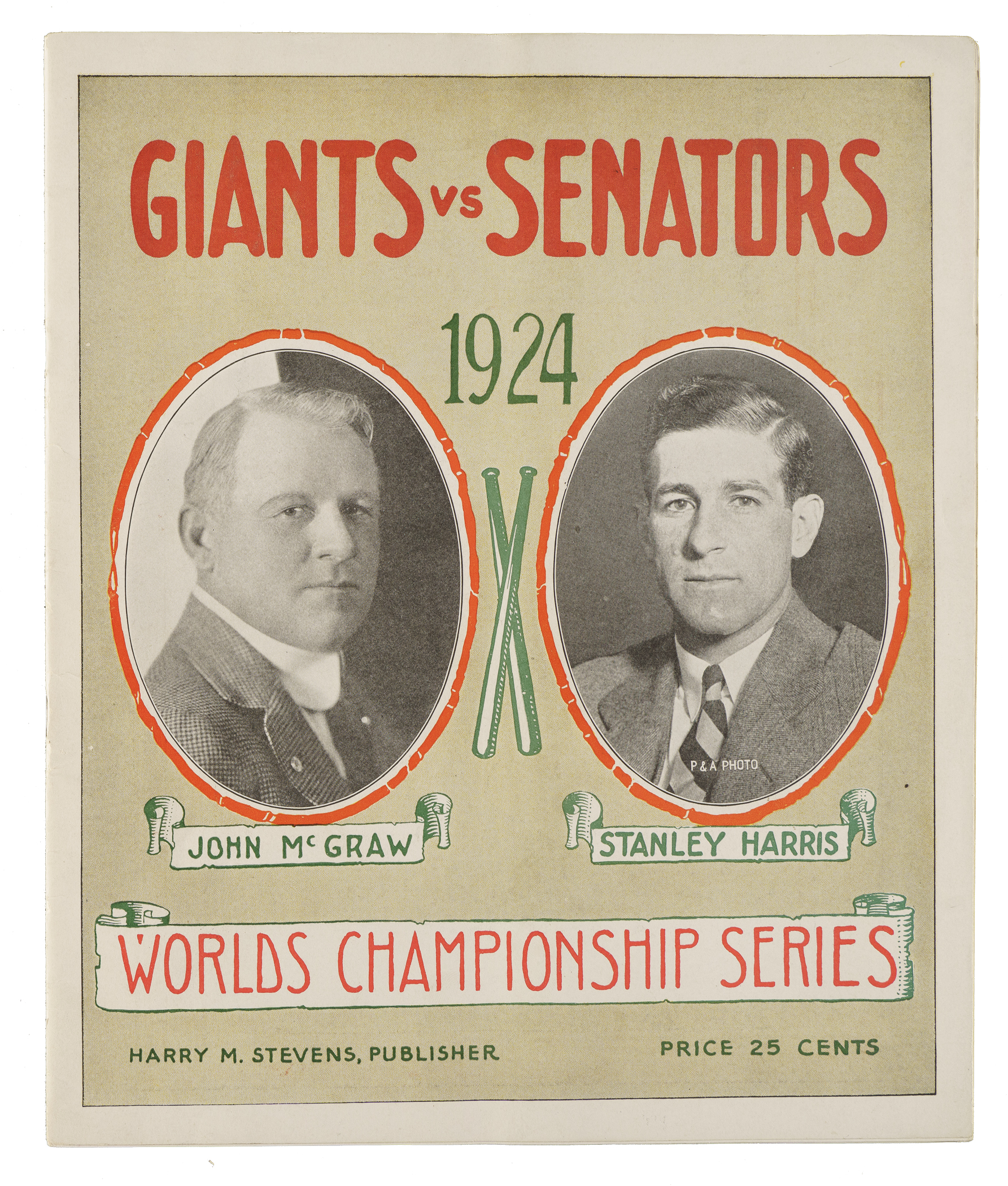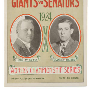 Attractive 16-page large-format program issued for the 1924 World Series between the New York Giants and Washington Senators at the Polo Grounds in New York. The cover features large portrait images of each club's respective manager, John McGraw and Bucky Harris, while the interior pages include photos of league and team officials, as well as portraits of 24 members of both the Giants and Senators. Published by Harry M. Stevens. The preprinted lineups include Frisch, Kelly, Youngs, Jackson, and Lindstrom for New York, and Johnson, Harris, Rice, and Goslin for Washington. The program is not scored, but the boxes do contain a number of pencil marks (meaning unknown) through the fifth inning. The Senators defeated the Giants in an exciting seven-game Series in 1924. The final game hung in the balance for 12 innings before a two-out ground ball off the bat of Early McNeely took a bad hop over the head of third baseman Fred Lindstrom and scored Muddy Ruel from second with the winning run. The game also marked the end of John McGraw's 1920s dynasty, during which his Giants captured five consecutive pennants and three World Championships between the years 1921 and 1925. The program (9.25 x 11 inches) displays a vertical fold and light creases. In Very Good condition overall.