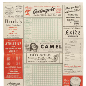1939 Philadelphia Athletics program issued for a game against the Boston Red Sox. The pictorial cover features portrait images of six future Hall of Famers: Frank Baker, Chief Bender, Eddie Collins, Mickey Cochrane, Jimmie Foxx, and Lefty Grove. The preprinted lineups include Frankie Hayes, Wally Moses, and Sam Chapman for Philadelphia, and Ted Williams (rookie year), Bobby Doerr, and Lefty Grove for Boston. The program is signed in pencil on an interior page by Kenesaw Landis (former commissioner of baseball), Paddy Livingston (signed blue ink), Jimmie Dykes, and Bing Miller. The 16-page program (7 x 11 inches), which is not scored, displays light creases and minor toning. In Very Good condition overall. Auction LOA from James Spence/JSA.