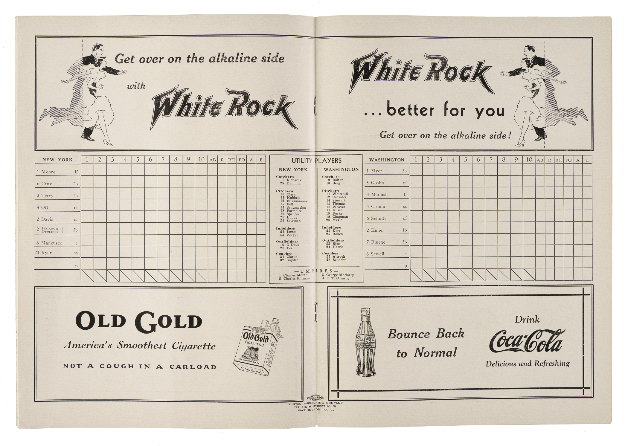 Program issued for the 1933 World Series between the New York Giants and Washington Senators, held at Griffith Stadium in Washington. Large portrait images of managers Joe Cronin and Bill Terry are featured on the cover. Not scored but from either Game 3, 4, or 5, which were all played at Griffith Stadium. The Giants defeated the Senators in five games thanks in large part to the mastery of mound ace Carl Hubbell, who won two games while compiling a 0.00 ERA in twenty innings of work. The offered program (7.75 x 10.75 inches) displays light creases. Very Good condition overall.