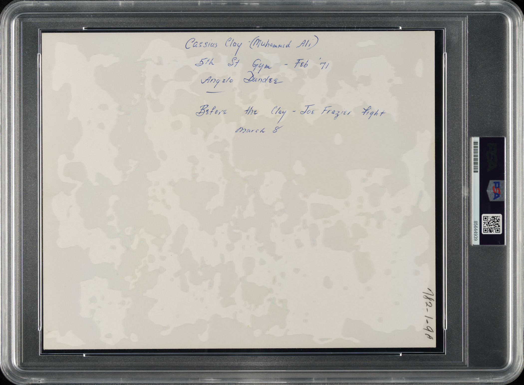 Original photo of Muhammad Ali and his longtime trainer Angelo Dundee, circa 1971. Encapsulated and certified as an original Type I photograph by PSA/DNA. Per the handwritten notations on the reverse, this photo is from February 1971 at the 5th Street Gym, not long before Ali's "Fight of the Century" against Joe Frazier on March 8th. This matchup between Frazier and Ali (the first of their three momentous fights) was one of the most highly anticipated bouts in boxing history and the first to match an undefeated former champion (Ali) against a current, unbeaten champion (Frazier). (Ali was stripped of his title in 1967 after refusing to be inducted into the U.S. Armed Forces.) The fight was as good as advertised, with Frazier winning a hard-fought, fifteen-round unanimous decision. The photo (10 x 8 inches) is in Very Good to Excellent condition overall.