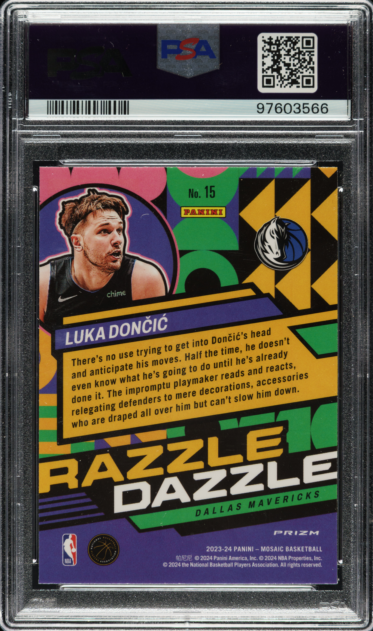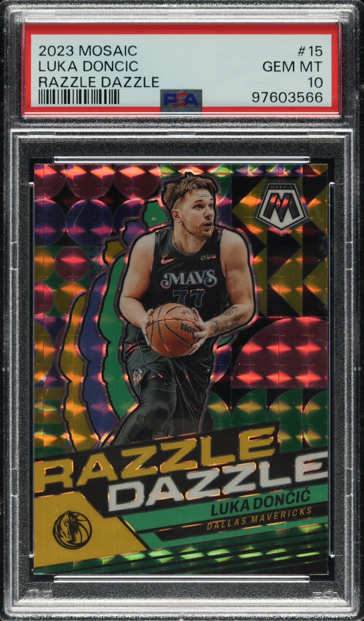 Lot # 2951: 2023-2024 Panini Mosaic Razzle Dazzle Basketball #15 Luka Doncic PSA GEM MINT 10
