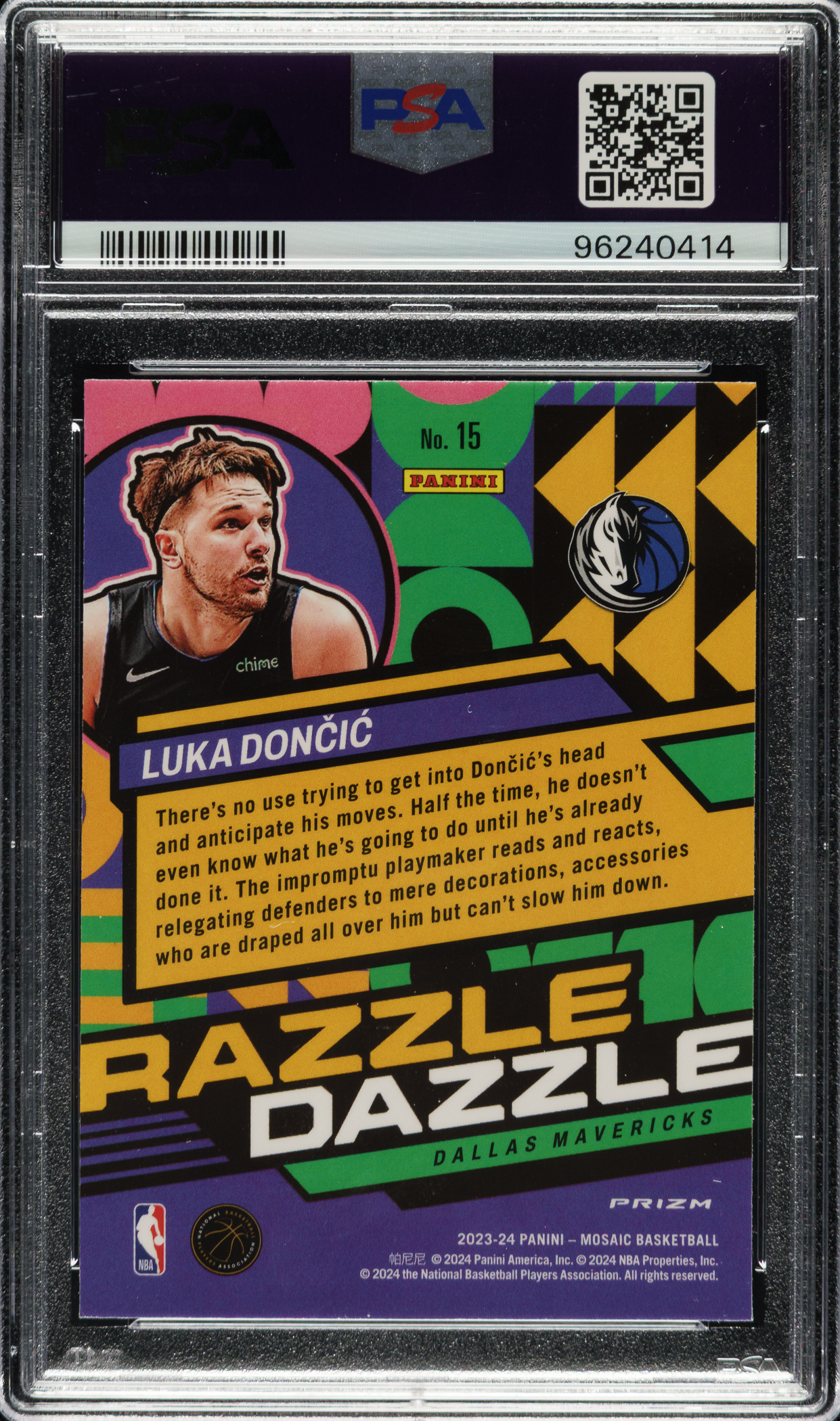 Lot # 2952: 2023-2024 Panini Mosaic Razzle Dazzle Basketball #15 Luka Doncic PSA GEM MINT 10