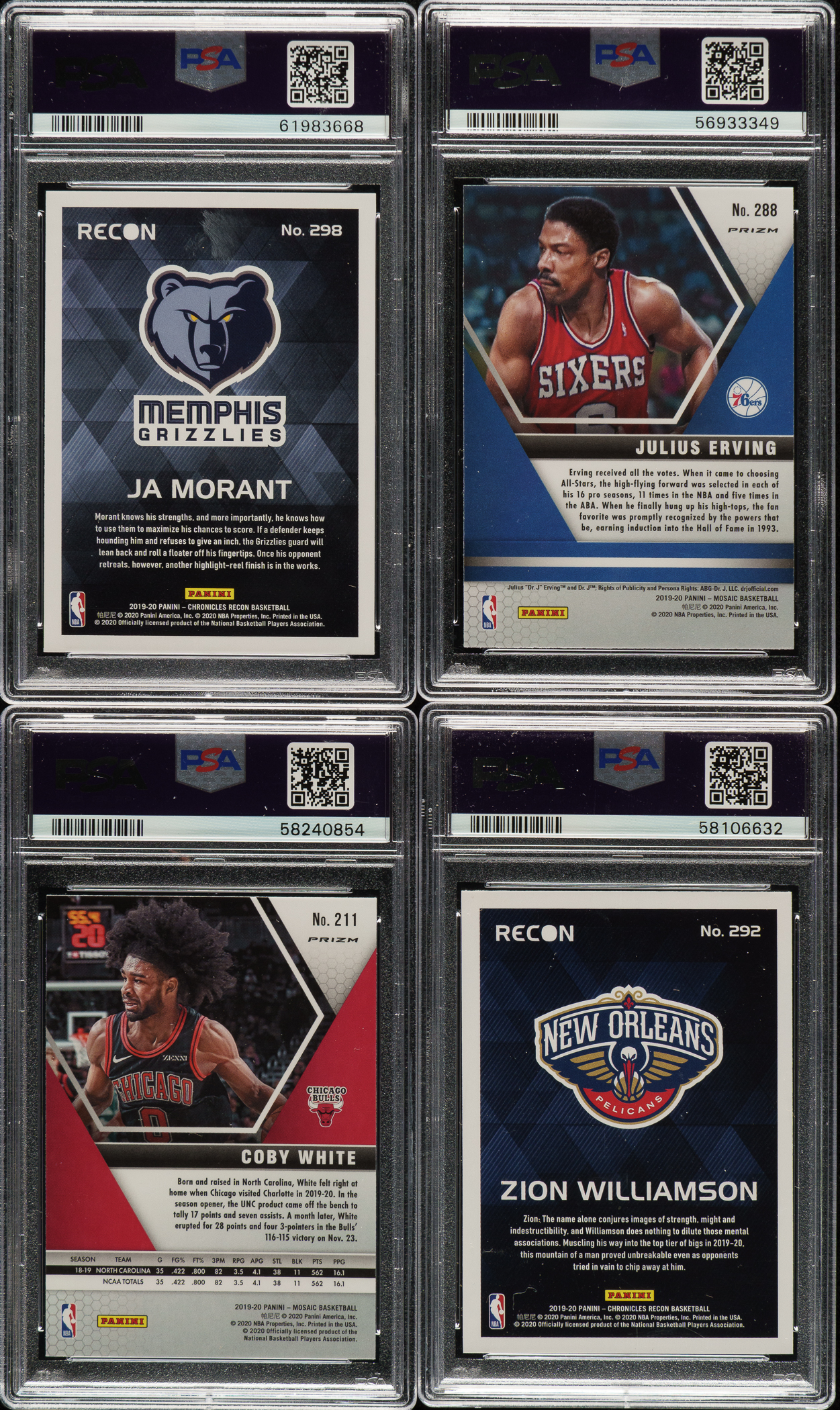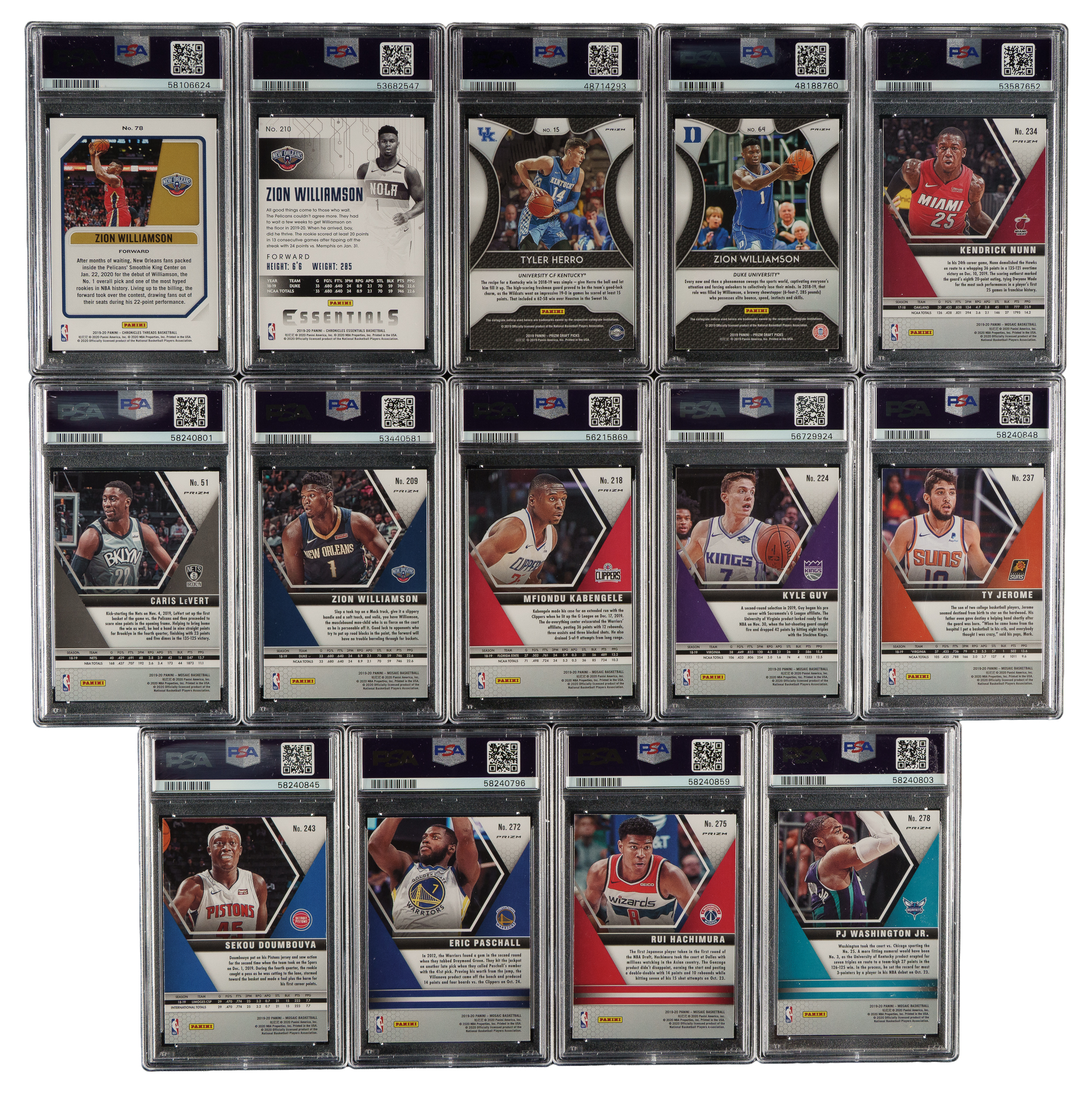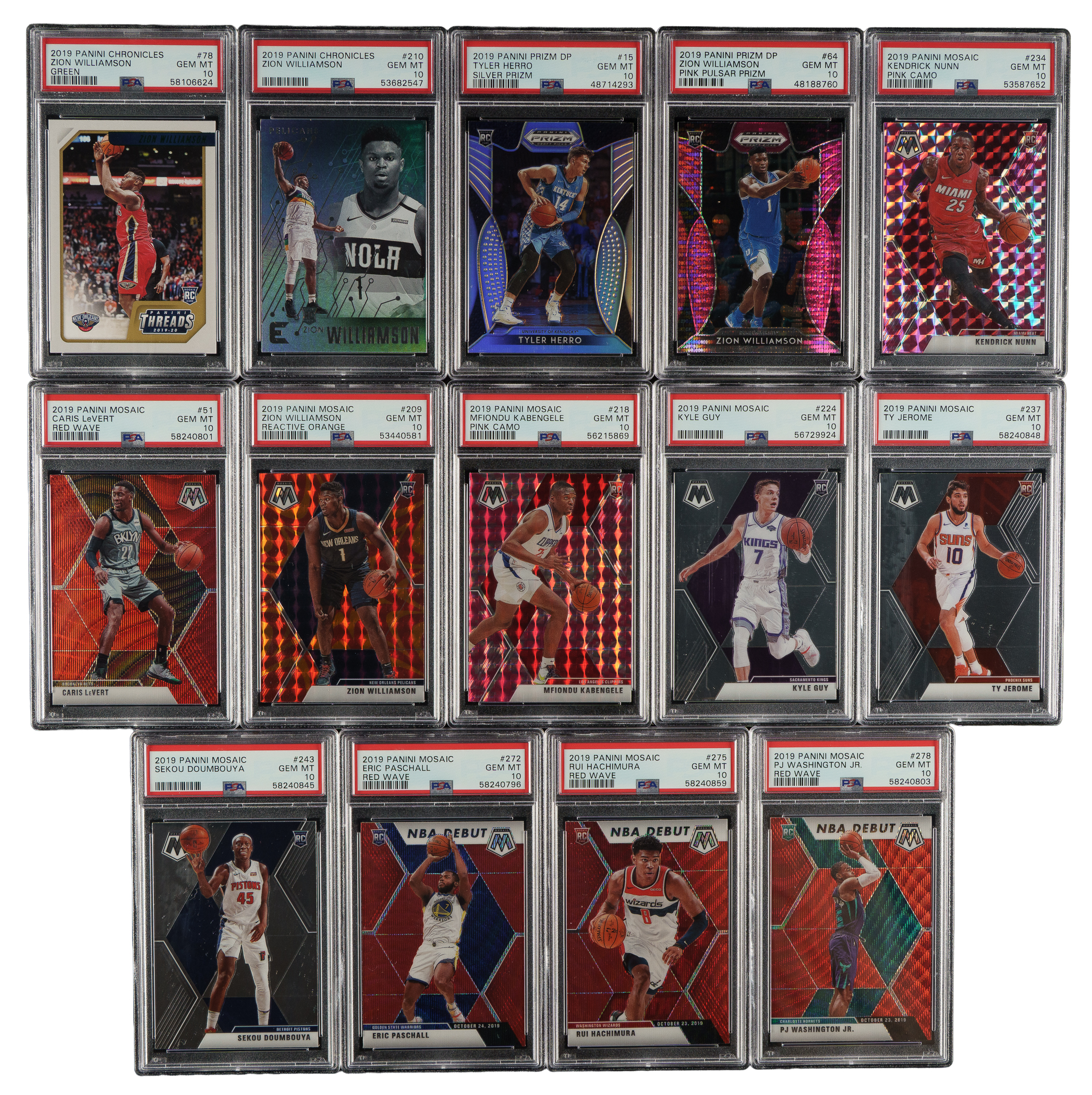 Collection of eighteen 2019-2020 Panini Chronicles, Prizm and Mosaic basketball cards, featuring, each graded and encapsulated GEM MINT 10 by PSA. This collection consists of the following: 1) 2019-2020 Panini Chronicles (4 cards): #78/Green RC, 210 RC, 292 RC, and 298 RC. 2) 2019-2020 Panini Prizm Draft Picks (2 cards): #15/Silver prizm RC and 64/Pink pulsar prizm RC. 3) 2019-2020 Panini Mosaic (12 cards): #51/Red wave, 209/Reactive orange RC, 211/Green mosaic RC, 218/Pink camo RC, 224 RC, 234/Pink camo, 237 RC, 243 RC, 272/Red wave, 275/Red wave, 278/Red wave RC, and 288 Erving/Reactive blue. Total: 18 cards. The size/weight of this item requires that there will be an additional shipping charge for this lot.