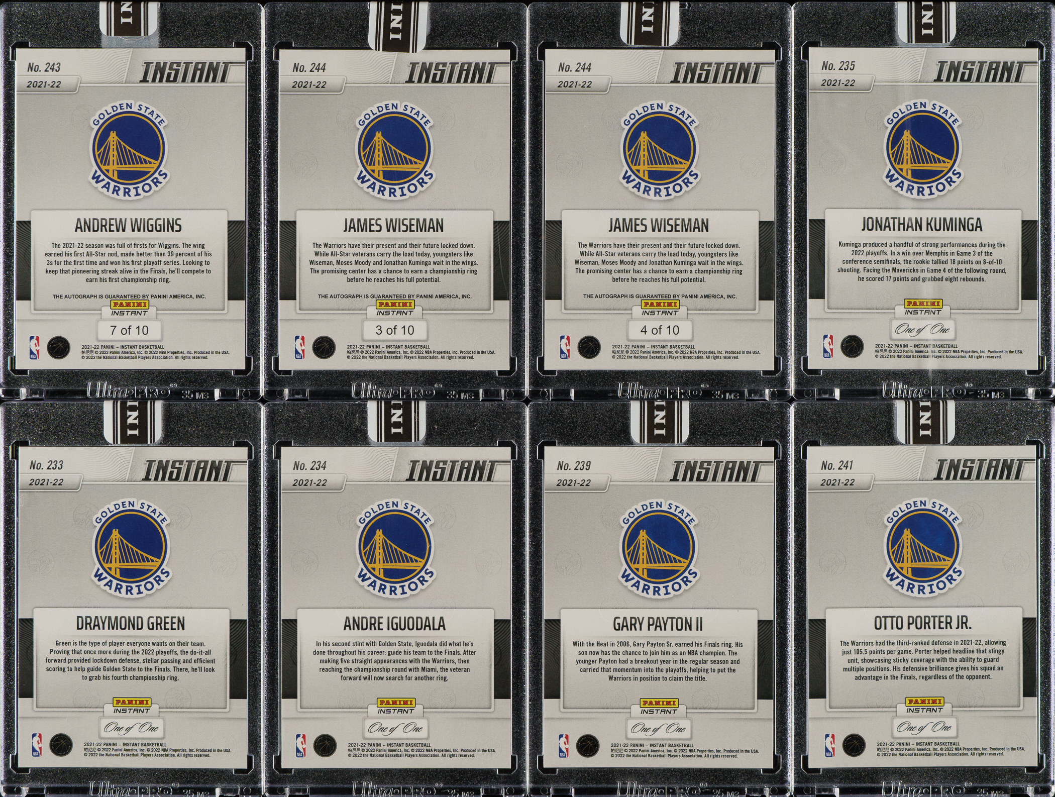Collection of eight 2021-2022 Panini Instant NBA Playoff basketball cards, each encapsulated by Panini and in apparent Nm/Mt to Mint condition. This collection consists of the following: #233 Green #/1/1, 234 Iguodala #1/1, 235 Kuminga RC #1/1, 239 Payton II #1/1, 241 Porter Jr. #1/1, 243 Wiggins Autograph #7/10, and two 244 Wiseman Autograph #3/10 and #4/10. Total: 8 cards.