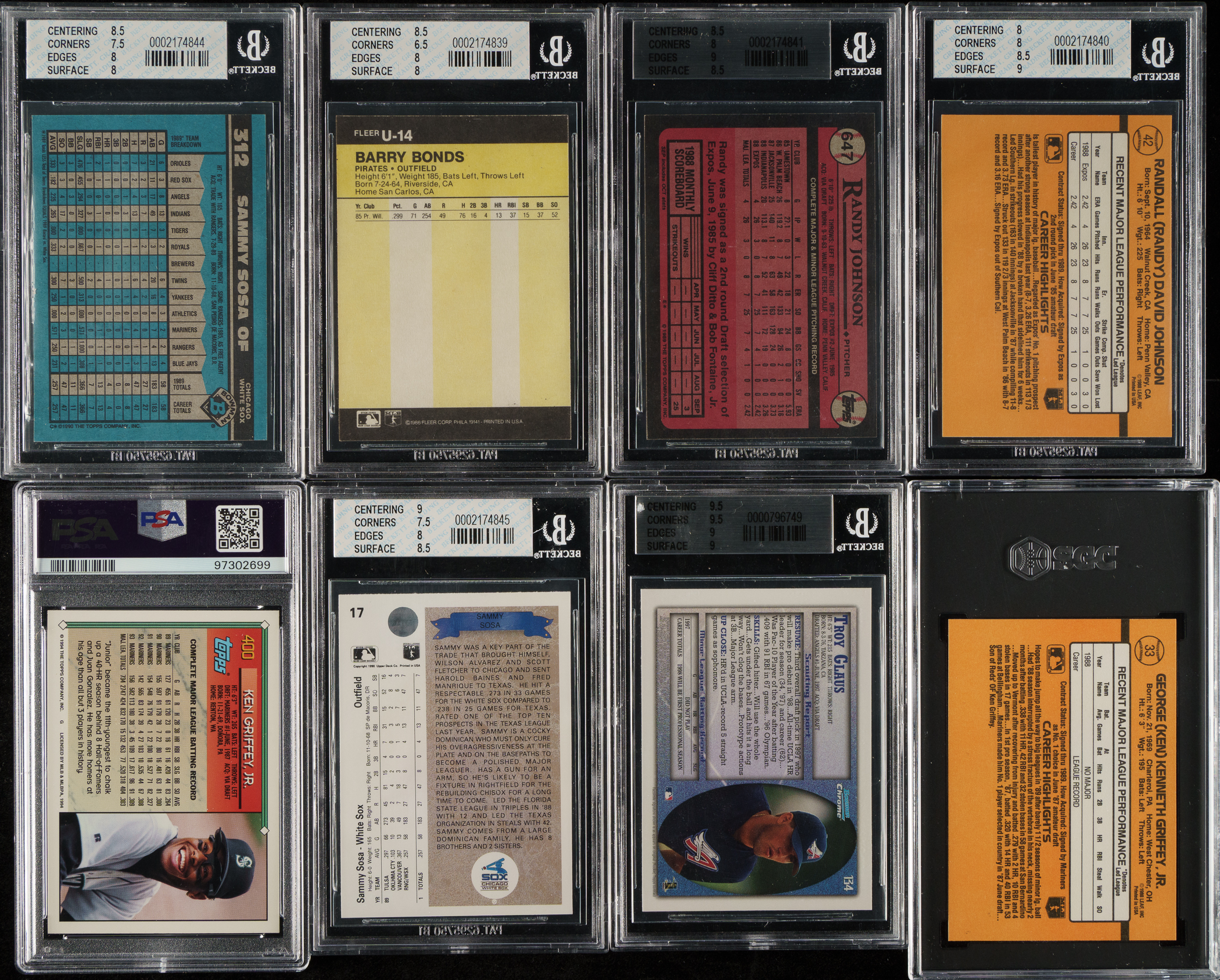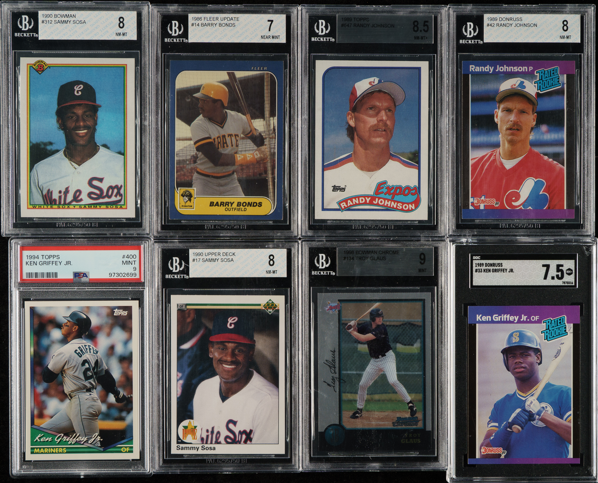 Collection of eight 1986 to 1998 Bowman, Fleer, and Topps cards, featuring Montreal Expos and Seattle Mariners Hall of Famers Randy Johnson and Ken Griffey Jr. Each card has been graded and encapsulated by PSA (1), BGS (6), or SGC (1). This collection consists of the following: 1) 1986 Fleer Update (1 card): #14 RC (NM 7). 2) 1989 Topps (1 card): #647 Johnson RC (NM-MT+ 8.5). 3) 1989 Donruss (2 cards): #33 Griffey Jr. RC (SGC NM+ 7.5) and 42 Johnson RC (NM-MT 8). 4) 1990 Bowman (1 card): #312 RC (NM-MT 8). 5) 1990 Upper Deck (1 card): #17 RC (NM-MT 8). 6) 1994 Topps (1 card): #400 Griffey Jr. (PSA MINT 9). 7) 1998 Bowman Chrome (1 card): #134 (MINT 9). Total: 8 cards. The size/weight of this item requires that there will be an additional shipping charge for this lot.