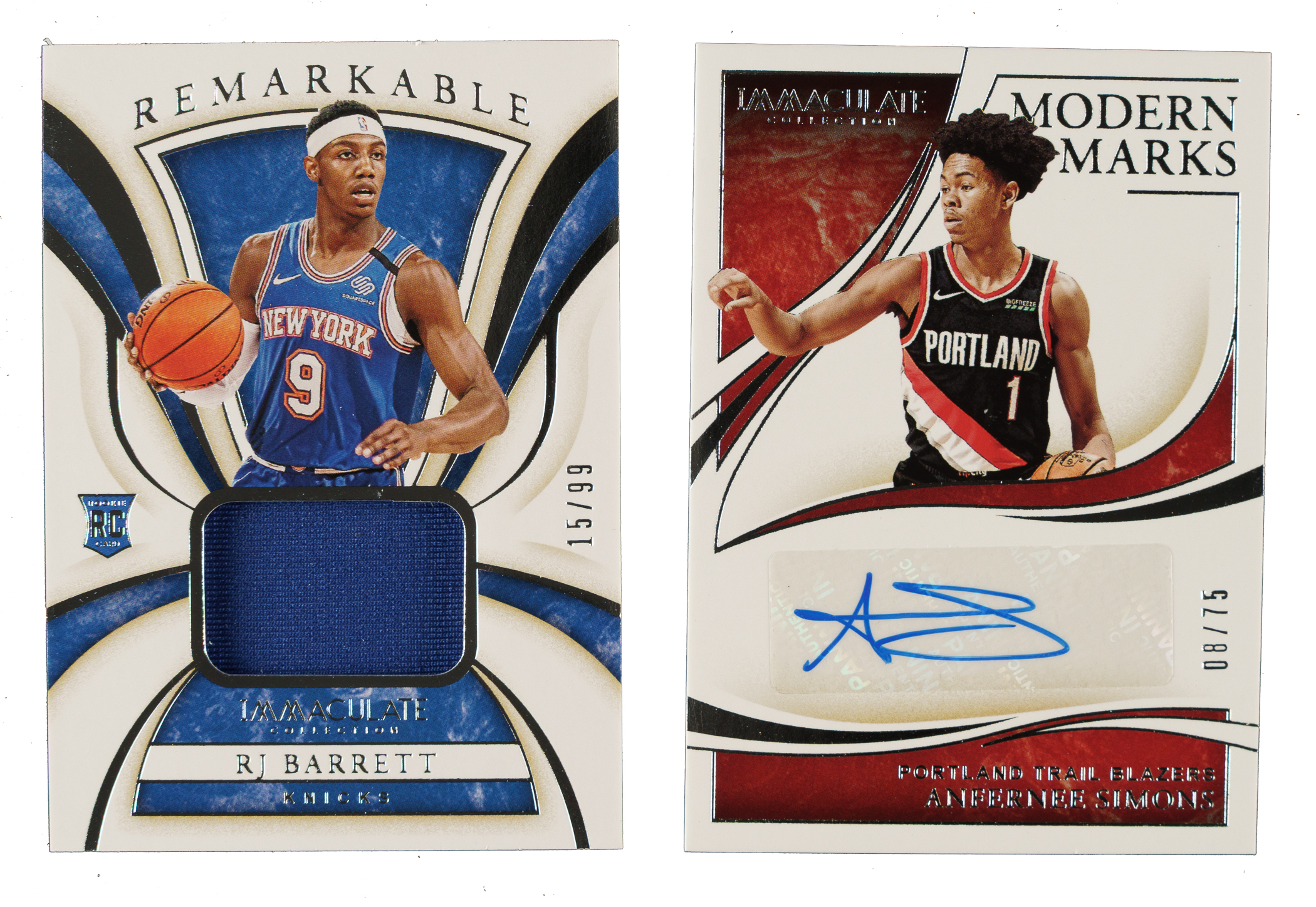 Pair of 2019-2020 Panini Immaculate Collection basketball cards. This pair consists of the following: 1) 2019-2020 Panini Immaculate Collection Remarkle Rookie Jerseys #RR-RJB RJ Barrett Rookie #15/99 (Nr/Mt). 2) 2019-2020 Panini Immaculate Collection Modern Marks #MM-ASM Anfernee Simons #8/75 (Nr/Mt). Total: 2 cards.
