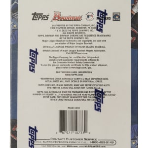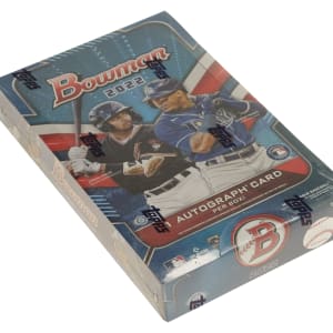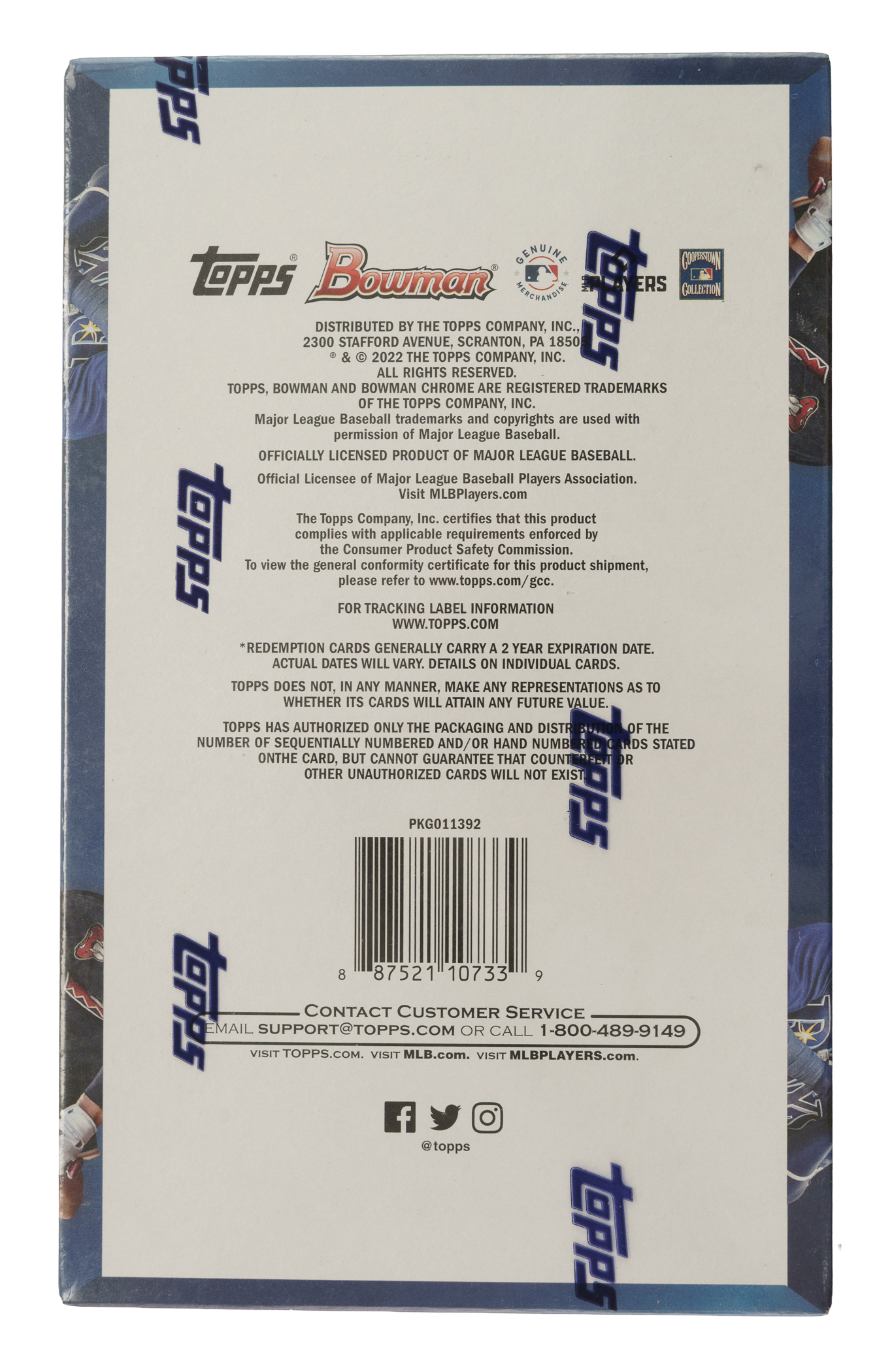 Presented is an unopened 2022 Bowman hobby box containing 24 packs. The box is wrapped in its original factory cellophane. Notable players with rookie cards in the set include Oneil Cruz and Jarren Duran.
