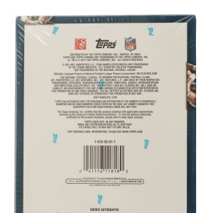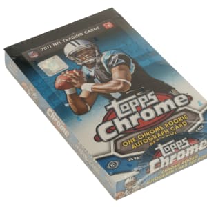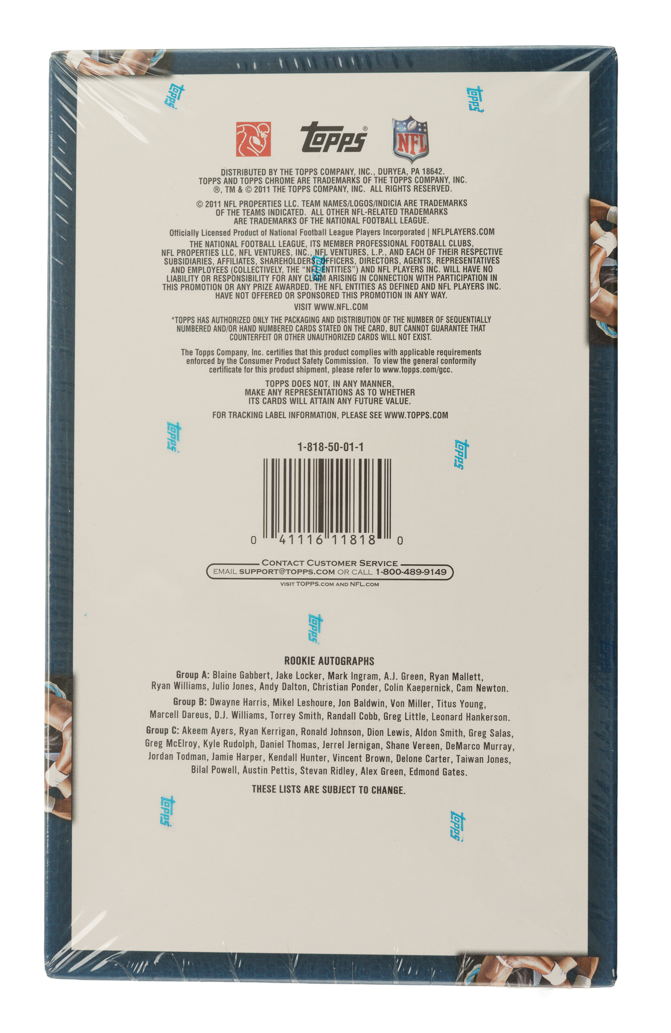 Presented is an unopened 2011 Topps Chrome football hobby box containing 24 packs. The box is wrapped in its original factory cellophane. Notable players with rookie cards in the set include Cam Newton and J.J. Watt.