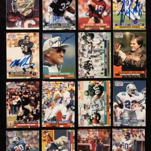 Complete set of 850 cards from the 1991 Pro Set football series, highlighted by an incredible 704 different (plus one duplicate) signed examples. Among these are many Hall of Famers and stars, including Joe Montana, John Randle (rookie), Mike Singletary, Jim Kelly, Deion Sanders, Bill Parcells, Mike Ditka, and Steve Young. Seven of the signed cards have been authenticated and encapsulated by PSA/DNA (3) and Beckett/BAS (4). Includes both variations of card #1 and a duplicate of #550 W. Anderson (both signed). Condition is 68% Nr/Mt to Nr/Mt-Mt (including some Mint), 27% Ex to Ex-Mt, and 5% Vg to Vg-Ex. The unsigned cards grade a bit higher overall than the signed cards. Unsigned Keys: #1b E. Smith/Award (Nr/Mt-Mt), 126 Belichick (Vg+), and 762 Favre RC (Nr/Mt-Mt). Signed Cards (705): #1a Carrier/Award, 3 Montana/Award (Ex), 4 Shell/Award, 5 Singletary/Award (Vg+, BAS basic certification), 7, 9 Moon LL, 11 Rice LL, 12, 13 Thomas LL, 14, 15, 16, 18, 20 Anderson MS, 21 Craig MS, 24 Cunningham MS, 27 Campbell, 28 Hannah, 29 S. Jones, 30 Schramm, 31 Stenerud, 32, 33, 34, 35, 36, 37, 38, 40 T. Brown HH, 41 Testaverde HH, 43, 44 Walker HH, 46 Lofton SB, 47, 48, 49, 50, 51 Anderson SB, 52 Thomas SB, 53, 54, 55, 56, 57, 58, 59, 60, 61, 62, 63, 64, 65, 66, 67, 68, 69, 70, 71, 72 Parcells, 74, 75, 76, 77, 78 Kelly (BAS), 79, 80, 81 Reed, 82, 83, 84, 85, 86 Thomas, 87, 88, 89, 90 Levy (HOF 09), 91, 92, 93 Fralic (PSA Authentic), 94, 95, 97, 98 D. Sanders (BAS), 99, 100, 101, 102, 103, 104, 105, 106, 107, 108 Ditka, 109 Billups, 110, 111 Esiason, 112, 113, 114, 115, 116, 117, 118, 119, 120, 121, 123, 125, 127, 129, 130, 134, 136, 137, 139, 140, 141, 142, 143, 144, 146, 147, 148, 149, 150, 151, 152, 153, 154, 155, 156, 157, 158, 159, 160, 161 Sterling Sharpe, 162, 163, 164, 165, 166, 167 Moon, 168, 169, 170, 171, 172, 173, 174, 175 Dickerson, 176, 177, 178, 179, 180, 181, 182, 183, 184, 185, 186, 187, 189, 190, 192, 193, 195, 196, 197, 198, 199, 200, 201, 202 Greene, 203, 204, 205, 206, 207, 208, 209, 211, 212, 213, 214, 215, 216 Shula (Ex), 218, 219, 220, 222, 223, 224, 225, 226, 227, 228, 229, 230, 231, 232, 233, 234, 235, 236, 237, 238, 239, 240, 241, 242, 243, 244, 245, 246, 247, 248, 249, 250, 251, 252, 253, 254, 255, 256 Cunningham, 257, 258, 259, 260, 261, 262, 263, 264, 267, 268, 269, 270, 271, 272, 273, 274, 275, 276, 277, 278, 279 Noll, 280, 281, 282, 283, 284, 285, 286, 287, 288, 289, 290, 291, 292, 293, 294, 295, 296 Young (Ex), 297 Seifert, 298, 299, 303, 304, 305, 306 Knox, 307, 308, 309, 310, 311, 312, 314 Testaverde, 315, 316, 317, 318, 319, 320, 321, 322, 323, 325, 327 Esiason REP, 328, 330, 331, 332, 337 Moon REP, 338, 339, 340 Clayton, 342, 344, 347 Tagliabue (PSA Auto MINT 9), 349, 355, 356, 358, 362, 363, 364, 365 McCarter (BAS), 366, 370 Moon TAI, 371 Esiason TAI, 373, 374, 375, 376, 377, 378, 380, 381, 383, 384, 386, 387 Montana All-NFC (Nr/Mt, personalized), 389, 391, 393, 394 Taylor All-NFC, 395, 397, 398, 399, 401, 402, 403, 404, 406, 407, 408, 409, 411, 412, 413, 414 Moon All-AFC, 415 Thomas All-AFC, 416, 417, 418, 419, 421, 422, 423, 425, 427, 428, 429, 430, 431, 432 Shell All-AFC, 433, 434, 435, 437, 438, 439, 440, 441, 442, 443, 444 Lofton (HOF 2013), 445, 447, 448, 450, 452, 454, 455, 456, 457, 459, 460, 461, 462, 463, 464, 465, 466, 467, 468, 469, 470, 471, 472, 473, 474, 475, 476, 477, 478, 479, 480, 483, 484, 486, 487, 488 Holmes (BAS), 489, 490, 491, 492, 495, 496, 497, 498, 499, 501, 503, 504, 505, 506, 507, 508, 509, 510, 511, 512, 513, 514, 515, 516, 517, 518, 520, 521, 522, 523, 524, 525, 526, 527, 528, 529, 530, 531, 532, 533, 534, 535, 536, 537, 538, 539, 540, 541 Allen (Ex-Mt+), 542, 544, 545, 547, 548, 549, two 550 W. Anderson (one signed with "Flipper" nickname only), 553, 555, 556, 557, 558, 560, 564, 565, 567, 568, 569, 573, 574, 575, 576 Walker, 577, 578, 579, 580, 581, 582, 583, 584, 585, 586, 587, 588, 589, 590, 591, 592, 593, 594, 595, 596, 597, 598, 599, 600, 603, 604, 605, 606, 607, 608, 609, 610, 611, 612, 613, 615, 616, 617, 618, 619, 620 White (Ex-Mt, "John 3: 3-16" inscription), 621, 622, 623, 625, 626, 627, 628, 629, 630, 631, 632, 633, 634, 635, 636, 637, 638, 639, 640, 641, 642, 643, 644, 646, 647, 648, 649, 650, 651, 652, 653 Montana (Nr/Mt), 655, 656, 657, 658, 659, 660, 662, 663, 664, 665, 666, 667, 668, 669, 670, 673, 674, 675, 676, 677, 679, 680, 683, 685 (signed by Handley), 686 Tagliabue (PSA Auto MINT 9), 694, 695, 696, 698, 699 Newsome Legend, 700, 702, 703, 704, 705, 707, 708, 710, 711, 712, 713, 714, 716, 717, 719 HOF Photo Contest (signed by Ralph Wilson), 720, 721, 722, 723, 724, 727, 728 Singletary TAI, 729, 730, 732, 733, 734, 735, 736, 737, 738, 739 Moore RC, 740, 741, 742, 743, 744, 745, 746, 747, 748, 749, 750, 751, 752, 753, 754, 755, 756, 757, 758, 759, 760, 761, 763, 764, 765, 766, 767, 768, 769, 770, 772, 773, 774 Watters RC, 775, 776, 777, 778, 779, 780, 781, 782, 783, 784, 786, 787, 792, 793, 794, 795, 796, 797, 798, 799, 800, 801, 802, 803, 804, 805, 806, 807, 808, 809, 810, 811, 812 McCaffrey RC, 816, 817, 818, 819, 820, 822, 823, 824, 825, 826, 827, 828, 829, 830, 831, 833, 835 Randle RC (Nr/Mt-Mt+), 836, 838, 839, 840, 841, 842, 844, 845, 846, 847, 848, 849, and 850. Total: 852 cards (set of 850 plus a variation and duplicate). Auction LOA from James Spence/JSA.