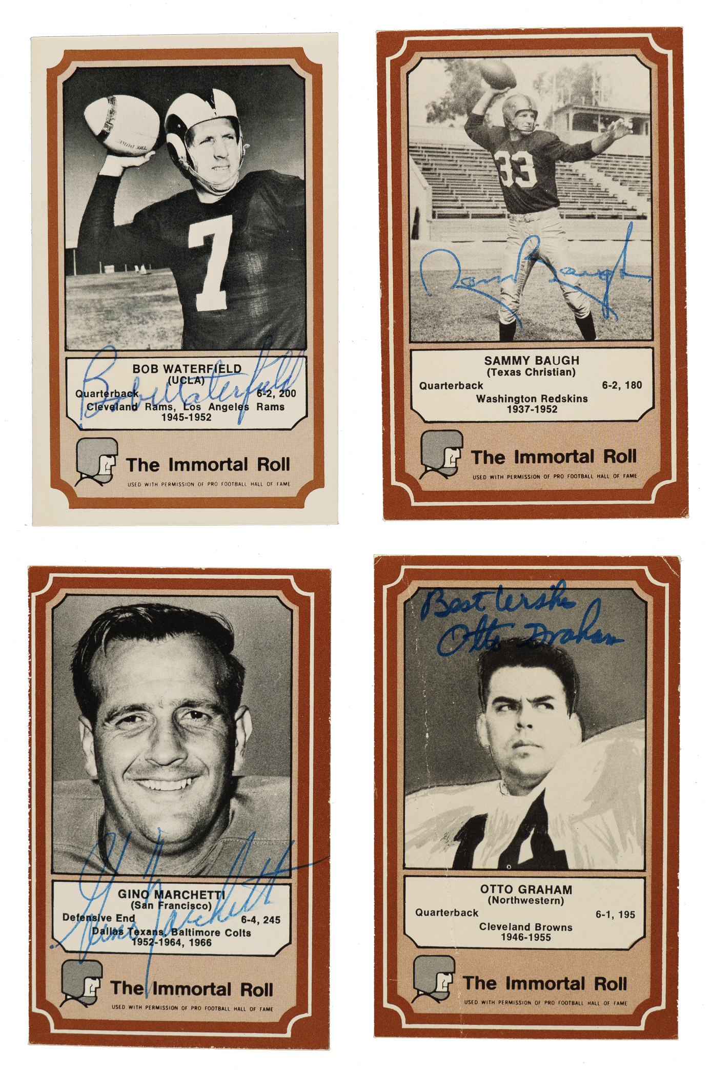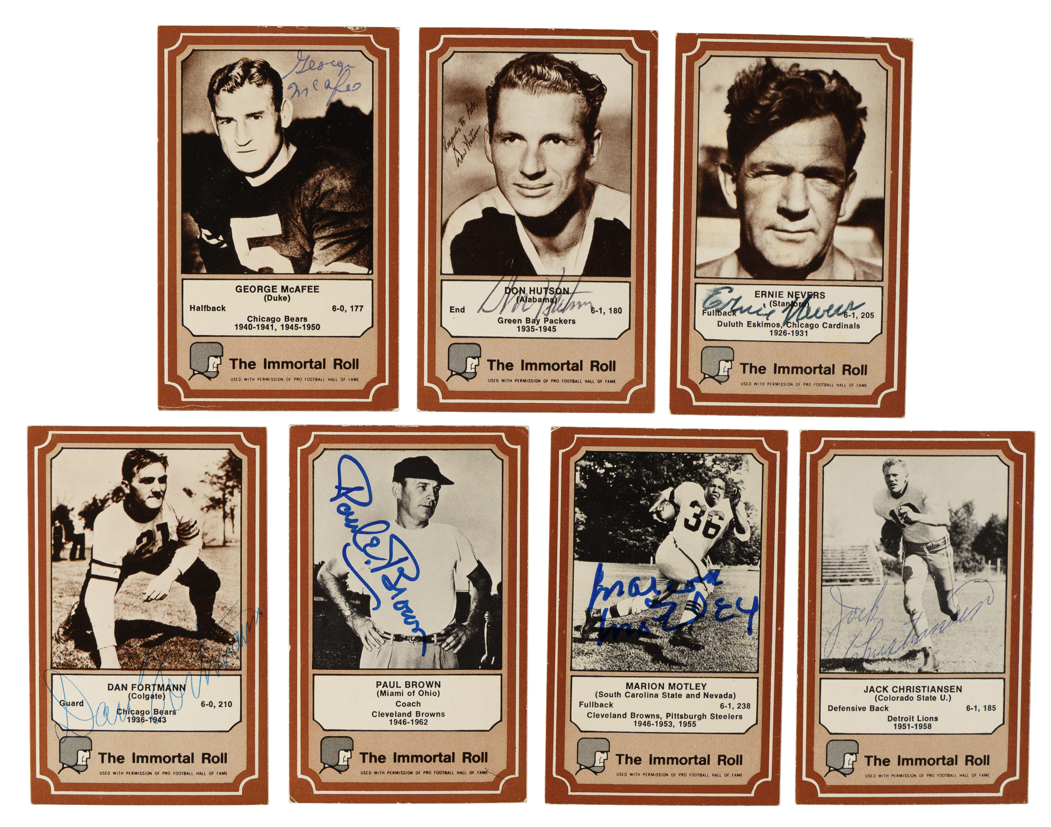 Complete 84-card set of 1975 Fleer "Immortal Roll" Football, plus an additional eleven signed cards (most notably Ernie Nevers, who passed away shortly after the set was issued), and one duplicate (#14 Clark). The condition of the unsigned complete set is 52% Nr/Mt to Nr/Mt-Mt (mostly Nr/Mt) and 48% Ex to Ex-Mt (including a few lesser). Includes the following eleven signed cards: #9 McAfee (Vg), 18 Hutson (Vg+), 19 Nevers (Vg-Ex), 20 Fortmann (Ex+), 24 P. Brown (Vg), 27 Graham (Fr), 34 Marchetti (Ex), 37 Motley (light ink marks on reverse, otherwise Vg-Ex), 50 Baugh (Vg-Ex), 61 Christiansen (Ex), and NNO Waterfield (1974 Fleer Immortals, Ex). All of the signatures appear on the front of the card and have been scripted in a variety of inks. Total: 96 cards (including eleven signed). Auction LOA from James Spence/JSA.