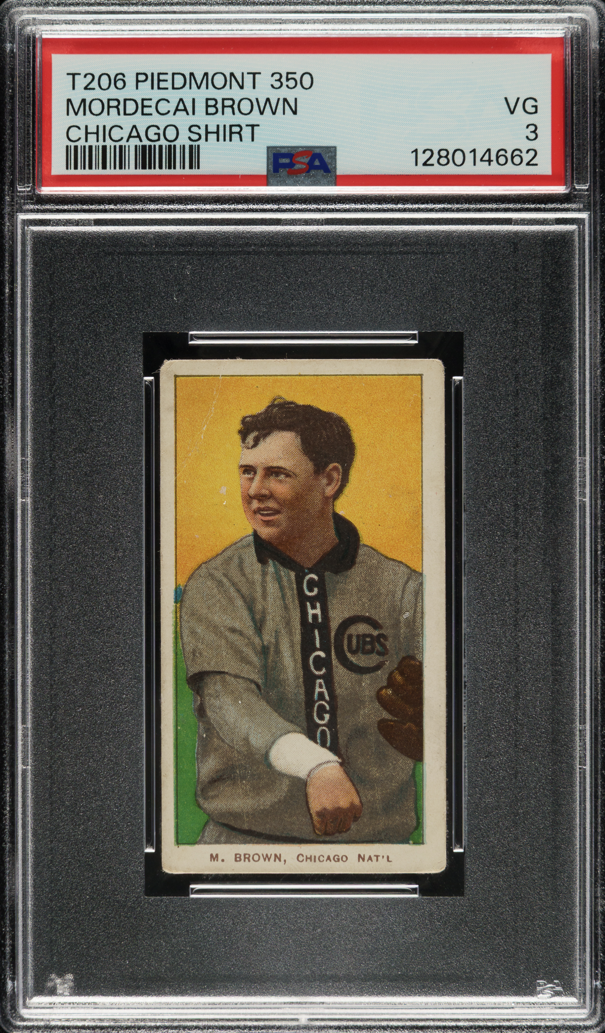 Graded VG 3 by PSA. Chicago Cubs Hall of Famer Mordecai Brown.