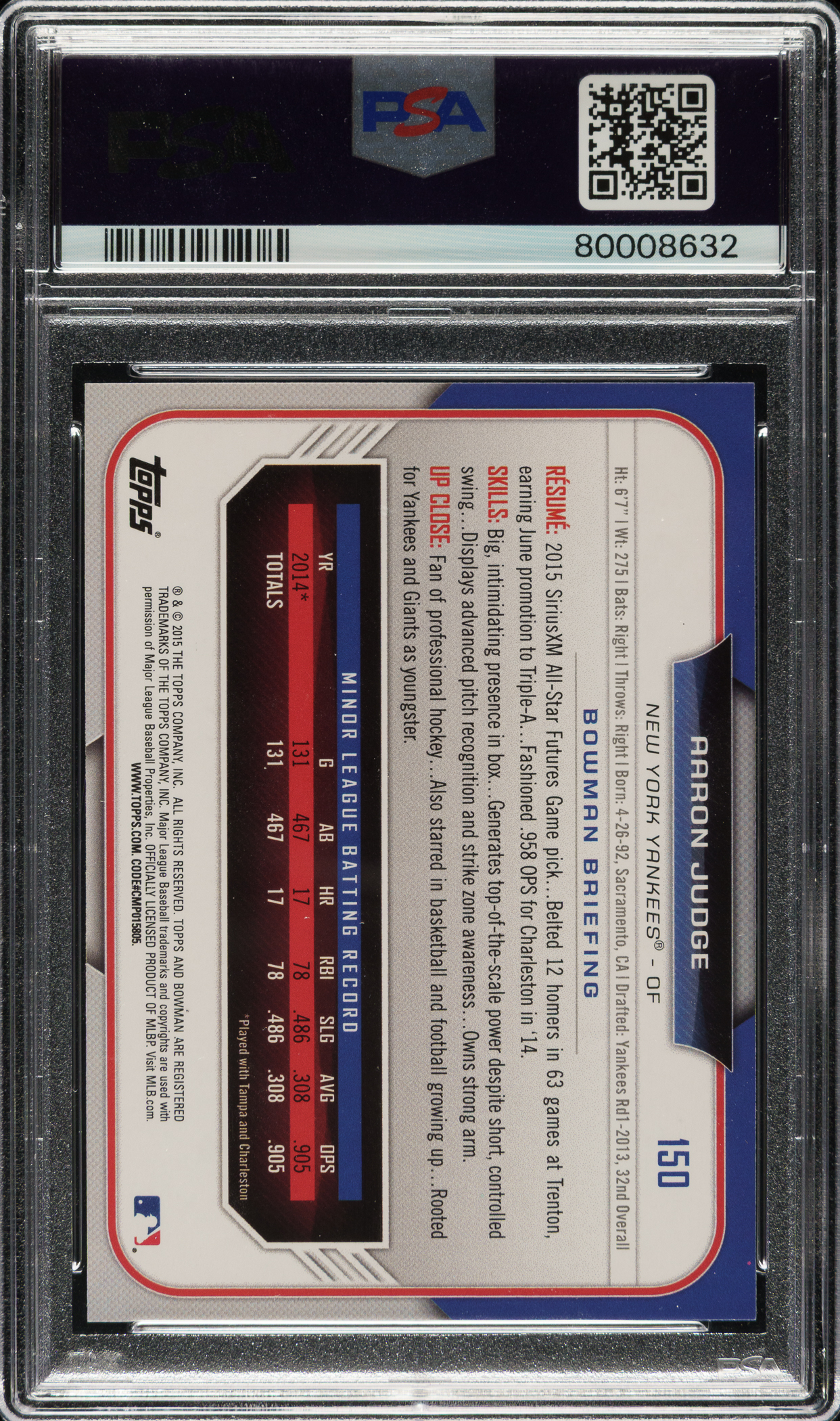 Lot # 2295: 2015 Bowman Chrome Draft #150 Aaron Judge PSA GEM MINT 10