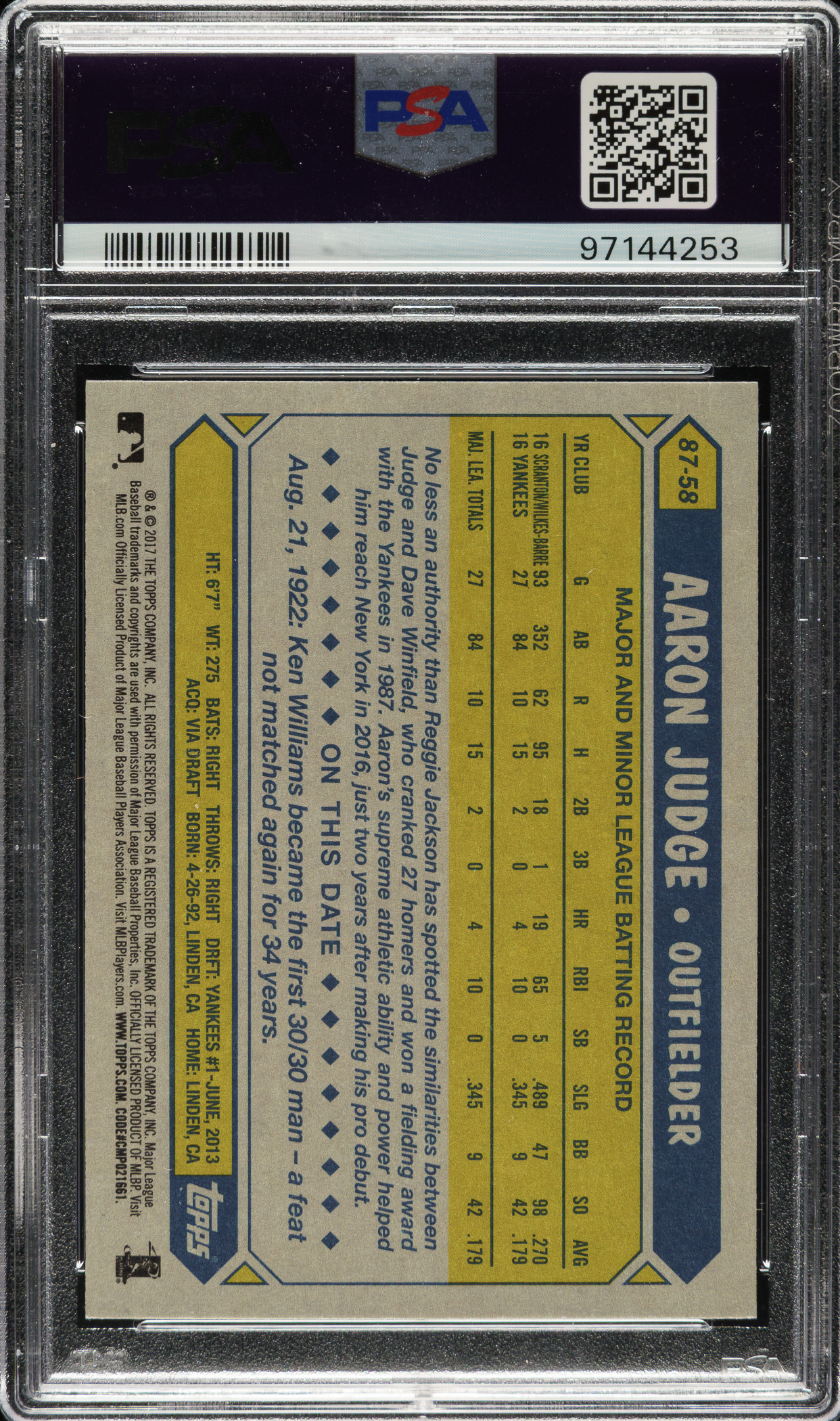 Lot # 2302: 2017 Topps "30th Anniversary 1987" #87-177 Aaron Judge Rookie PSA GEM MINT 10