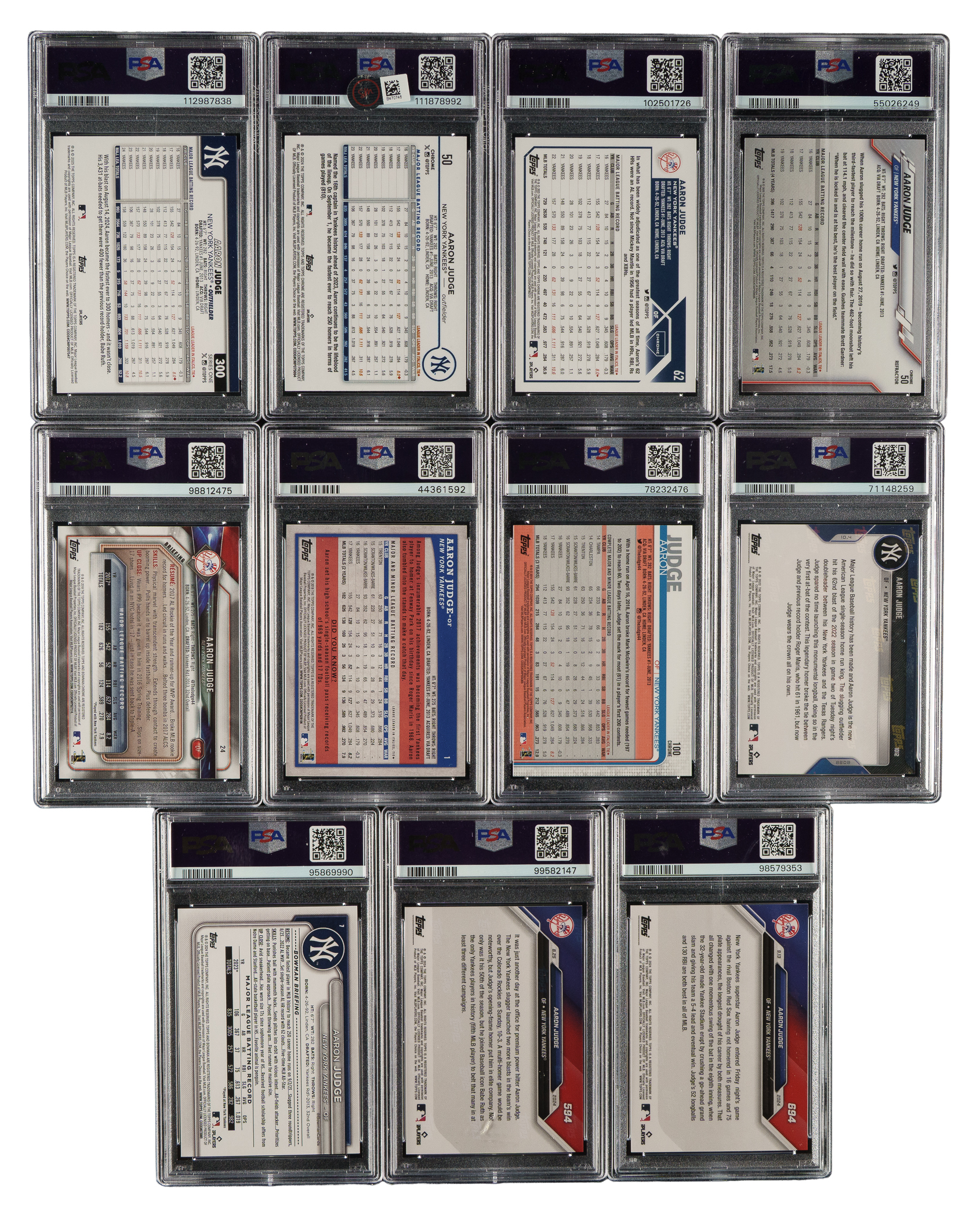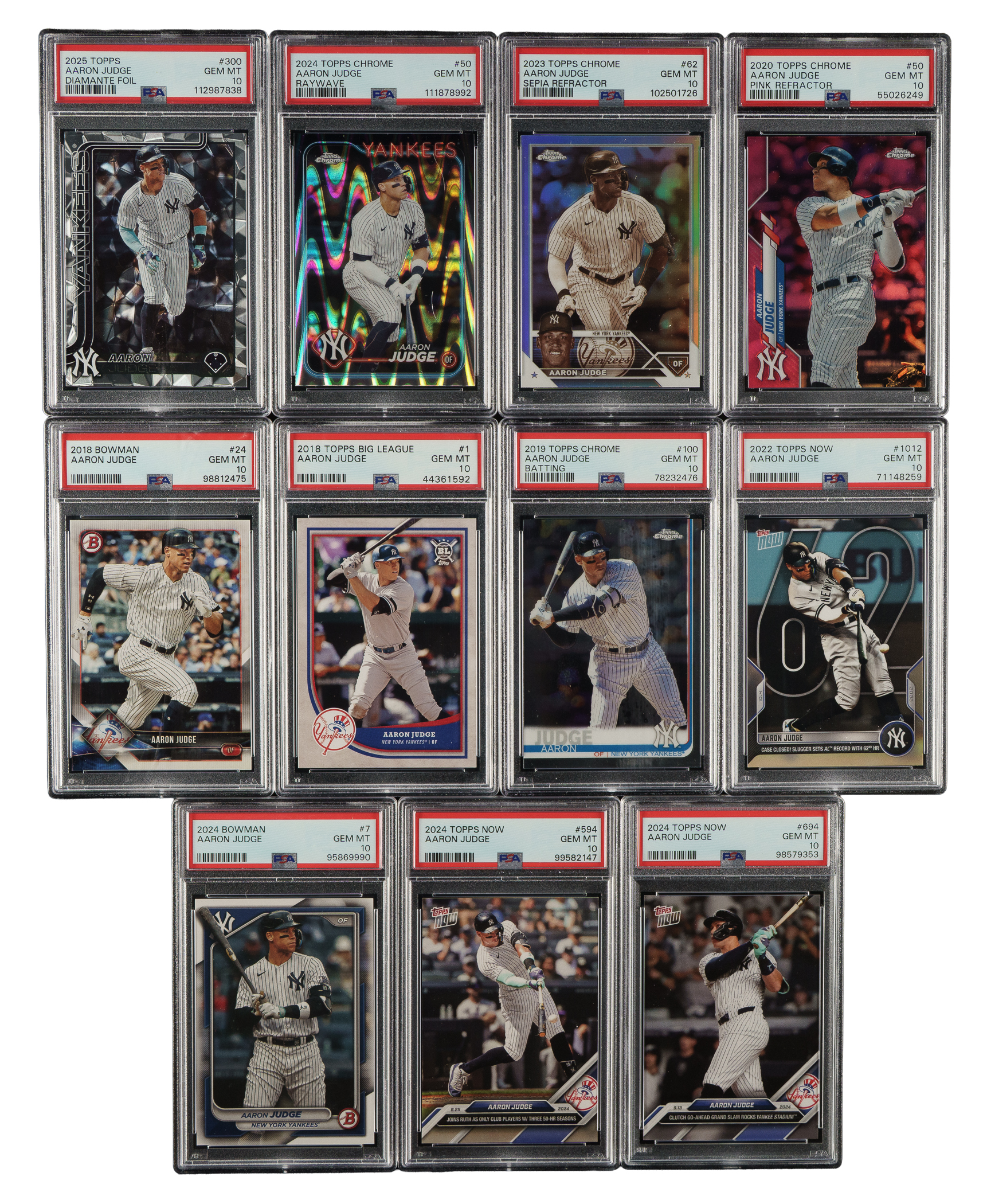 Collection of eleven 2018 to 2025 Topps and Bowman cards, each graded and encapsulated GEM MINT 10 by PSA. This collection consists of the following: 1) 2018 Bowman (1 card): #24. 2) 2018 Topps Big League (1 card): #1. 3) 2019 Topps Chrome (1 card): #100/batting. 4) 2020 Topps Chrome (1 card): #50/pink refractor. 5) 2022 Topps Now (1 card): #1012. 6) 2023 Topps Chrome (1 card): #62/sepia refractor. 7) 2024 Topps Chrome (1 card): #50/raywave. 8) 2024 Bowman (1 card): #7. 9) 2024 Topps Now (2 cards): #594 and 694. 10) 2025 Topps (1 card): #300/diamante foil. Total: 11 cards. The size/weight of this item requires that there will be an additional shipping charge for this lot.