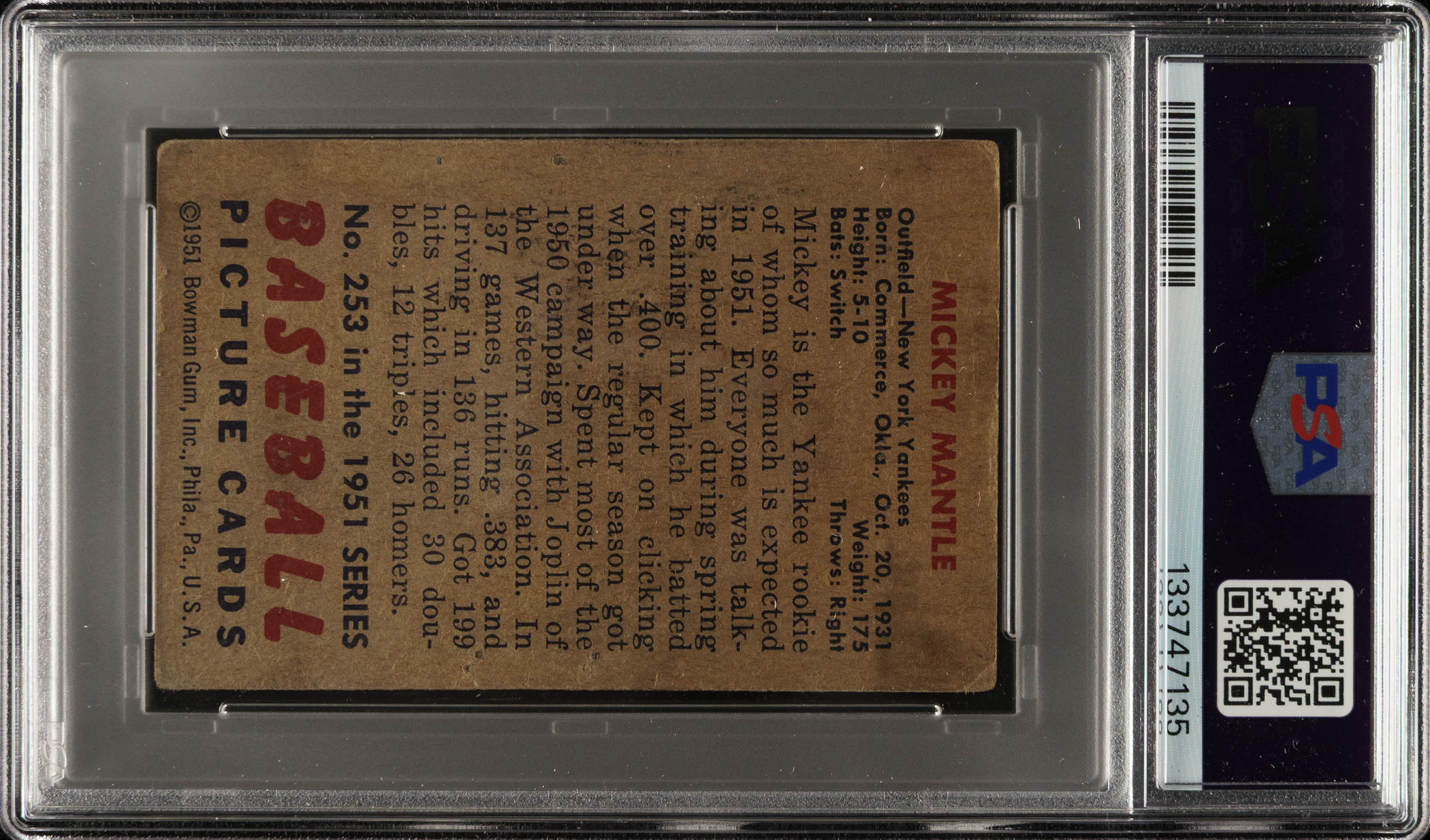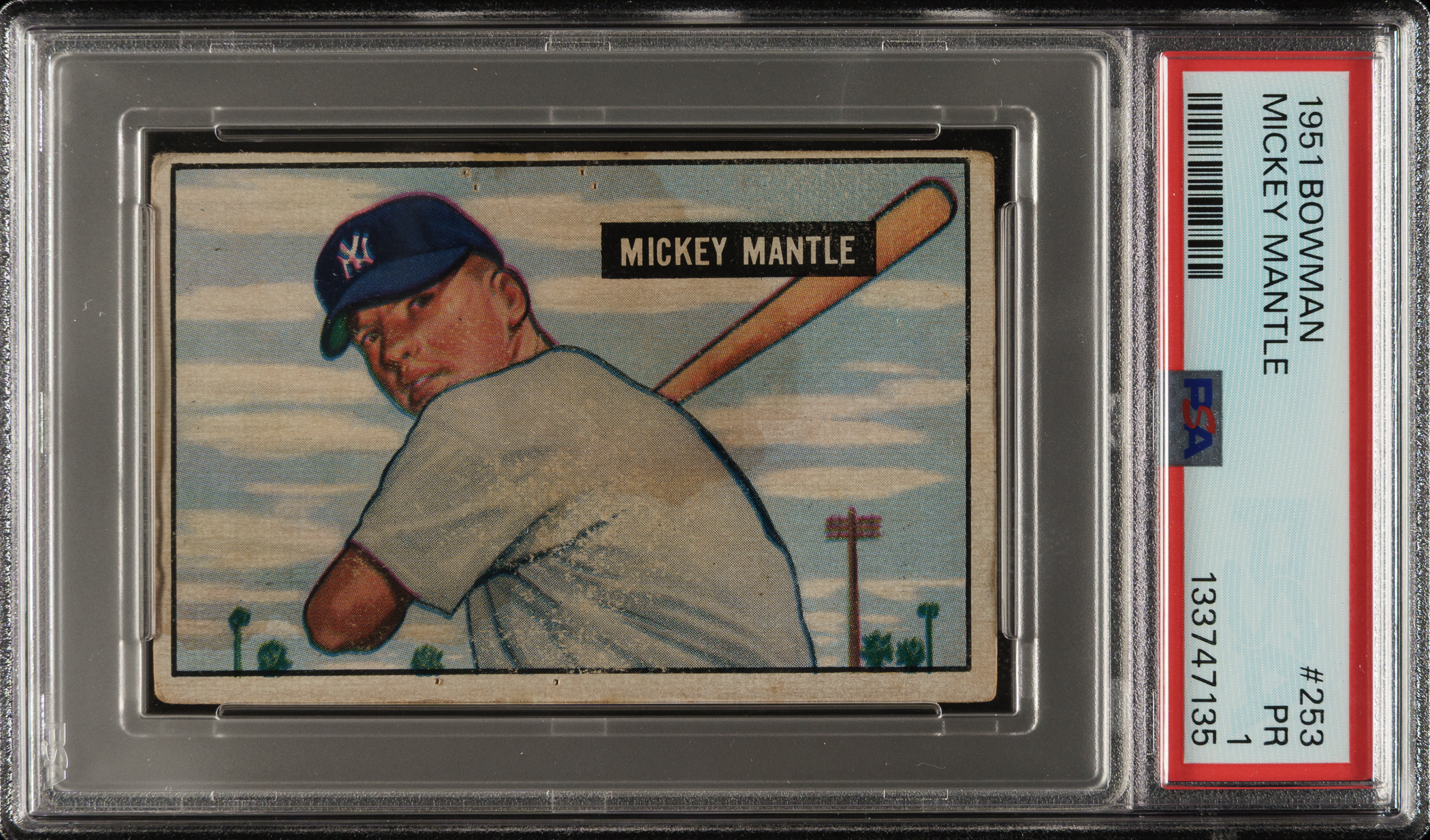 Classic example of New York Yankees Hall of Famer Mickey Mantle's true rookie card. Mantle's Bowman rookie card is the key to the 1951 set and one of the most popular of all postwar baseball cards. This well-centered card has a strong image of Mantle. Graded POOR 1 by PSA largely due to staining, surface wear, and multiple pinholes on the front. Despite these flaws, this remains a very presentable low-grade example of one of Mantle's most desirable and significant cards.