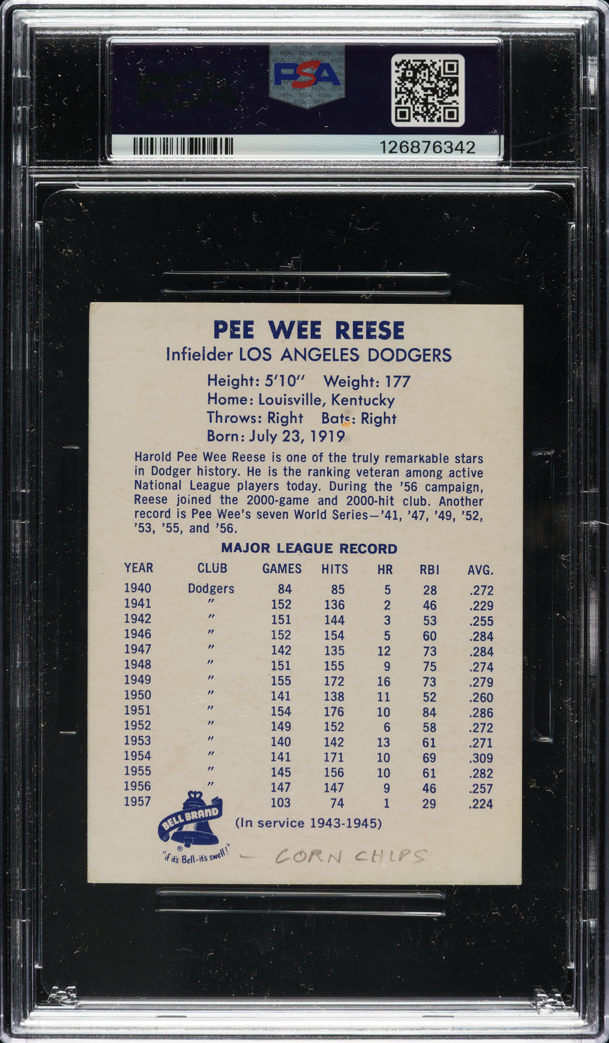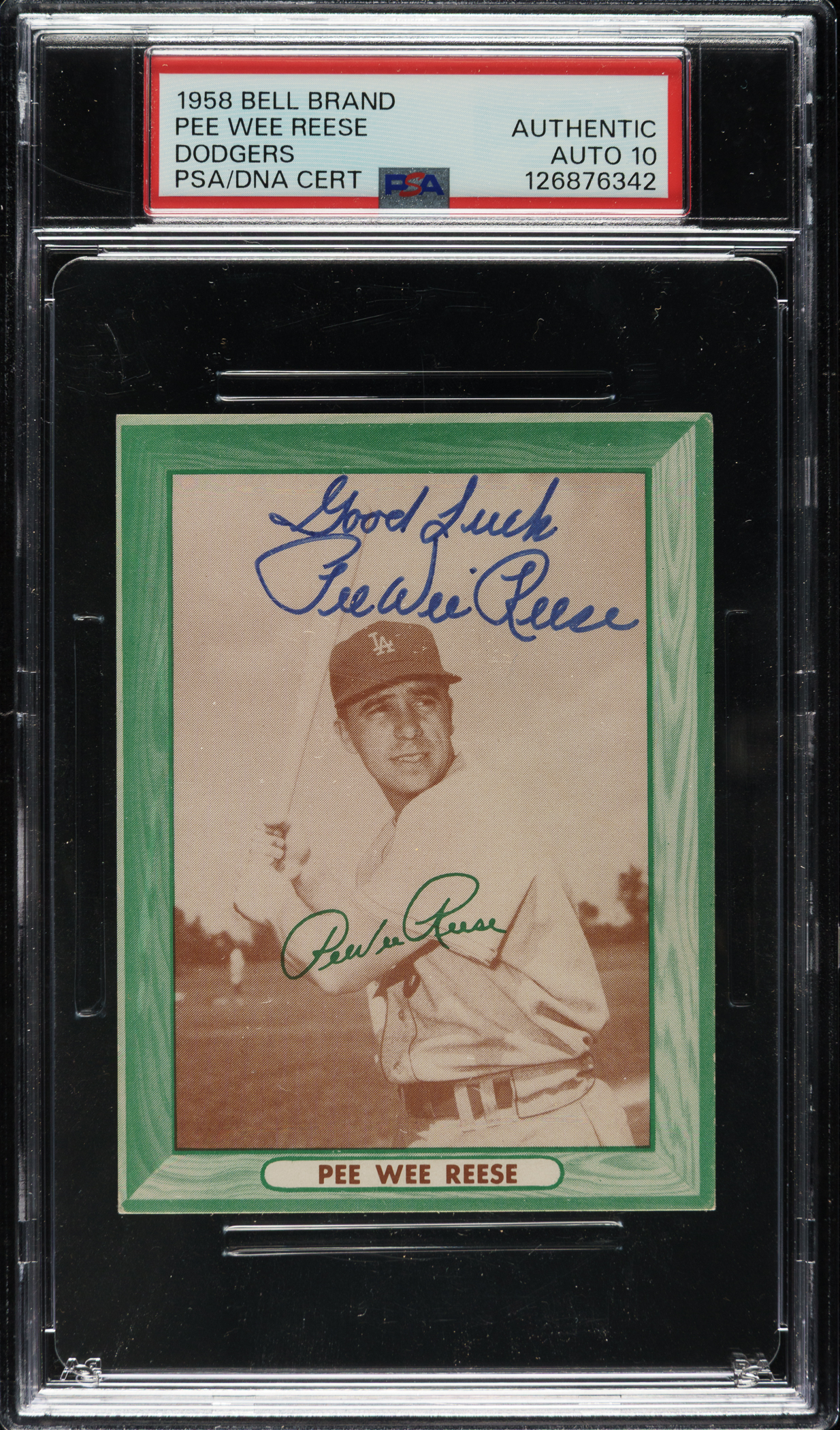 PSA/DNA has encapsulated the card, grading the signature GEM MINT 10. Los Angeles Dodgers Hall of Famer Pee Wee Reese.