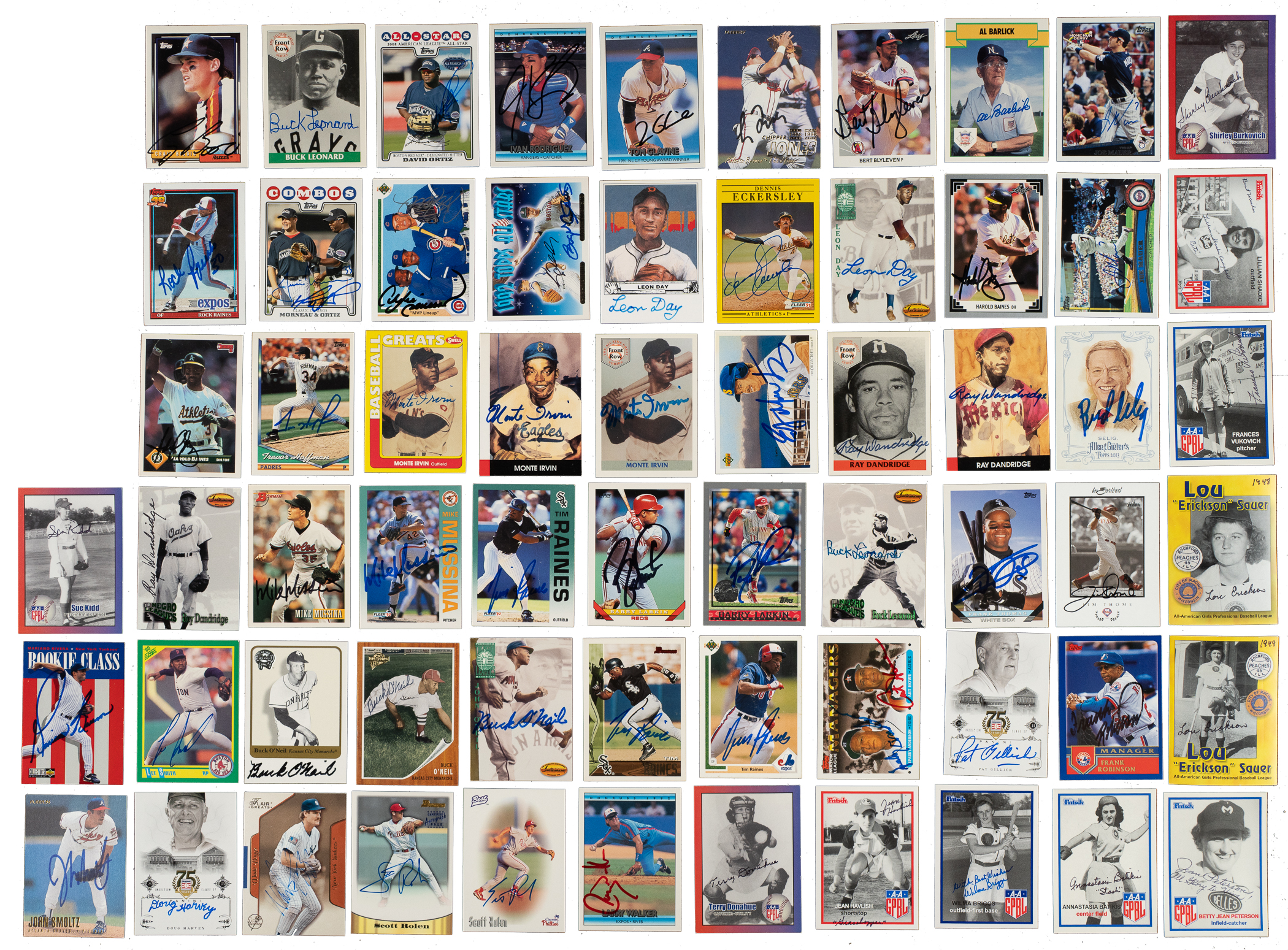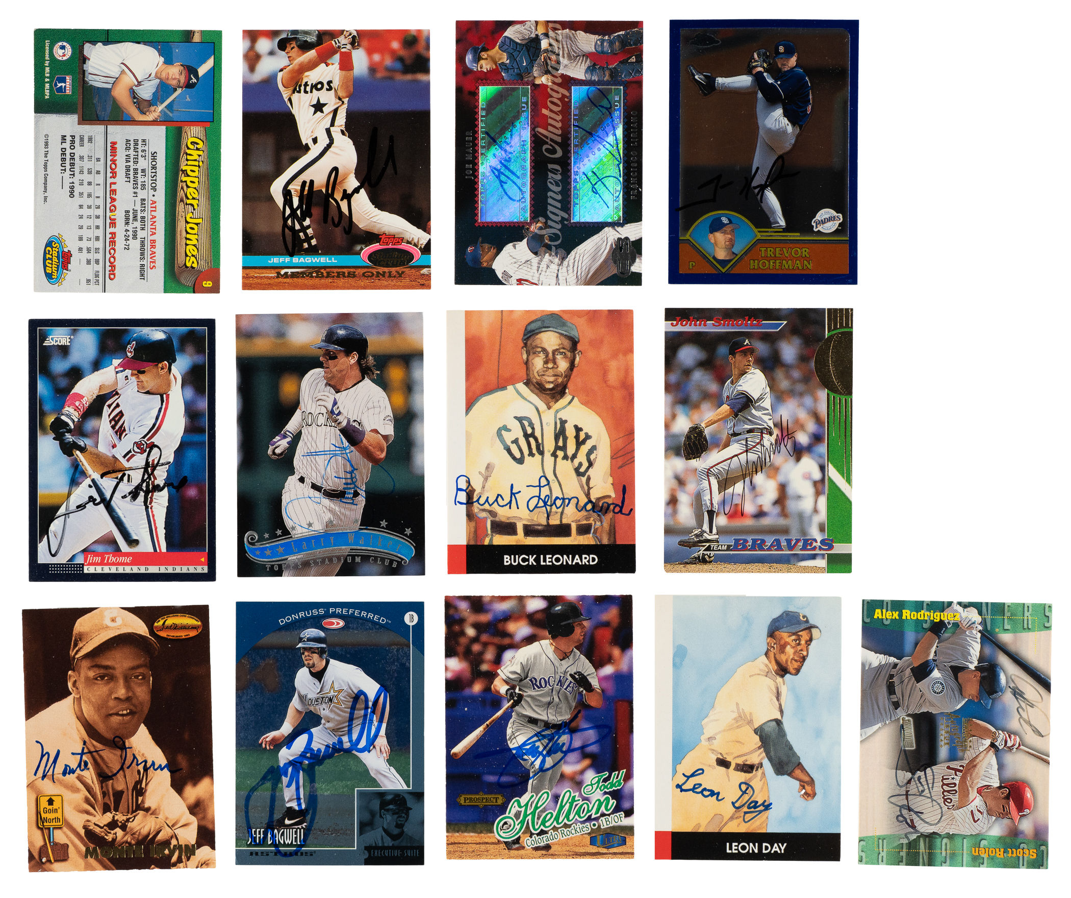 Presented is a sizeable collection of 80 baseball cards spanning the 1990s to 2000s, including 70 signed by members of the Baseball Hall of Fame. The signatures are scripted on the fronts in various inks. This collection is highlighted by numerous top-tier Hall of Famers, including Derek Jeter, Mariano Rivera, and Ken Griffey Jr. The condition ranges from Vg-Ex to Mint (averaging Ex-Mt), with 10% slightly lesser. This collection consists of the following: 1) 1992 Donruss Bonus Cards (1 card): #BC4 Glavine. 2) 1992 Donruss (1 card): #189 I. Rodriguez. 3) 1993 Bowman (1 card): #327 Rivera (Ex). 4) 1993 Topps Stadium Club Seattle Mariners (1 card): #1 Griffey Jr (Nr/Mt-Mt+). 5) 1993 Topps Stadium Club Atlanta Braves (1 card): #9 Jones. 6) 1996 Collector's Choice (1 card): #19 Rivera. 7) 1997 Fleer (1 card): #258 Jones. 8) 1997 Fleer Ultra Rookie Reflections (1 card): #5 Jeter (JSA Basic Certification with sticker on reverse, otherwise Nr/Mt). 9) 1998 Donruss Signature Series Autographs (1 card): Ortiz. 10) 2008 Topps Update & Highlights All-Stars (1 card): #UH264 Ortiz.. Also includes the following: Bagwell (2), Baines (2), Barlick, Biggio (JSA Basic Certification), Blyleven, Boggs, Dandridge (3), Day (3), Eckersley, P. Gillick (2014 Panini HOF autographed insert), D. Harvey (2014 Panini HOF autographed insert), Helton, Hoffman (2), Irvin (4), Larkin (2), Buck Leonard (3), E. Martinez, Mauer (2), Mussina (2), B. O'Neil (3), Raines (4), F. Robinson, Rolen (2), Selig, L. Smith, Smoltz (2), Thome (2), F. Thomas, and Walker (2). B) Multi-signed (6): S. Anderson/Howe, Dawson/Sandberg, Maddux/Clemens, Mauer/Liriano (2006 Topps Co-Signers autographed insert), Morneau/Ortiz, and A. Rodriguez/Rolen. C) All-American Girls Professional Baseball League (11 cards): Batikis, Briggs, Burkovich, Donahue, two Erickson, Havlish, Kidd, Peterson ("All Glory to Him!" inscription), Shadic, and Vukovich. Total: 80 signed cards. Auction LOA from James Spence/JSA.