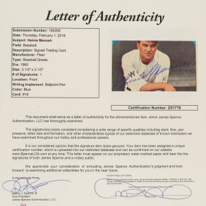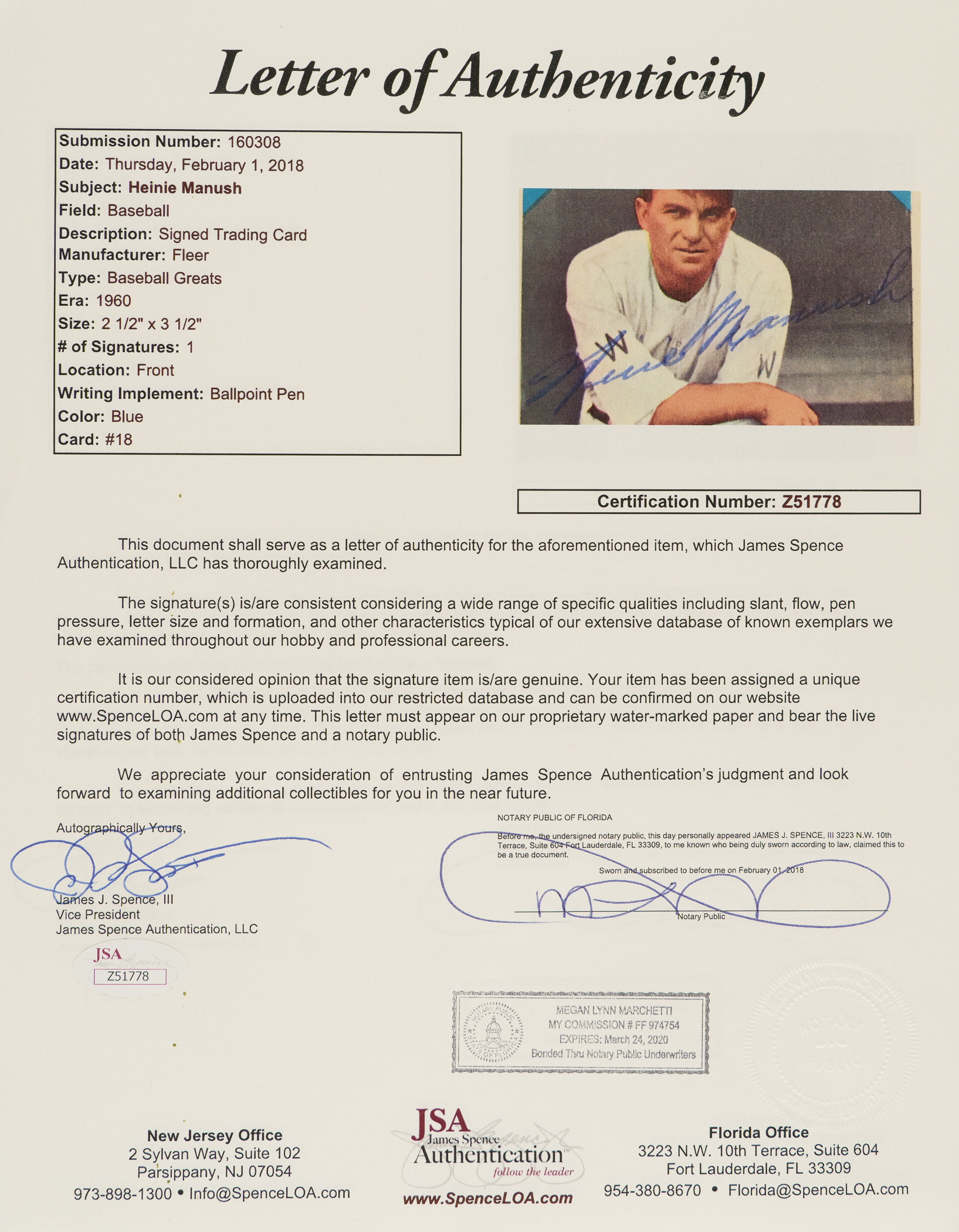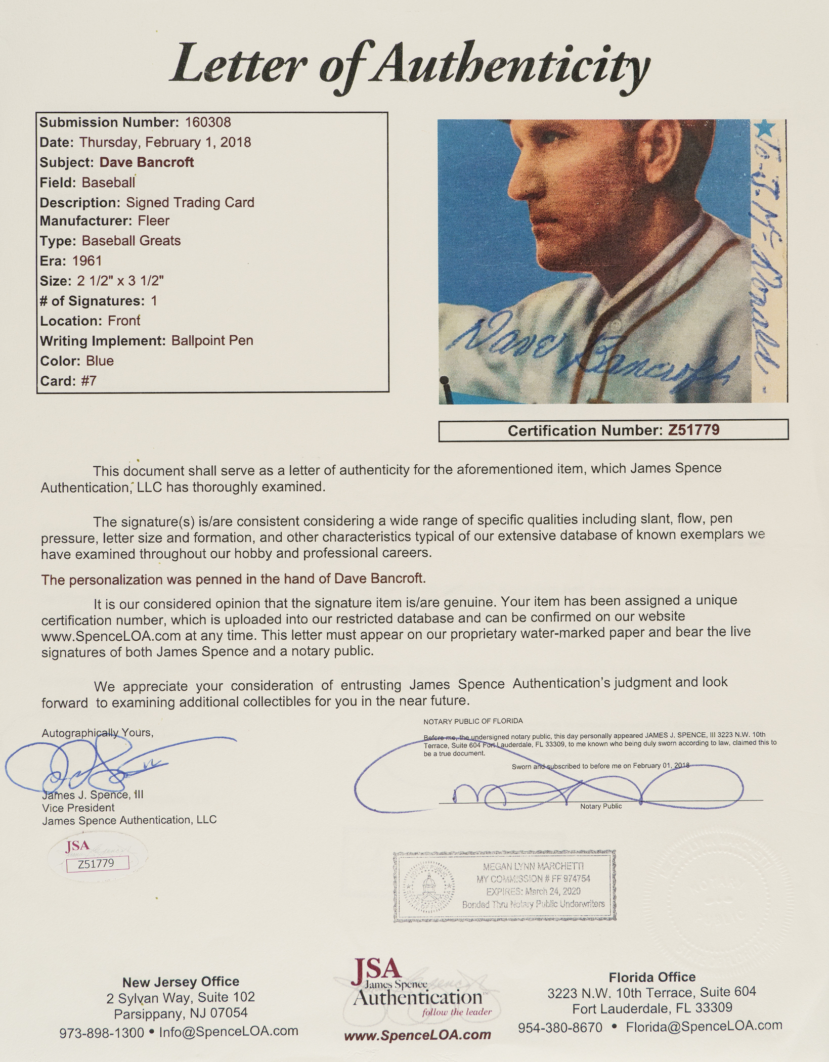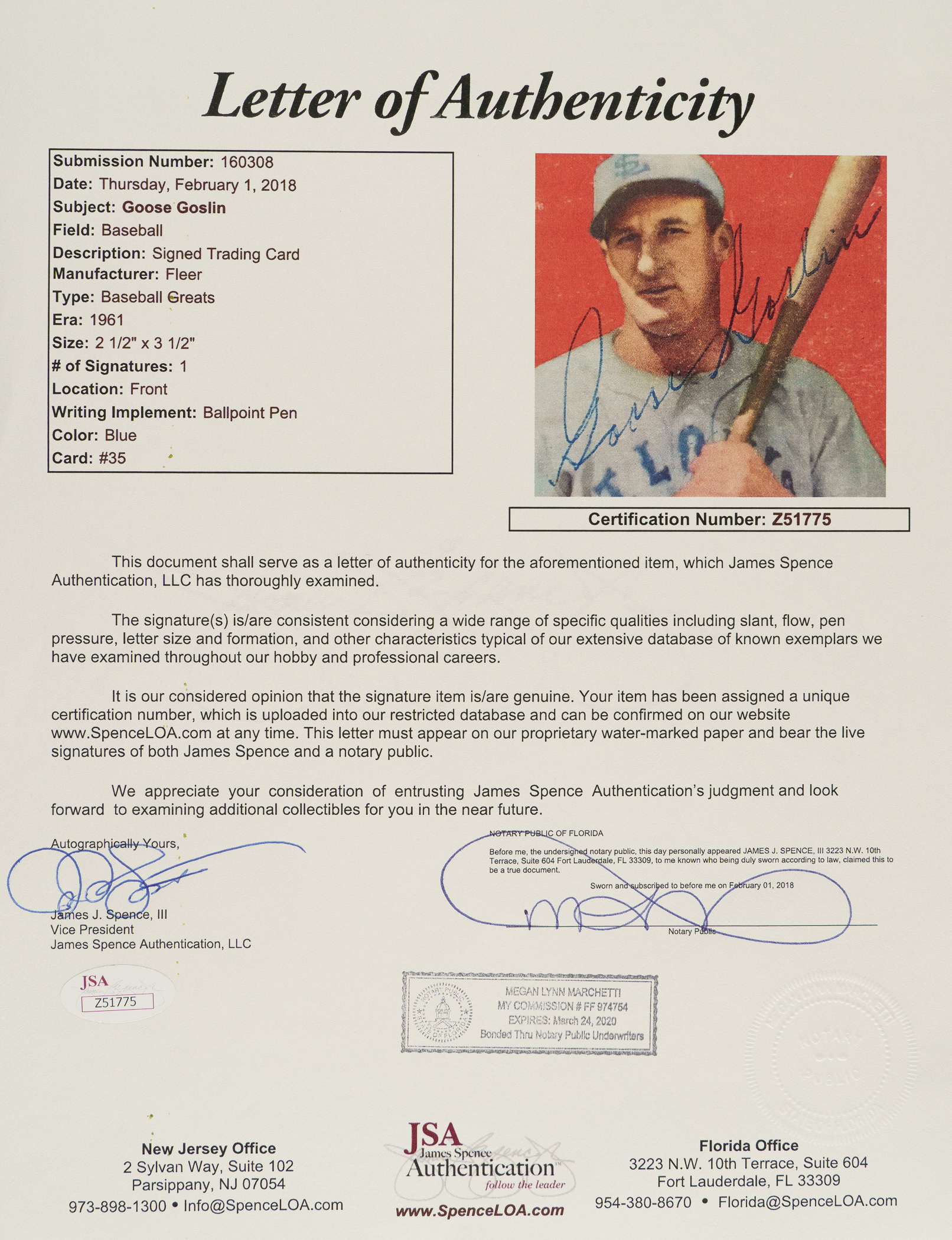 Collection of 20 signed 1960 and 1961 Fleer All-Time Greats Hall of Fame cards highlighted by Dave Bancroft, Goose Goslin, Heinie Manush, Frank Frisch, Zach Wheat, and Sam Rice. This collection consists of the following: 1) 1960 Fleer All-Time Greats (9 cards): Condition is two Ex, Vg-Ex, three Vg, Gd, and two lesser. Includes: #13 Sisler, 17 Lombardi, 18 Manush (full LOA from JSA), 34 Rice, 59 Grimes, 68 Newhouser, 69 Hoyt, 73 Giles, and 78 L. Waner. 2) 1961 Fleer All-Time Greats (11 cards): #7 Bancroft (personalized, measures small, otherwise Ex; full LOA from JSA), 12 Carey (Fr), 30 Frisch ("The Old Flash" notation, Fr), 33 Giles (laminated front and back), 35 Goslin (Vg, full LOA from JSA), 38 Grove (trimmed and back damage), 40 Haines ("St. Louis Cardinals 1920-1937" notation, Vg), 41 Hartnett (Vg-Ex), 72 Roush (Gd), 86 Wheat (Gd), and 100 Coveleski (Vg). Total: 20 signed cards. Auction LOA from James Spence/JSA.
