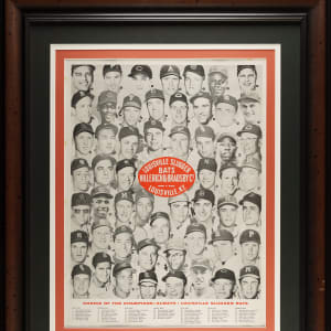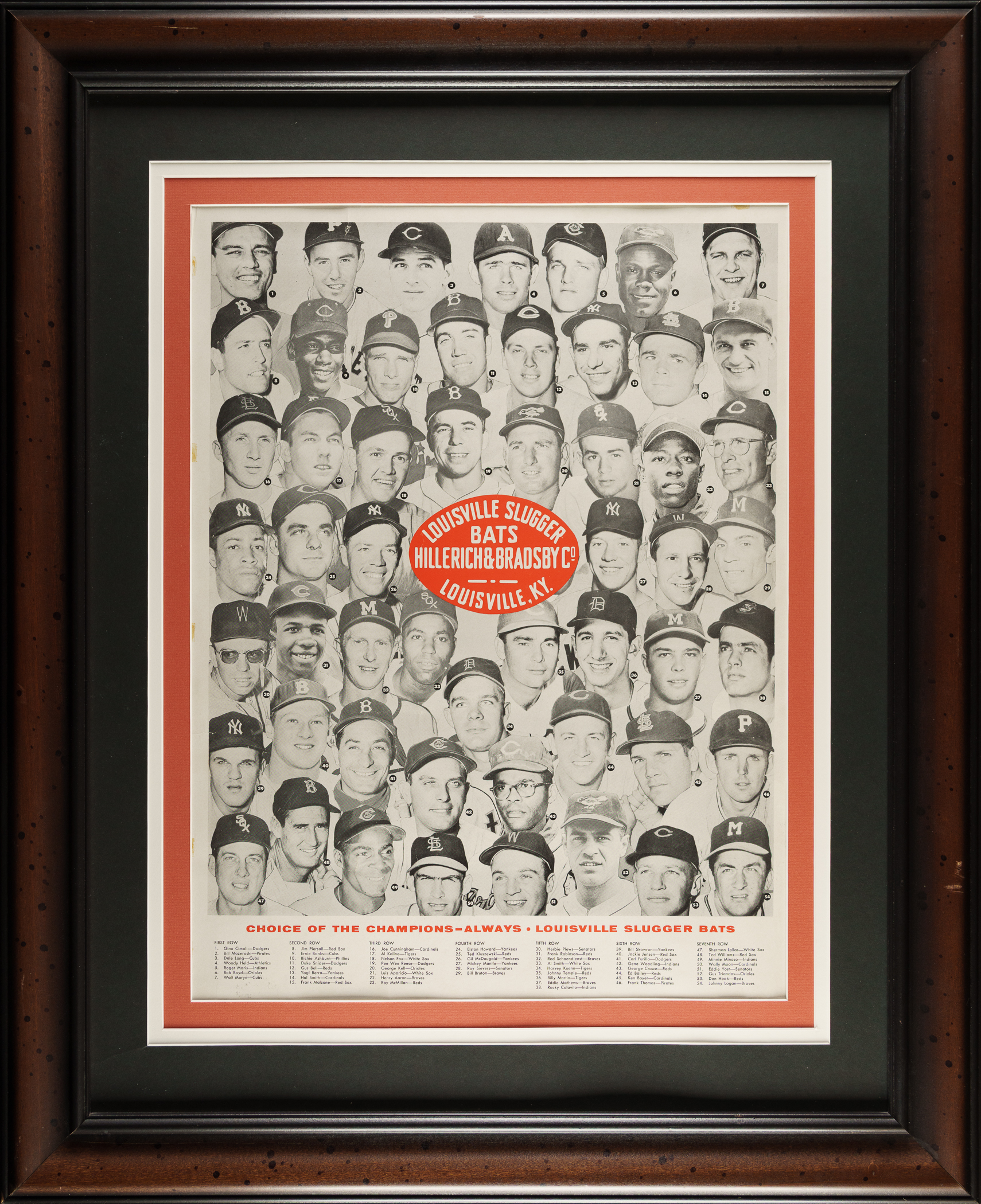 This exceedingly rare H&B retail-store display poster showcases the many major league stars who use Louisville Slugger bats — and what a lineup it is! A total of 54 players are pictured here, most of whom are still as well known today as they were in 1958. The 16 Hall of Famers represented are Mickey Mantle, Ted Williams, Hank Aaron, Ernie Banks, Frank Robinson, Duke Snider, Pee Wee Reese, Yogi Berra, Eddie Mathews, Al Kaline, Bill Mazeroski, Richie Ashburn, Nellie Fox, George Kell, Luis Aparicio, and Red Schoendienst. Other notables including Roger Maris, Billy Martin, Minnie Minoso, Ken Boyer, Carl Furillo, Jackie Jensen, Rocky Colavito, Roy Sievers, Ted Kluszewski, Elston Howard, Jimmy Piersall, and Dale Long. The H&B trademark logo appears in the center of the poster, while the caption along the base reads "Choice of the Champions - Always Louisville Slugger Bats." Each player is identified in print along the base by means of a corresponding number next to his image.