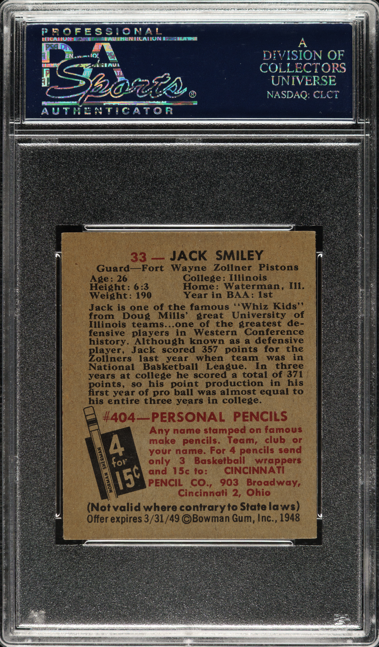Graded NM 7 by PSA. Fort Wayne Zollner Pistons.