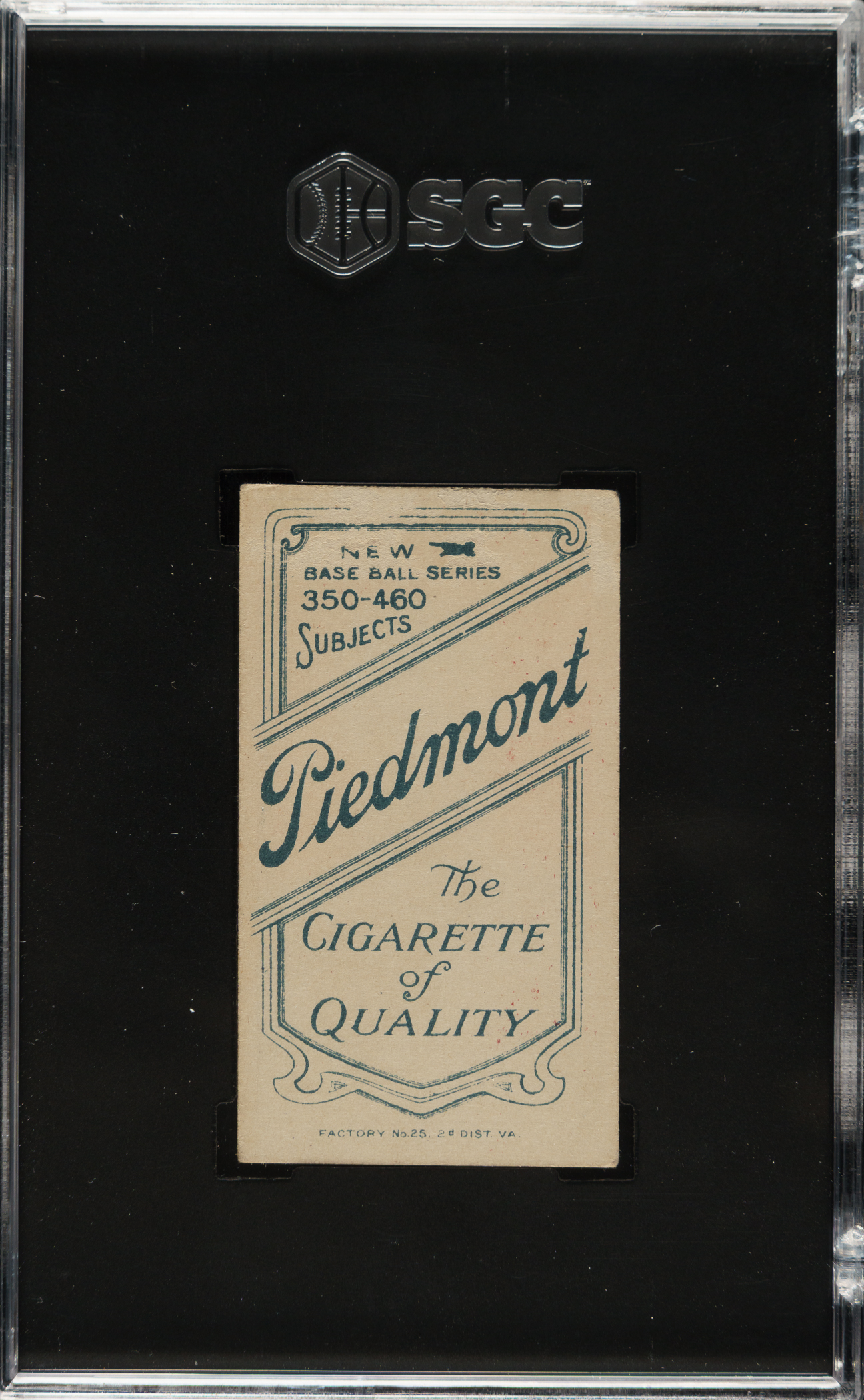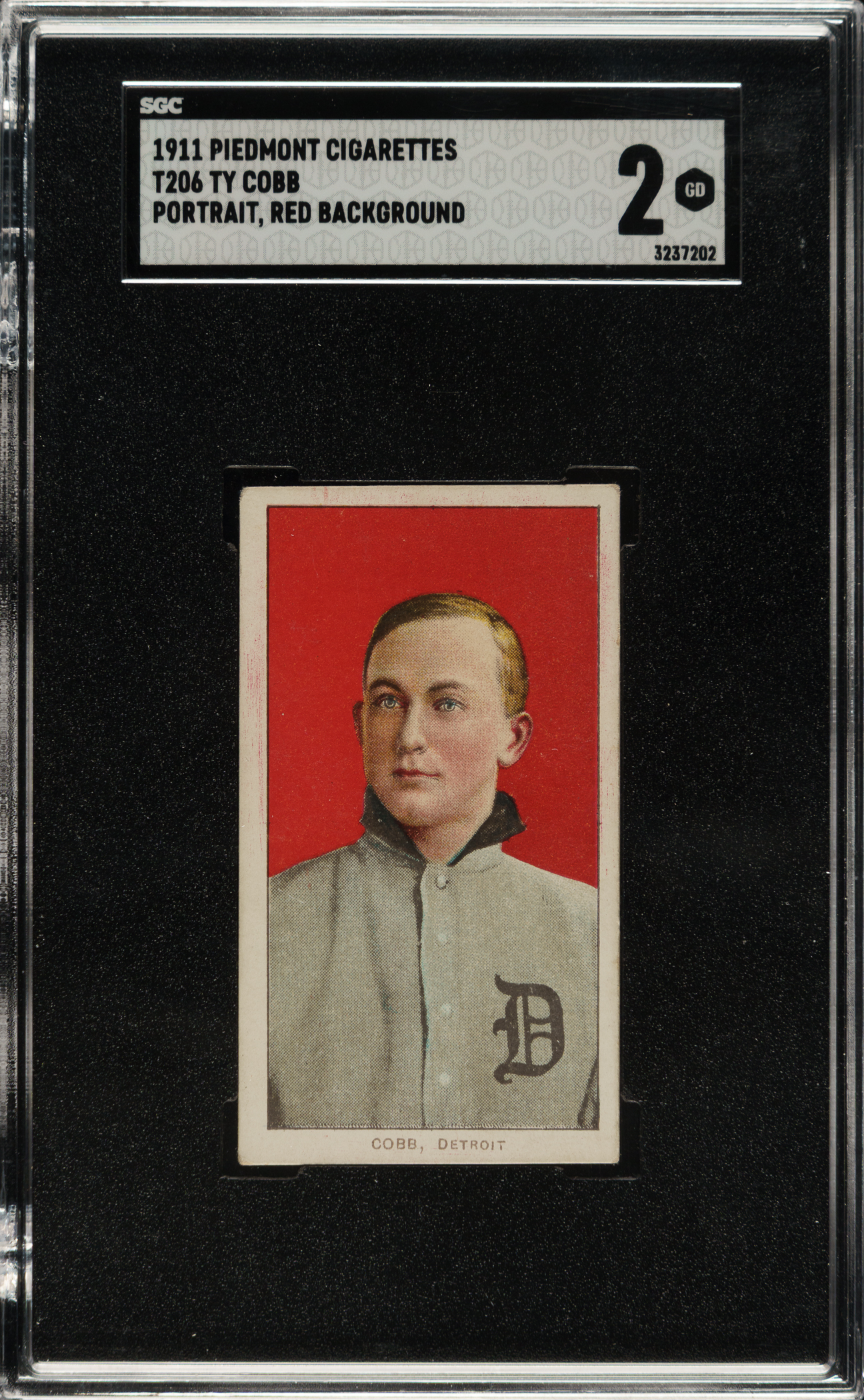 Graded GOOD 2 by SGC (submitted by REA). Attractive mid-grade example of this classic tobacco card of Hall of Famer Ty Cobb from the popular T206 White Border series. Cobb's red-background portrait pose is one of the key cards in the set and one of the most recognizable of all prewar-era tobacco cards. This example displays a bright red background, crisp image, light corner wear, and centering toward the right. The Piedmont 350-460 advertising reverse is boldly printed. Spots of surface wear on the reverse largely account for the assigned grade. This is a pleasing example of one of the key cards from the premier tobacco issue of the 1910 era.