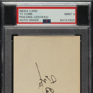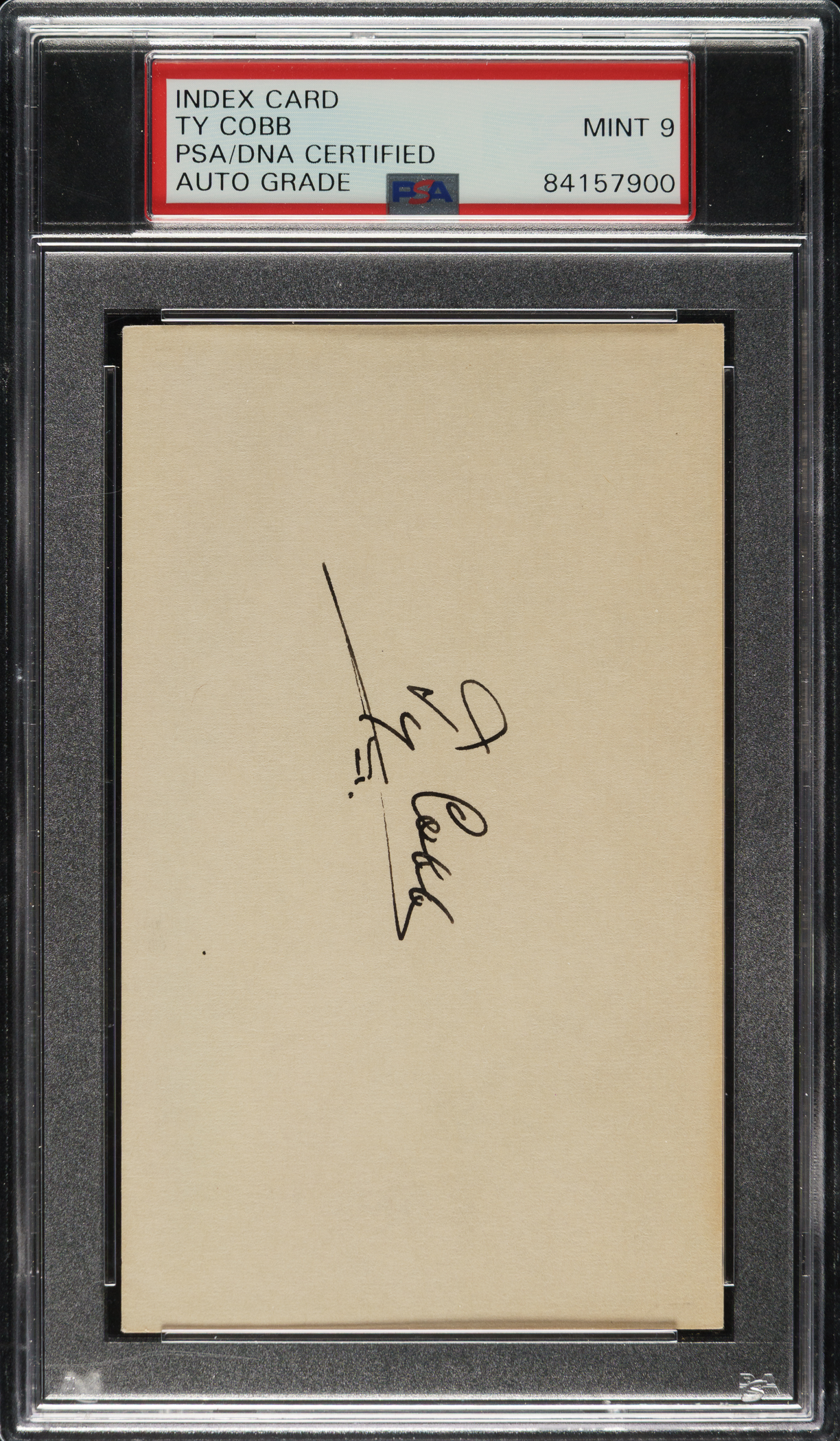 Index card signed by Detroit Tigers Hall of Famer Ty Cobb in black ink. Encapsulated by PSA/DNA, with the signature graded MINT 9. The card remains in Excellent condition overall.