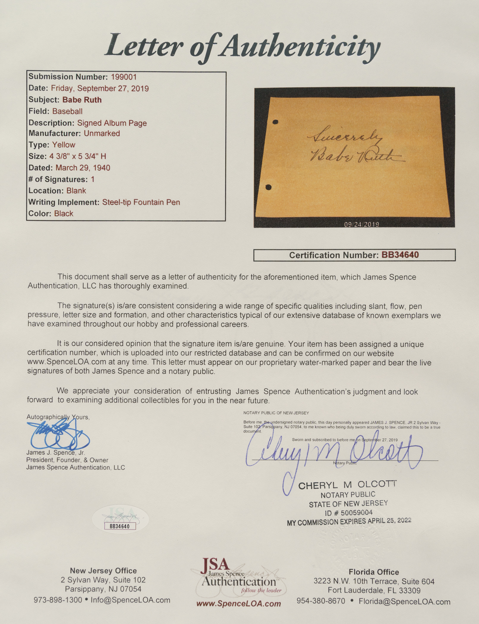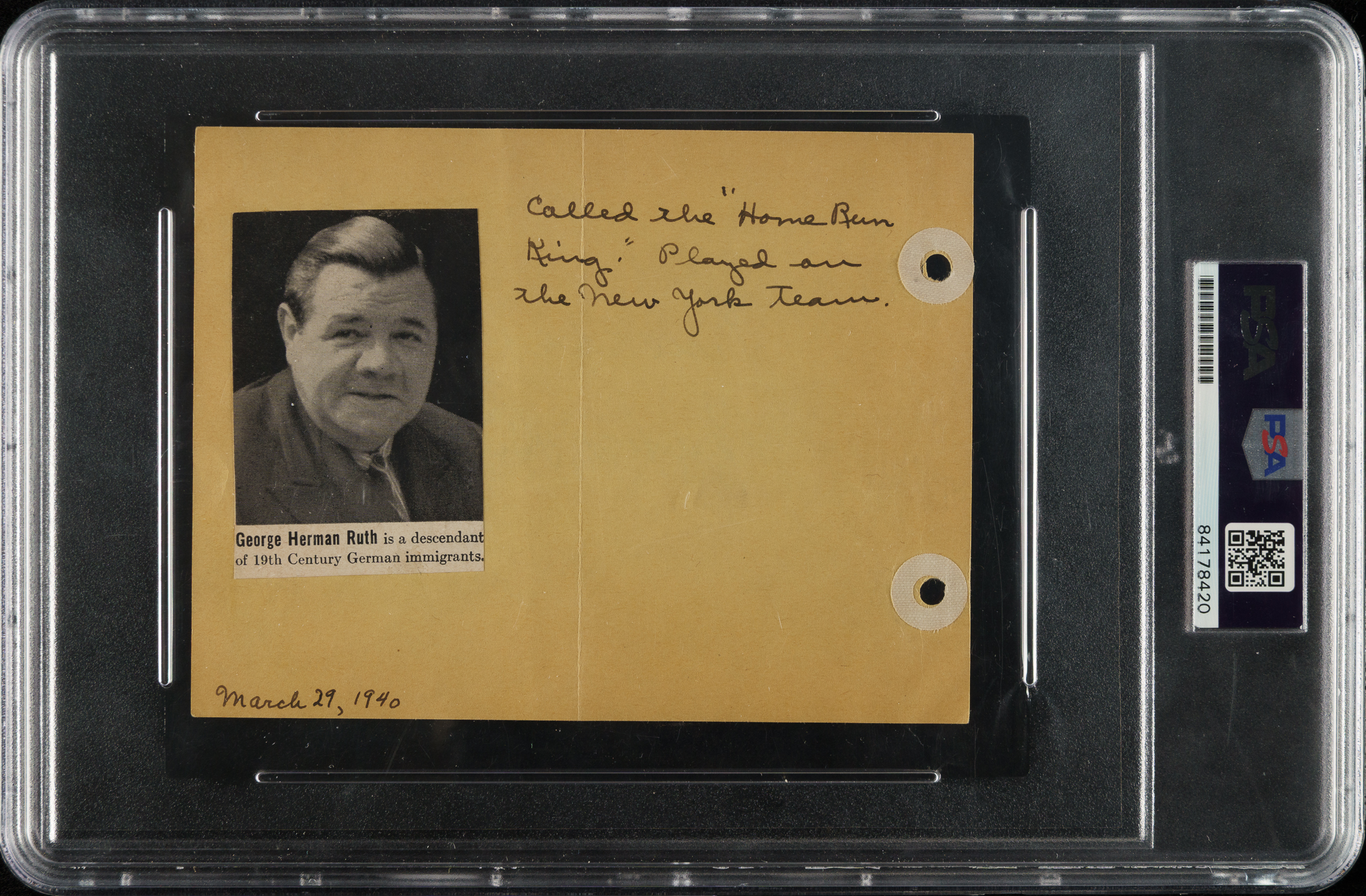 Vintage autograph album page signed by Babe Ruth in black fountain pen. PSA/DNA has encapsulated the page and graded the signature MINT 9. The reverse is dated "March 29, 1940" and features the notation "Called the 'Home Run King.' Played for the New York Team." A portrait photo of Ruth is also affixed to the reverse. The page (4-3/8 x 5-3/4 inches), which displays a vertical fold, is otherwise in Excellent condition overall. Full LOA from James Spence/JSA.