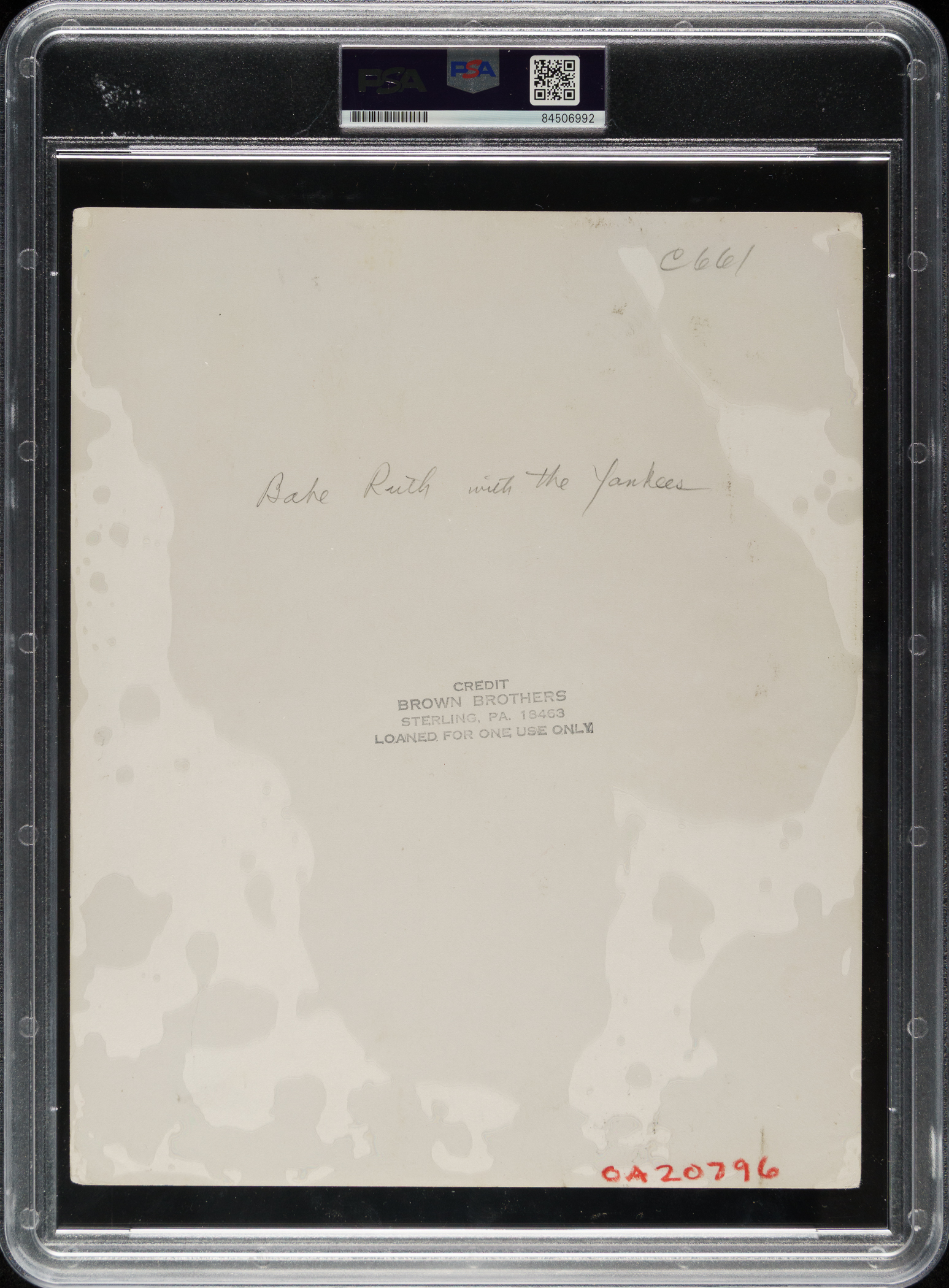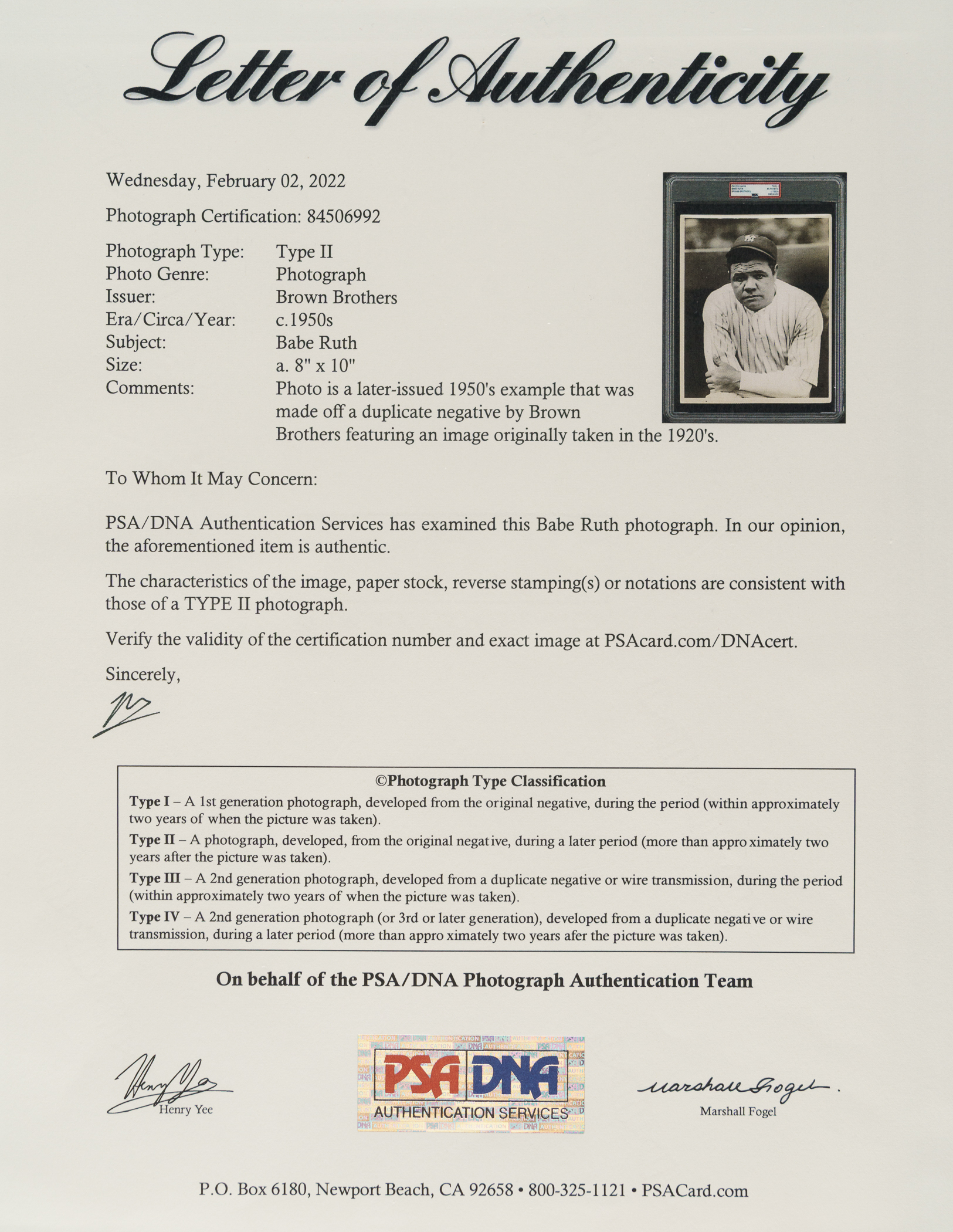 Original photo of Babe Ruth as a member of the New York Yankees. Encapsulated and certified as an original Type II photograph by PSA/DNA. Per PSA/DNA, "Photo is a later-issued 1950's example that was made off a duplicate negative by Brown Brothers featuring an image originally taken in the 1920's." The photo captures Ruth staring pensively into the camera. The reverse features a "Brown Brothers" credit stamp and a few handwritten editorial notations. The photo (8 x 10 inches) displays moderate corner wear and several small creases. Very Good condition overall. Full LOA from PSA/DNA.