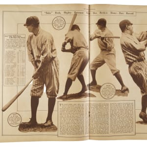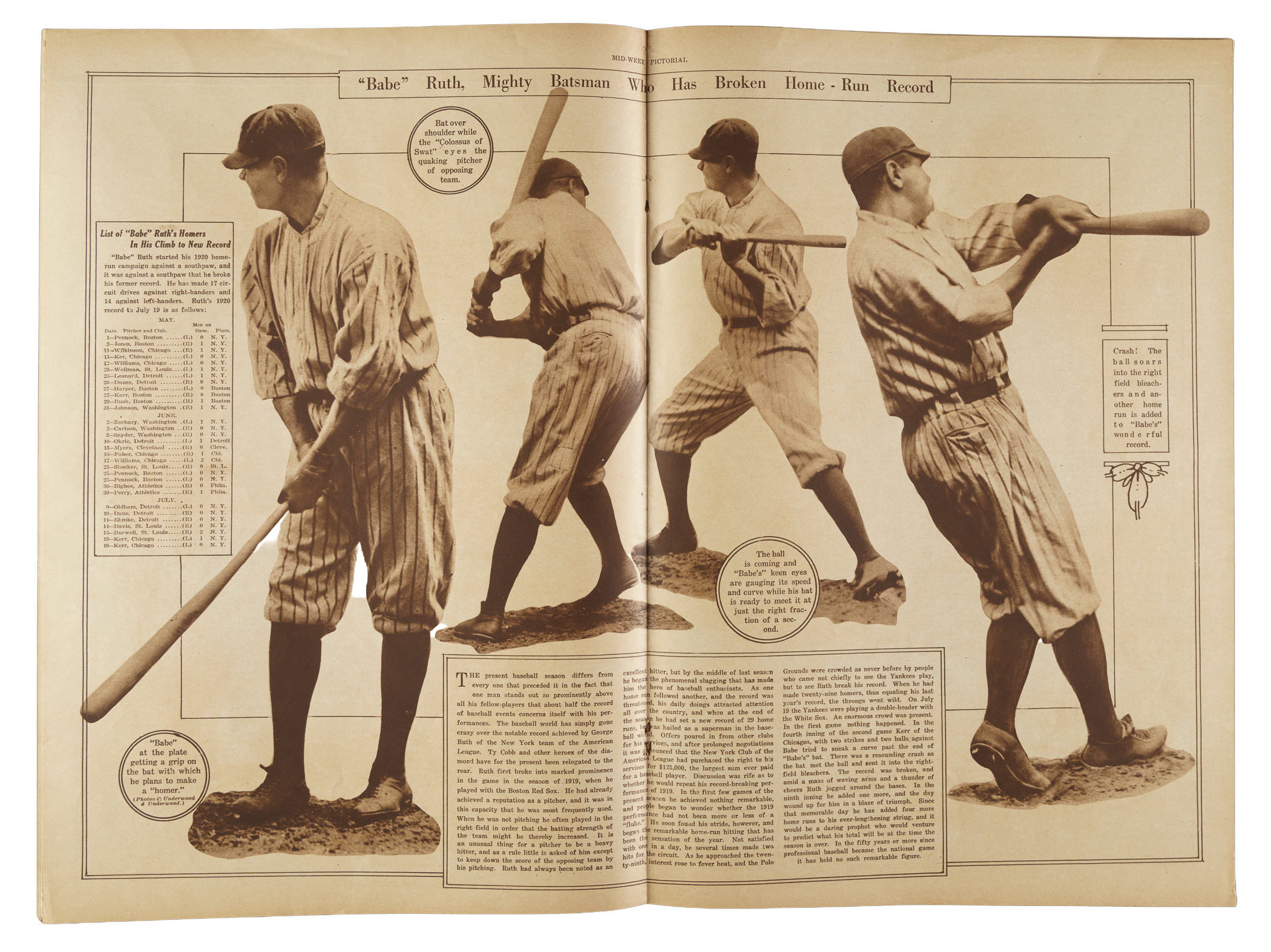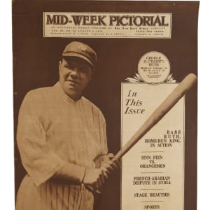 Between the years 1914 and 1937, The New York Times published a Mid-Week Pictorial every Wednesday that was, as the title suggested, filled mainly with photographs. Naturally, New York's biggest sports star, Babe Ruth, was featured often in the publication's pages over the years, as well as the cover. Presented is The New York Times Mid Week-Pictorial magazine (16 x 11 inches) featuring Babe Ruth dating to August 5, 1920. The magazine has light creases and edge wear. In Good condition overall. The size/weight of this item requires that there will be an additional shipping charge for this lot.