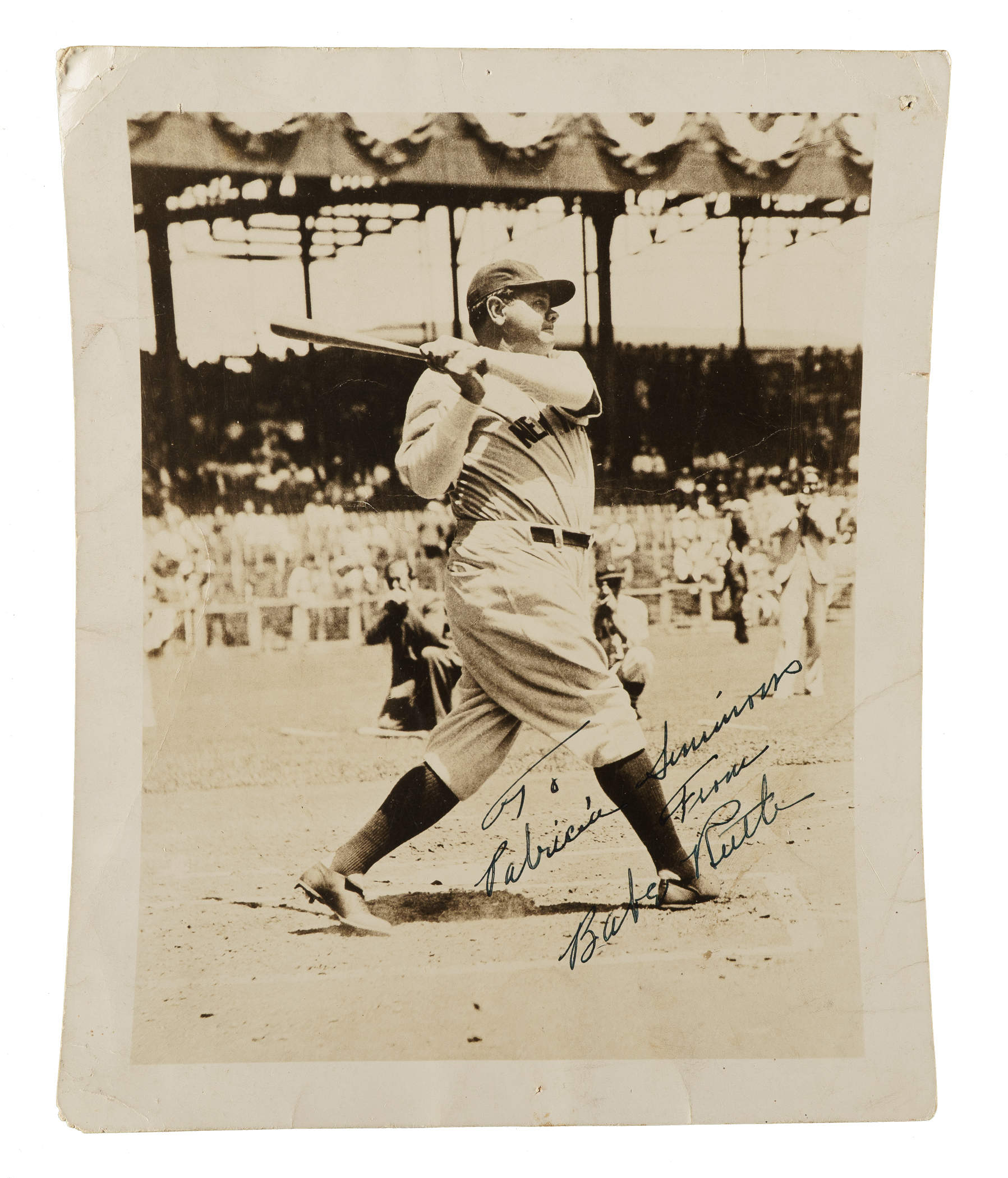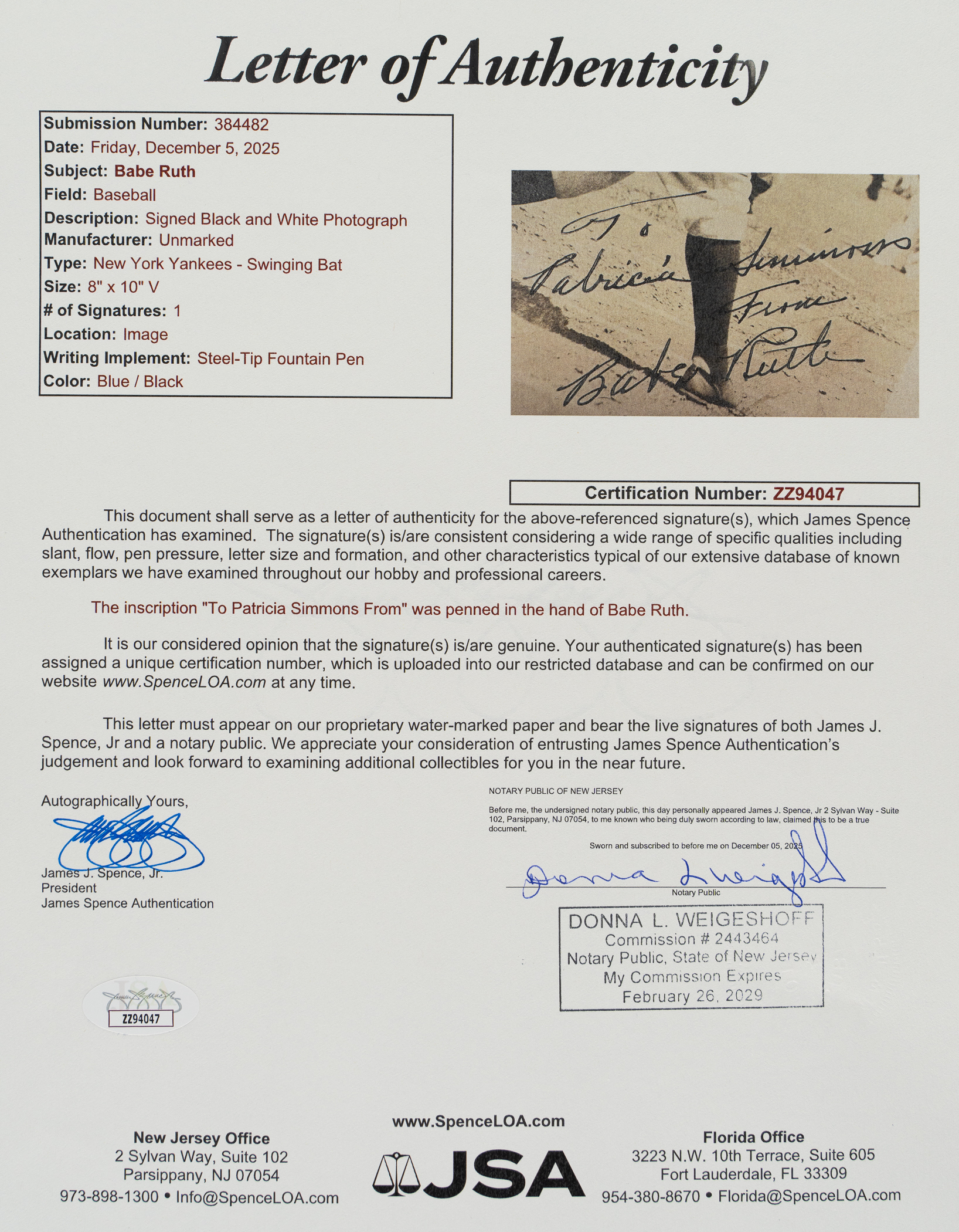 Photo of Babe Ruth as a member of the New York Yankees, inscribed in black fountain pen: "To/Patricia Simmons/From/Babe Ruth." Both the inscription and signature are boldly penned. The image itself is also appealing and pictures Ruth in full swing while taking batting practice on the field. In the background, one can see a number of photographers, as well as a Yankee player, as they attempt to capture the moment on film. This particular photo was obviously to Ruth's liking, as he often used it when providing autographs to his fans. The photo (8 x 10 inches) displays heavy creasing and four tack holes along the borders. In Poor condition. Full LOA from James Spence/JSA.