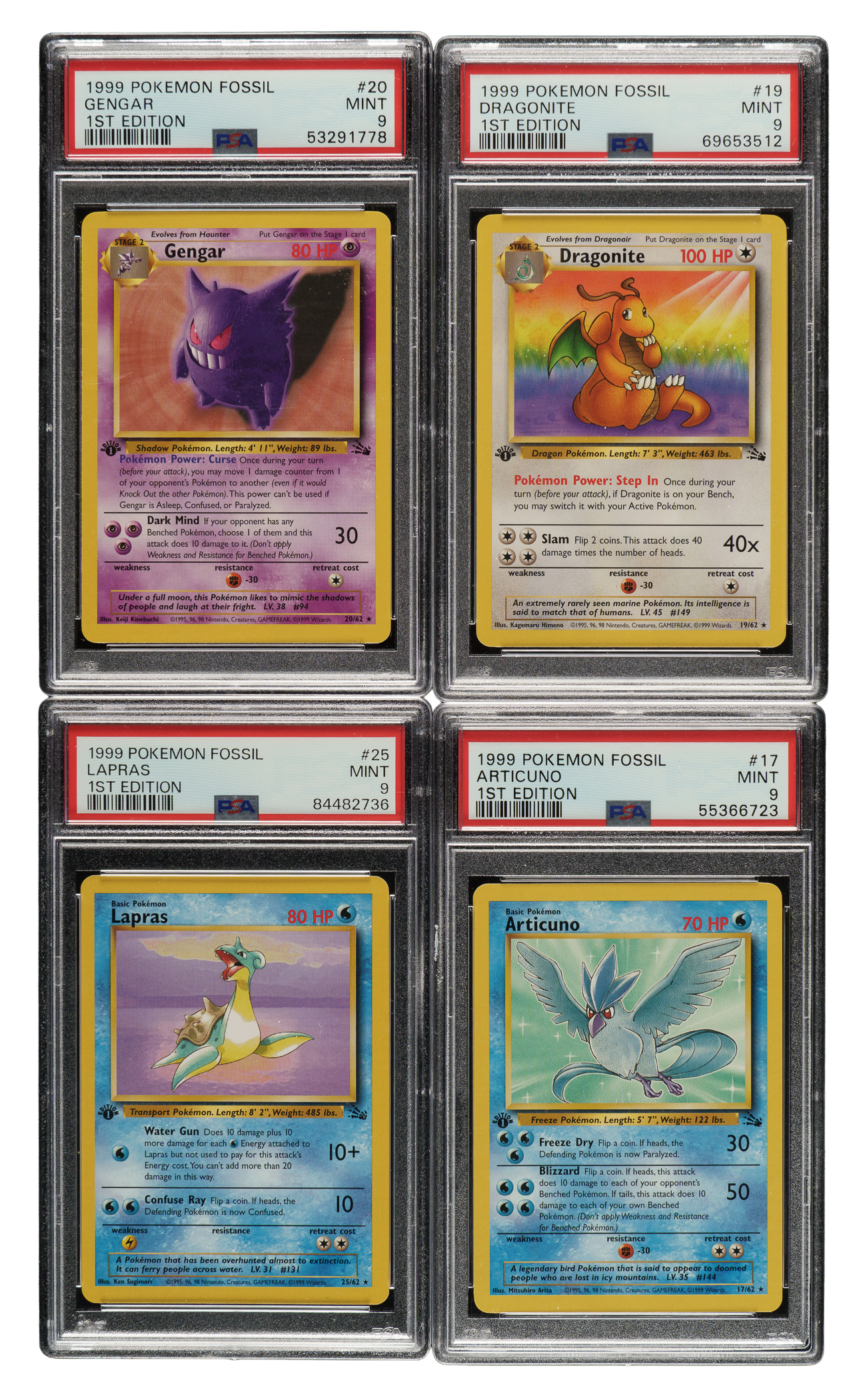 Offered is an ultra high-grade near-complete set (47 of 62 cards) of 1999 Pokemon Fossil 1st Edition, entirely graded and encapsulated GEM MINT 10 and MINT 9 by PSA. Only cards #1-15 (holographic Pokemon) are missing for completion. The Fossil set is particularly significant in the Pokemon community as it represents the third and final series released by Wizards of the Coast in 1999, following the Base and Jungle sets, that combine to feature the original 151 Pokemon. All 47 cards have been professionally graded and encapsulated by PSA. PSA Grading Composite: GEM MINT 10 (31 cards): 31, 32, 33, 34, 35, 36, 37, 38, 39, 40, 41, 42, 43, 44, 45, 46, 47, 48, 49, 51, 52, 53, 54, 55, 56, 57,58, 59, 60, 61, and 62. MINT 9 (16 cards): #16, 17, 18, 19, 20, 21, 22, 23, 24, 25, 26, 27, 28, 29, 30, and 50. Total 47 cards.