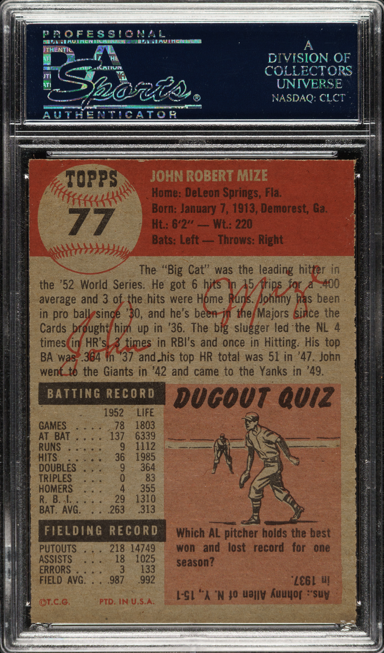 Graded EX 5 by PSA. New York Yankees Hall of Famer Johnny Mize.