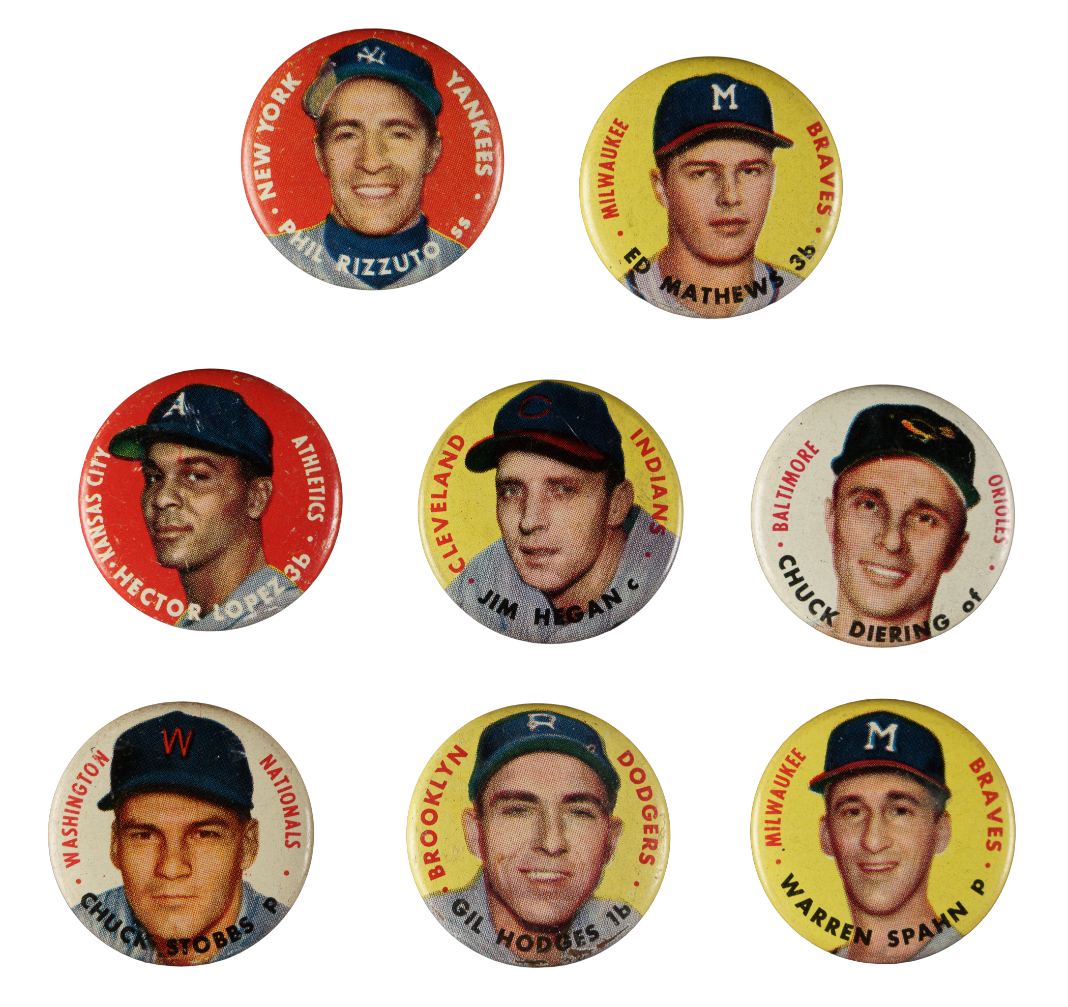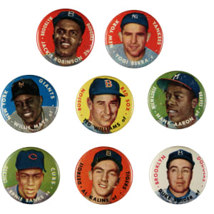 Presented is a complete set of 1956 Topps Pins. This rare and very colorful pin set was one of Topps' first specialty issues. Included are all the great stars of the era, such as Hank Aaron, Jackie Robinson, Ted Williams, etc. Each pin measures 1-1/8 inches in diameter and features the same player portraits used in the 1956 Topps card set. These pins were sold separately from the cards, packaged in small boxes with gum. The condition of the set ranges from Ex to Nr/Mt overall, with a few slightly lesser. 1956 Topps pins have long been overlooked and because of grading are now just beginning to receive the attention that they deserve. High-grade examples of 1956 Topps pins are particularly rare because like all litho pins (as opposed to celluloid pins), they are extremely condition-sensitive. Litho pins are very susceptible to scratches because their designs are printed directly onto the metal, as opposed to being printed on paper and encased under protective celluloid, as is the case with celluloid pinbacks. Compared to card issues of the 1950s, a strong case can be made that 1956 Topps pins, which are among the rarest and most overlooked of all significant Topps issues, are also one of the most outstanding values for collectors. This is an extremely attractive, bright, clean, and overall high-grade set. Total: 60 pins.